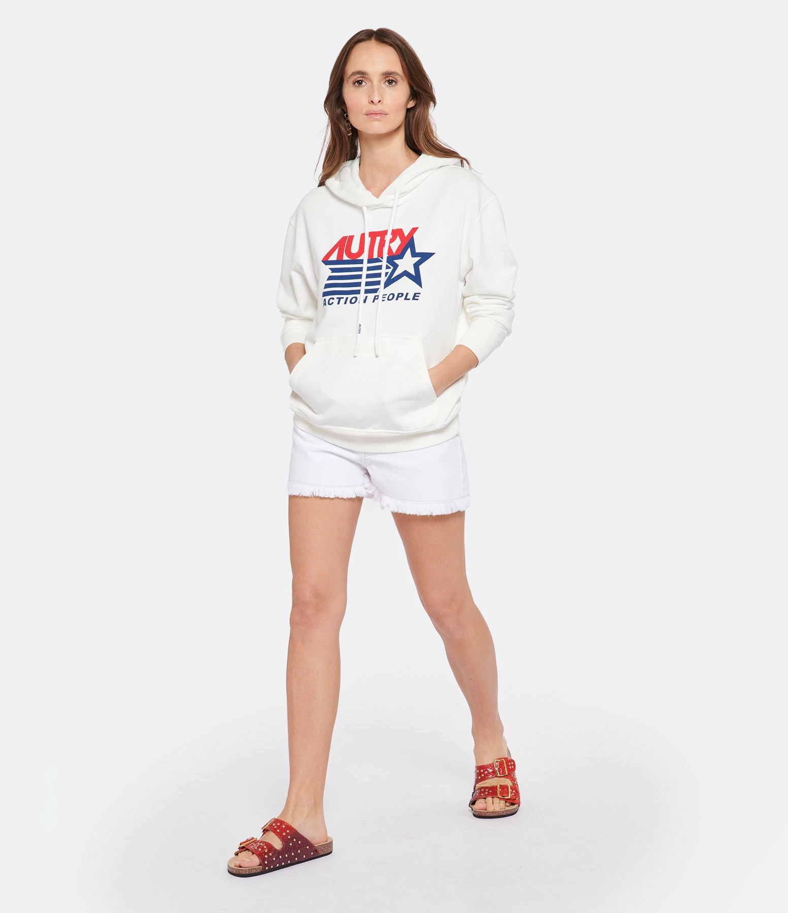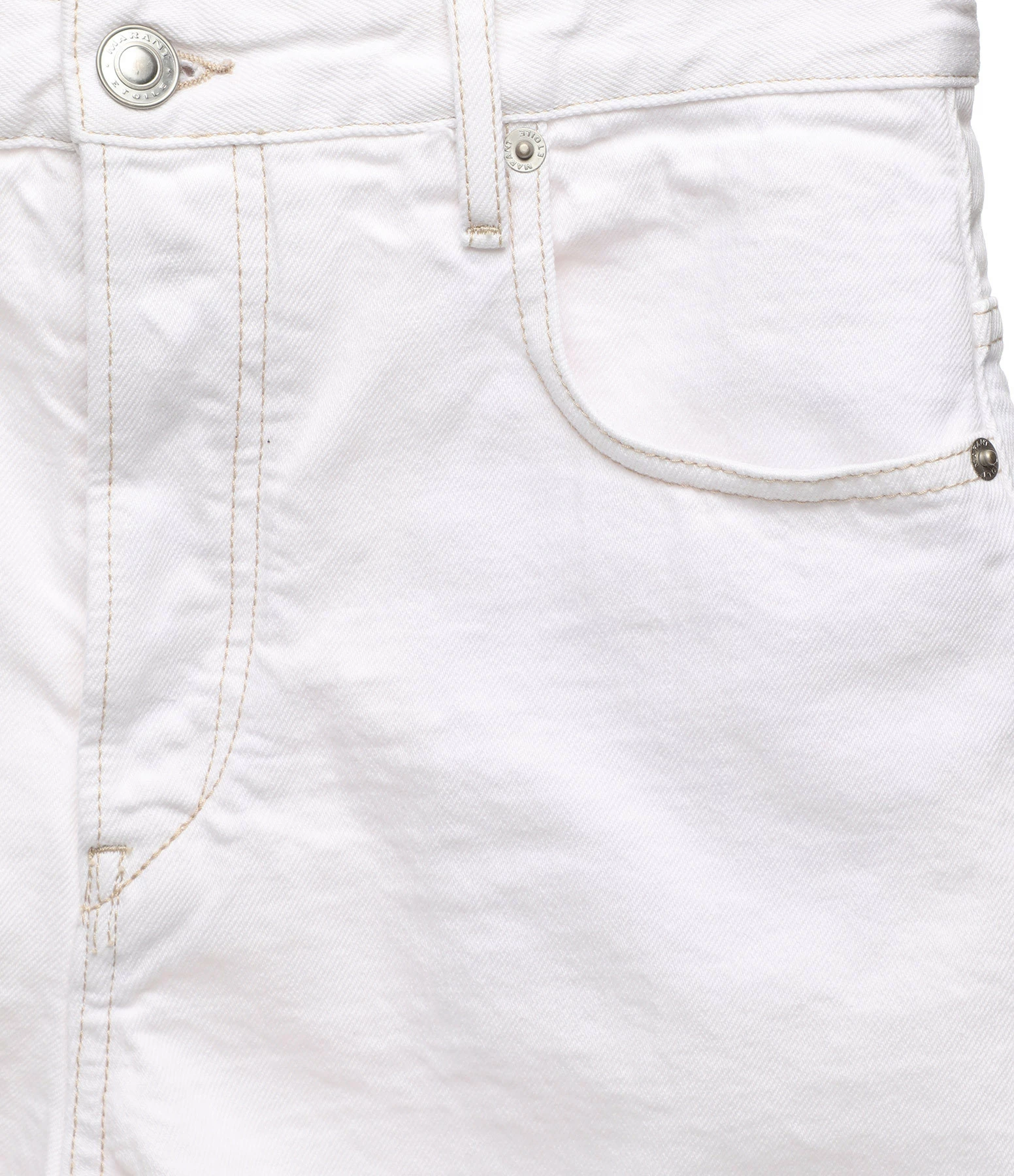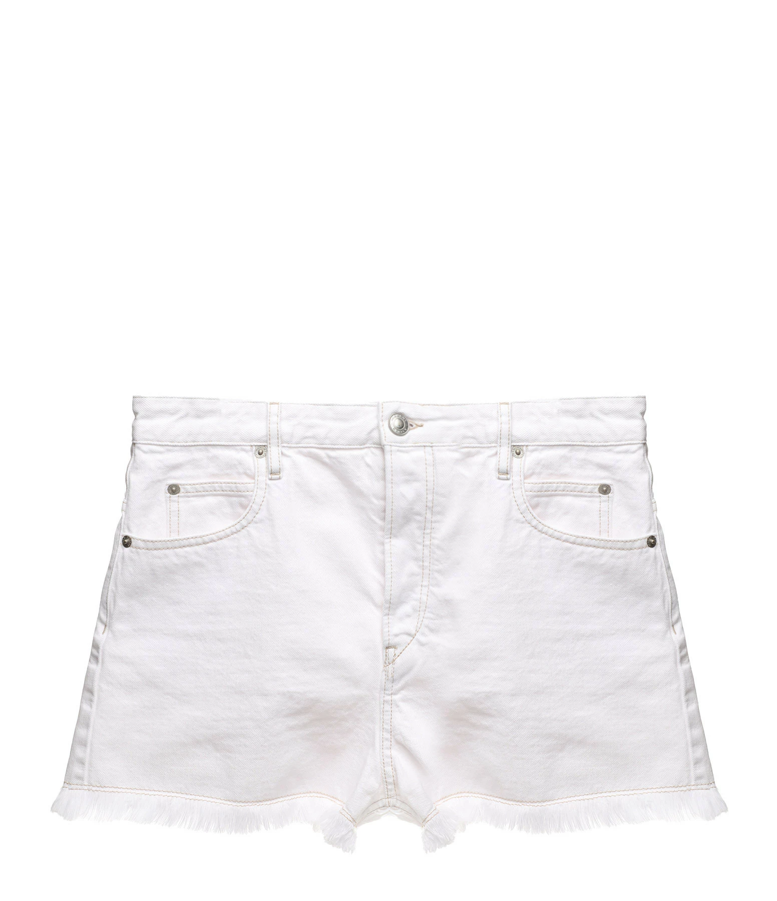 Short en denim de coton blanc. Base coupée à cru et effilochée. Cinq poches. Fermeture par boutons métalliques gravés du logo. Taille haute.