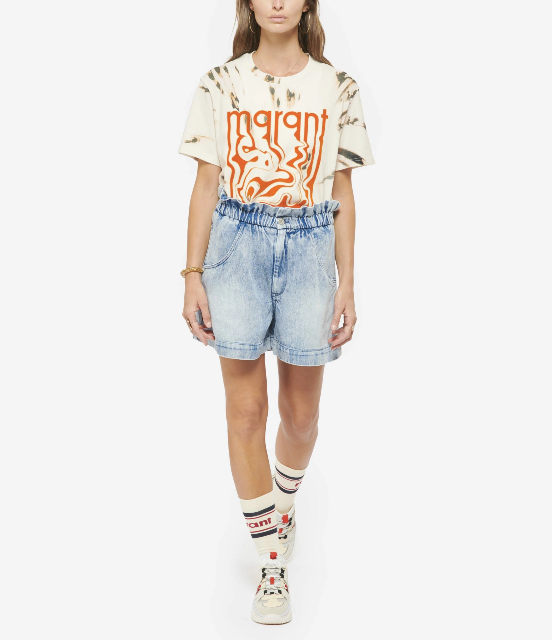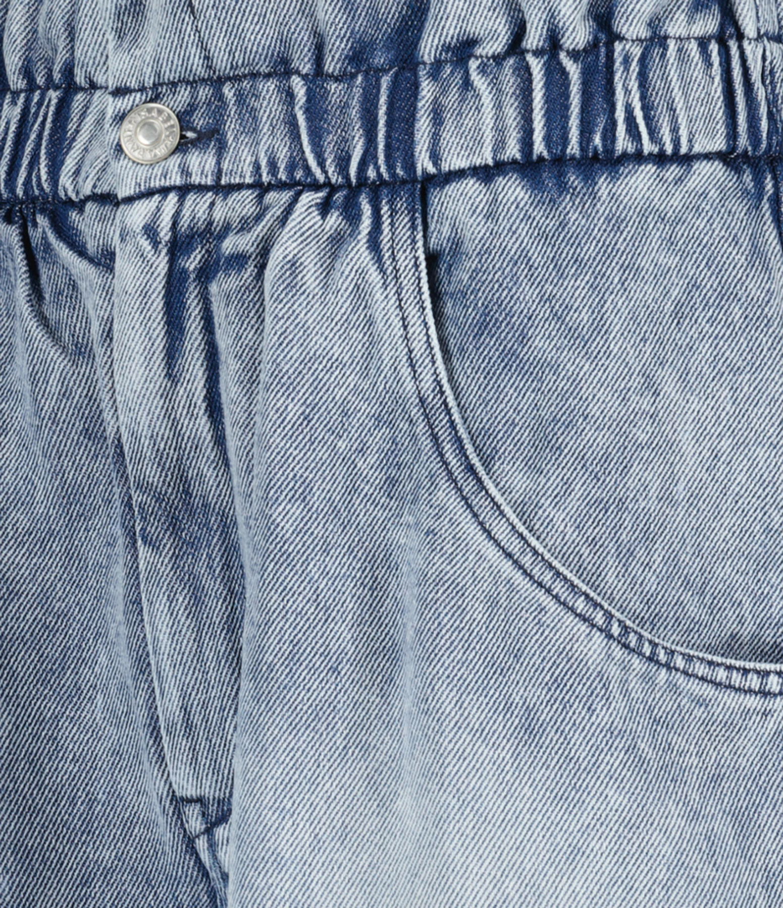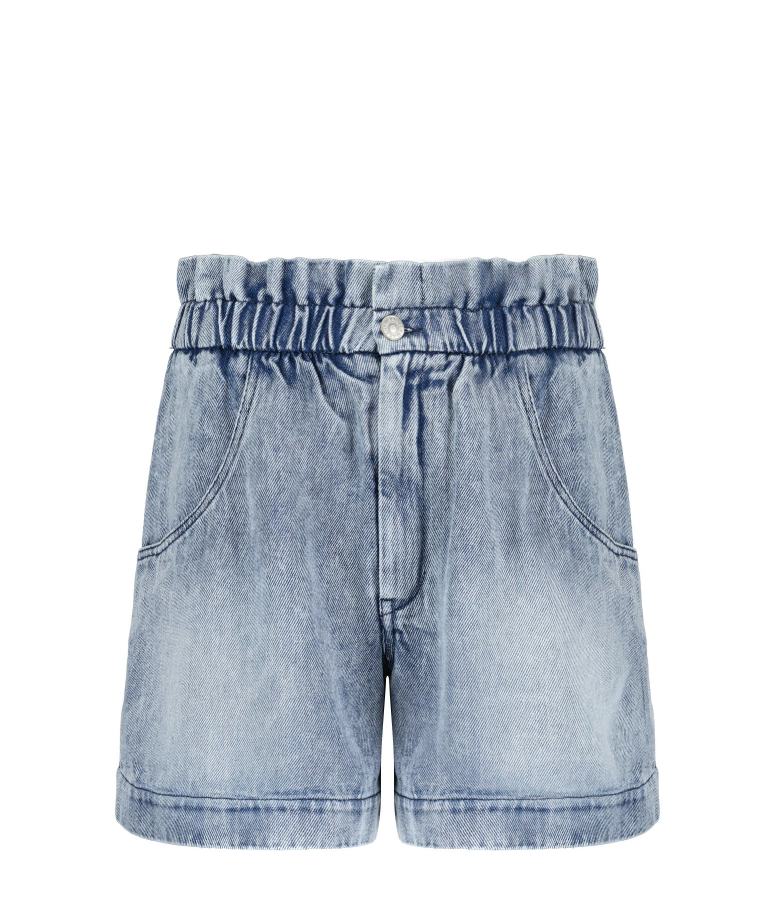 Short court en denim bleu clair. Taille haute élastiquée. Braguette zippée et boutonnée. Bouton en métal argent avec inscription “ISABEL MARANT” gravée. Deux poches italiennes. Deux poches plaquées dans le dos. Empiècement dans le dos. Coupe loose. Base droite. Non doublé.