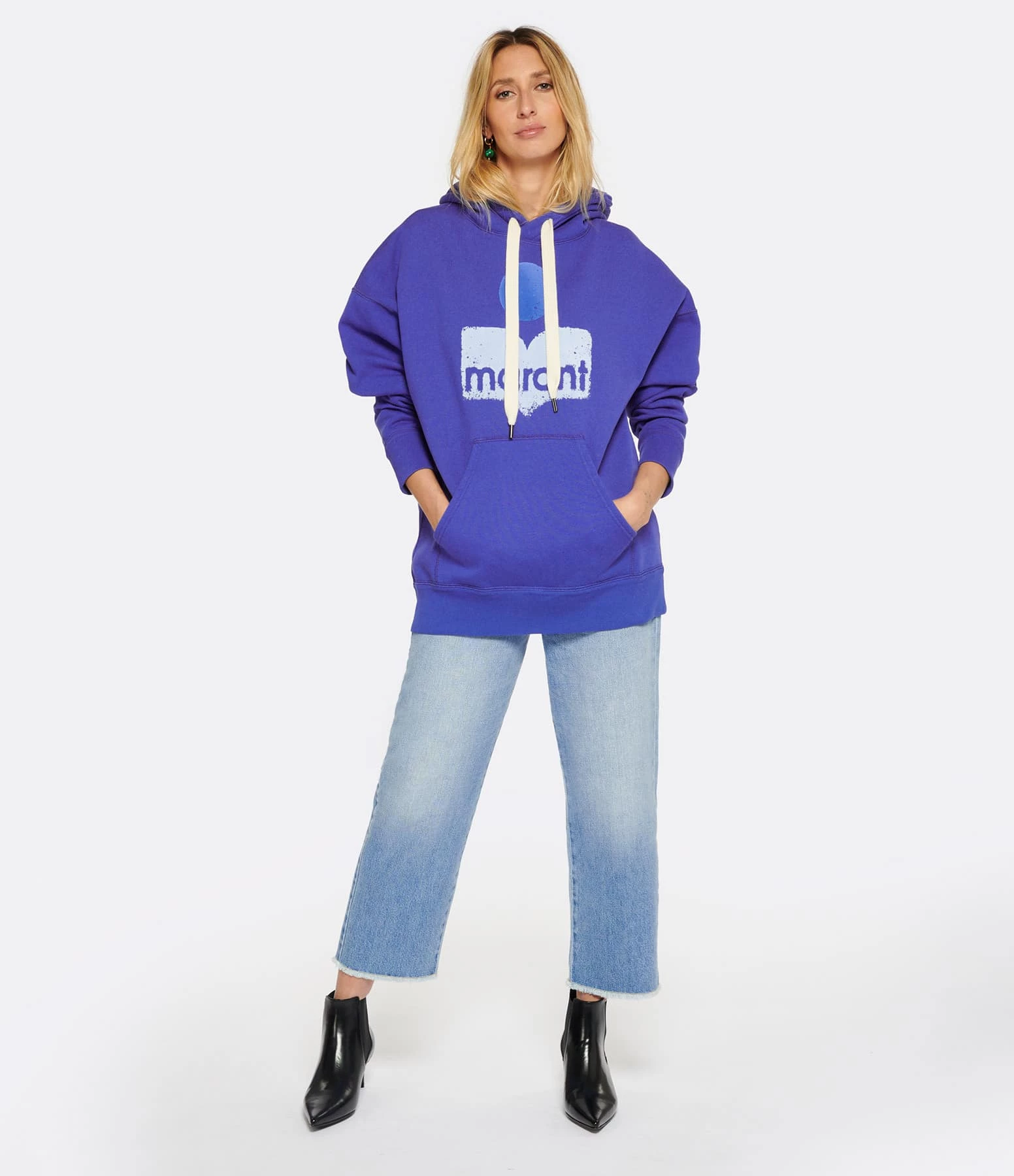 Sweatshirt en coton molletonné mélangé bleu avec le logo MARANT flocké velours en deux teintes de bleu contrastantes sur le devant. Col à capuche avec liens de serrage. Manches longues avec poignets côtelés. Une poche kangourou sur le devant. Coupe ample. Base droite côtelée.