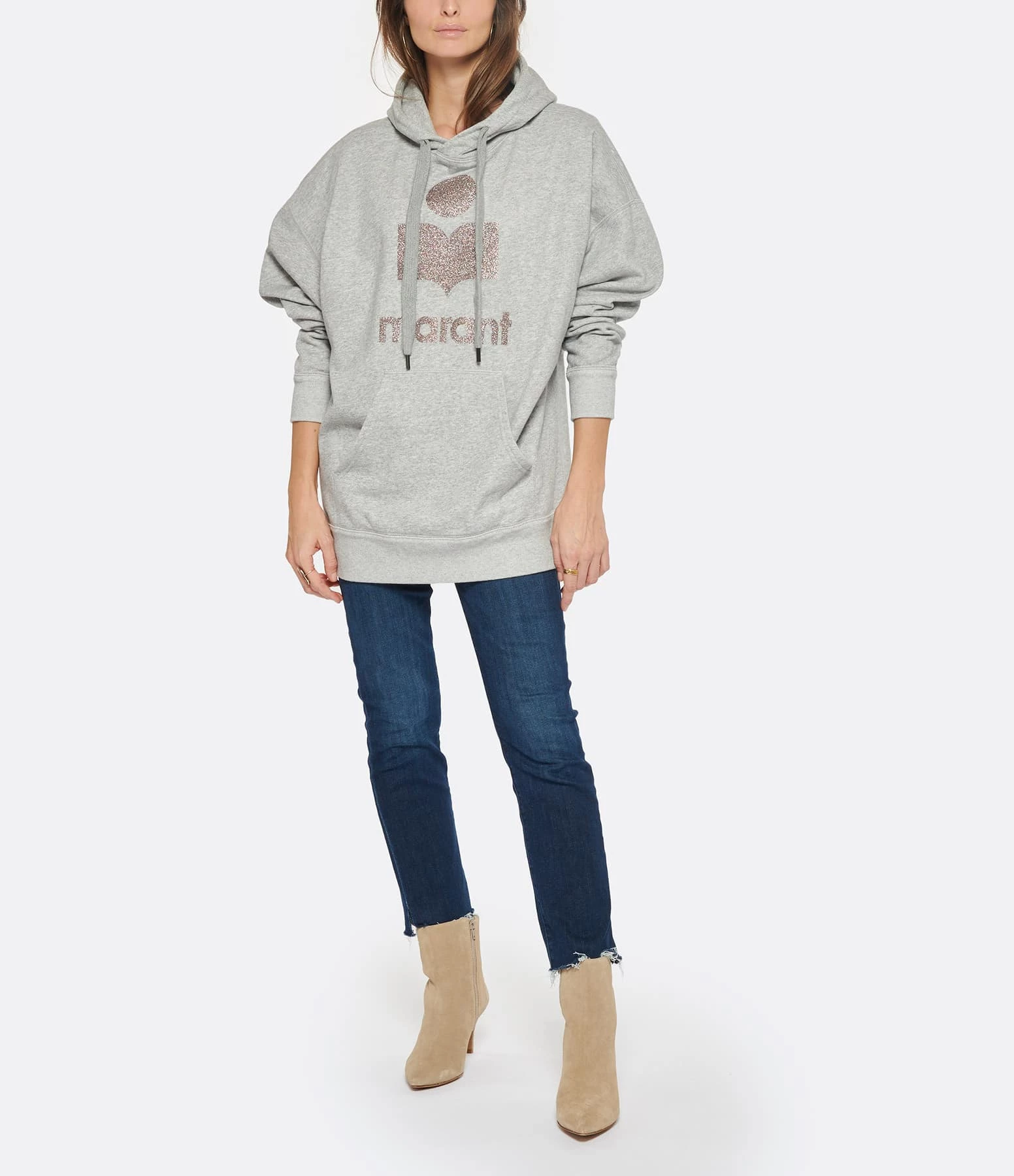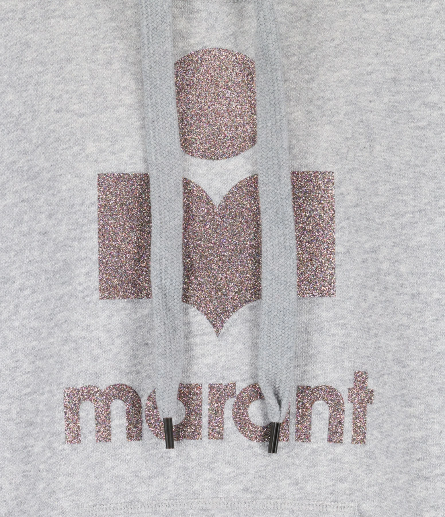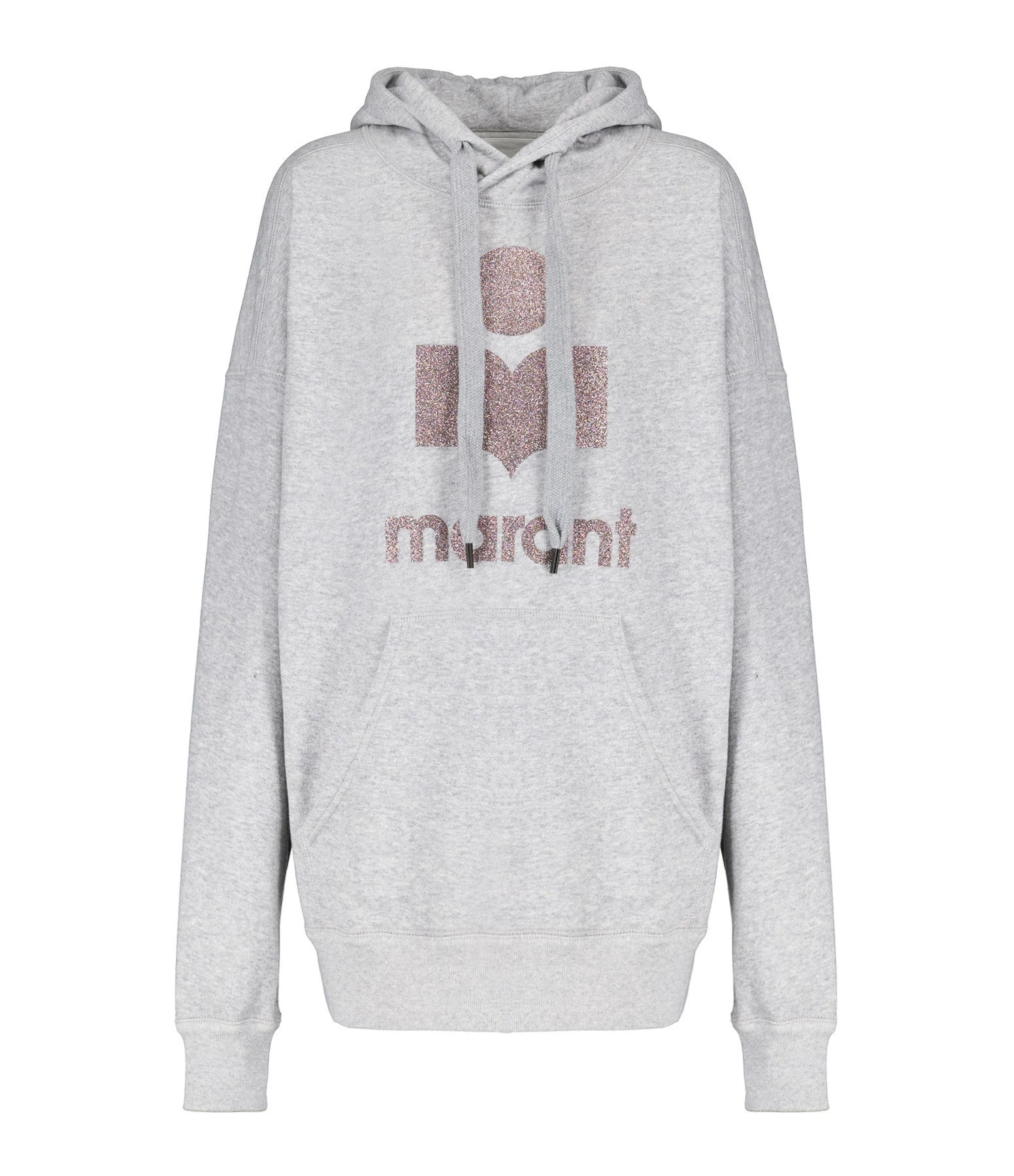 Sweatshirt en coton molletonné gris. Col rond à capuche avec liens de resserrage. Logo “Marant” flocké en paillettes multicolores. Manches longues avec poignet côtelé. Poche kangourou sur le devant. Coupe ample. Base droite côtelée.