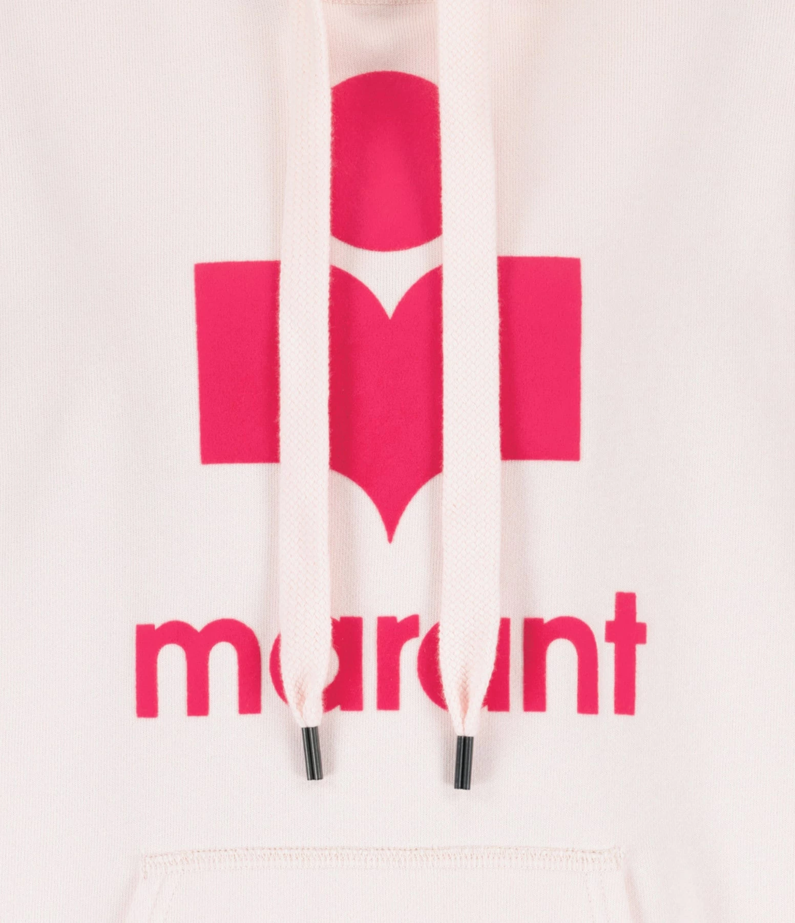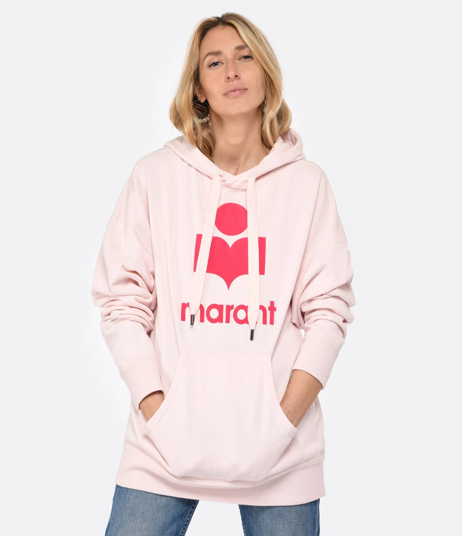 Sweatshirt en coton molletonné rose clair. Col rond à capuche avec liens de resserrage. Logo “Marant” flocké en rose framboise sur le devant. Manches longues avec poignet côtelé. Poche kangourou sur le devant. Coupe ample. Base droite côtelée.