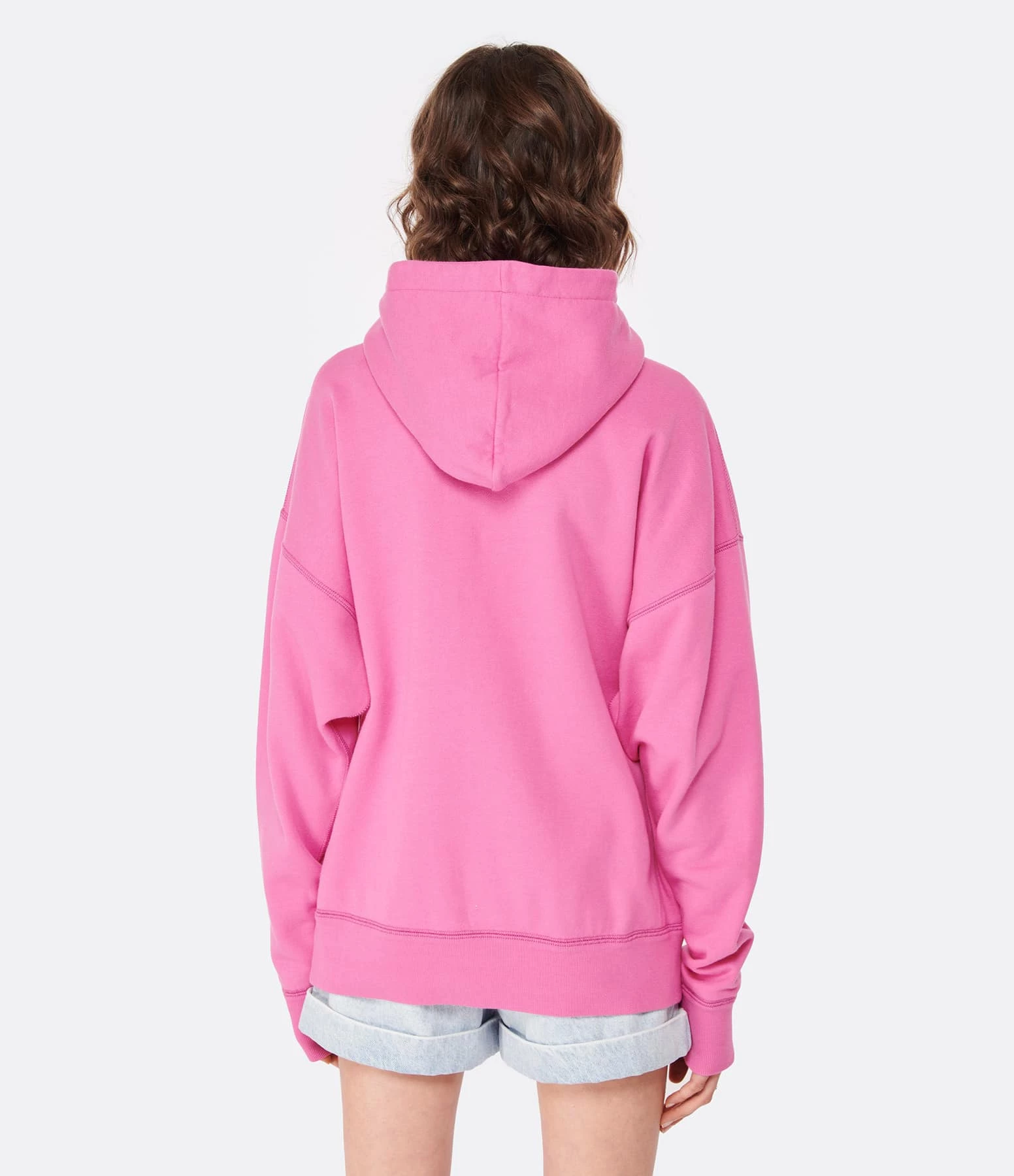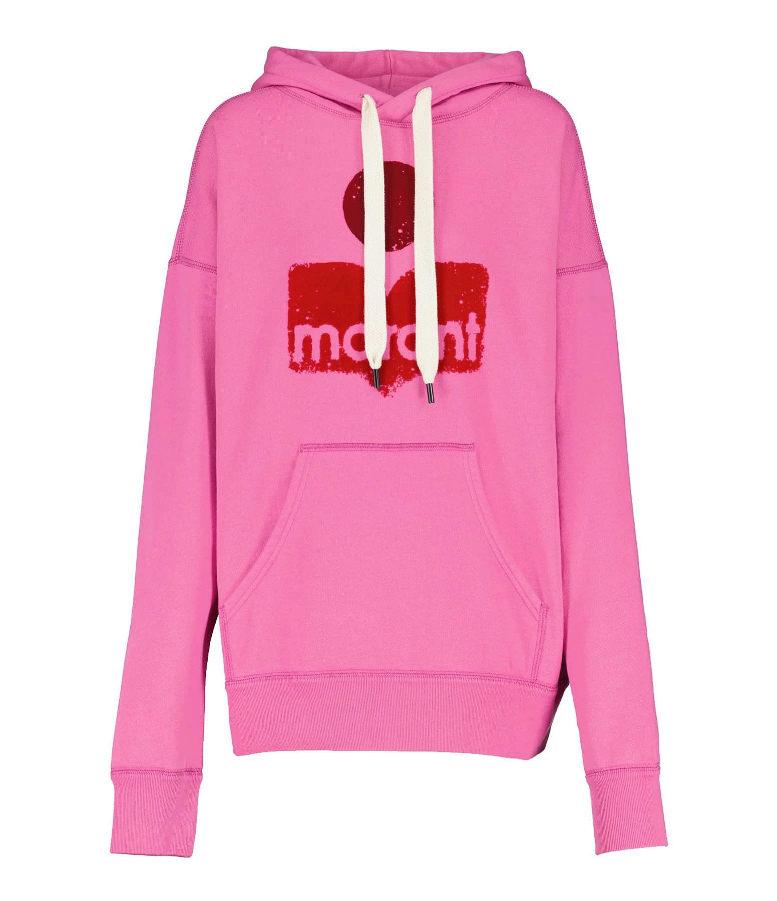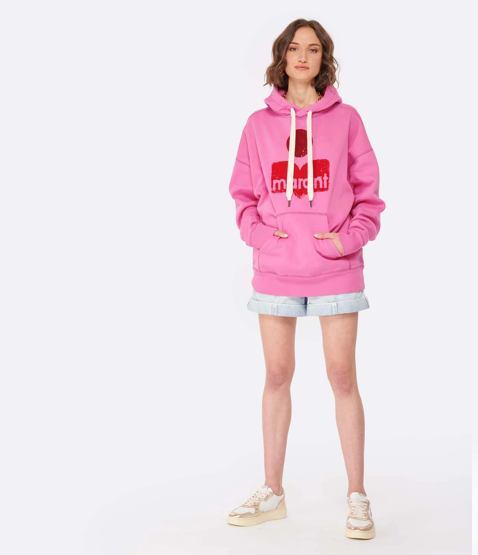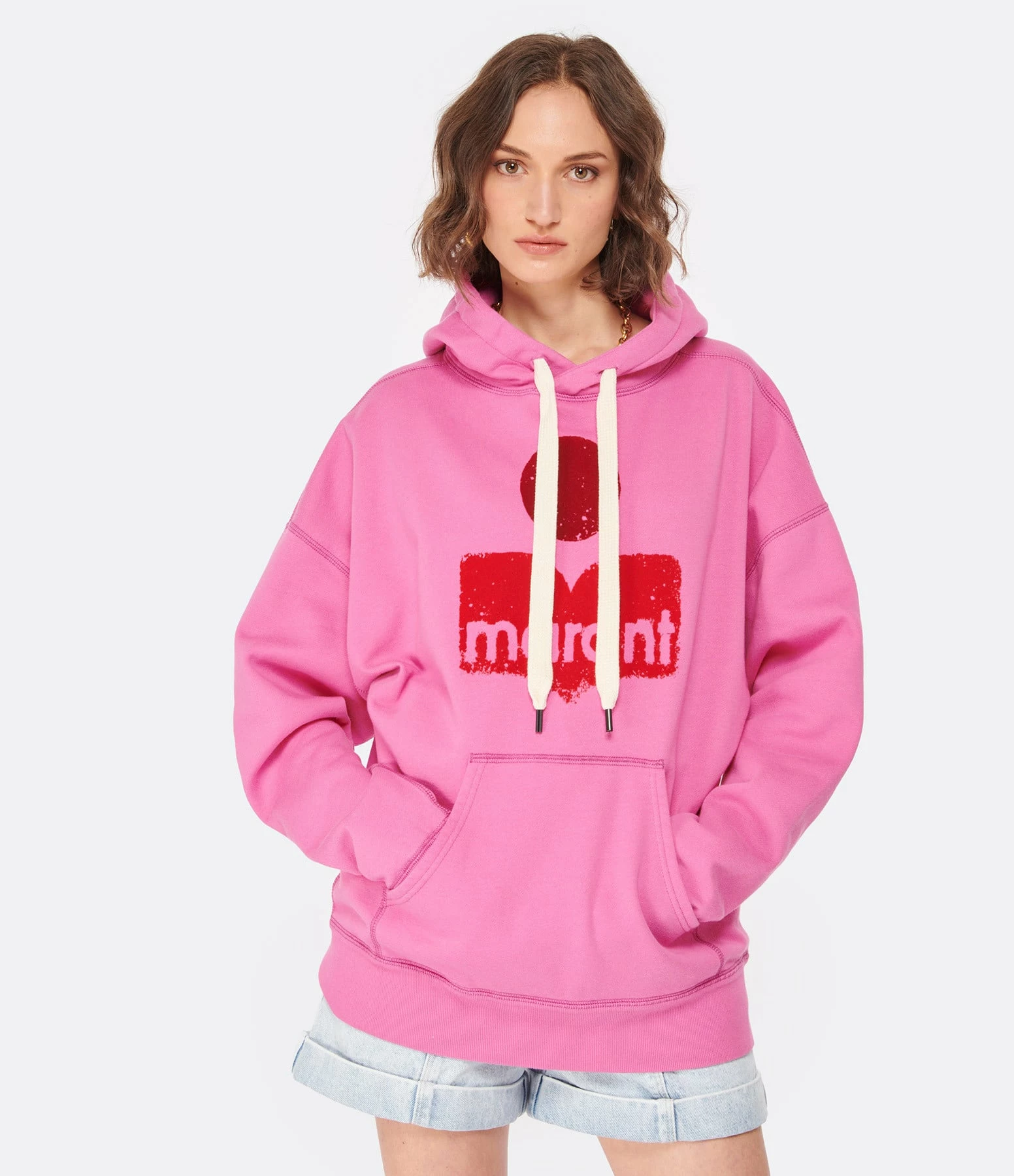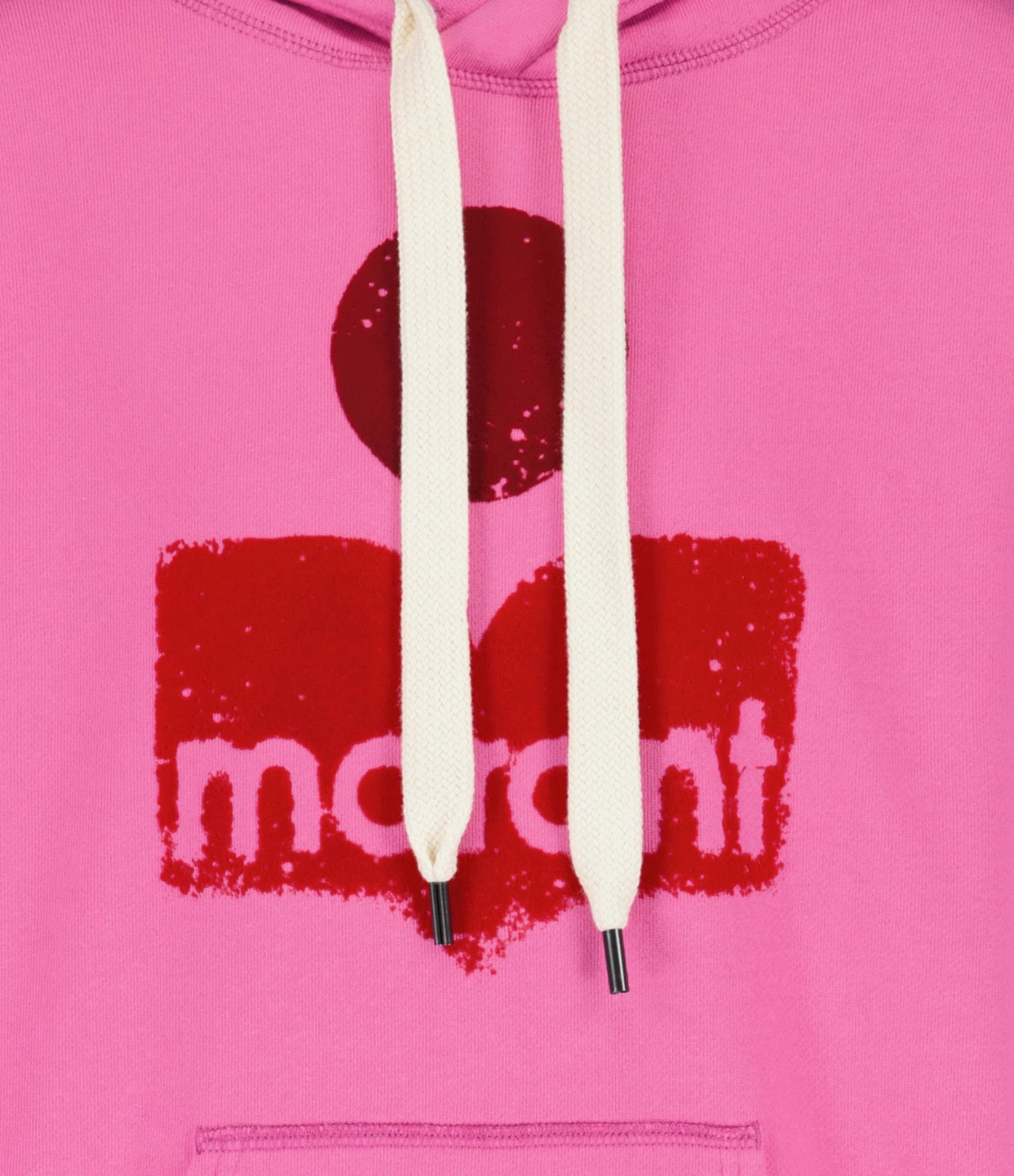 Sweatshirt en coton molletonné mélangé rose chiné avec le logo Marant flocké en velours rouge sur le devant. Col rond à capuche avec liens de serrage beiges. Manches longues avec poignets côtelés. Poche kangourou sur le devant. Coupe ample. Base droite côtelée.