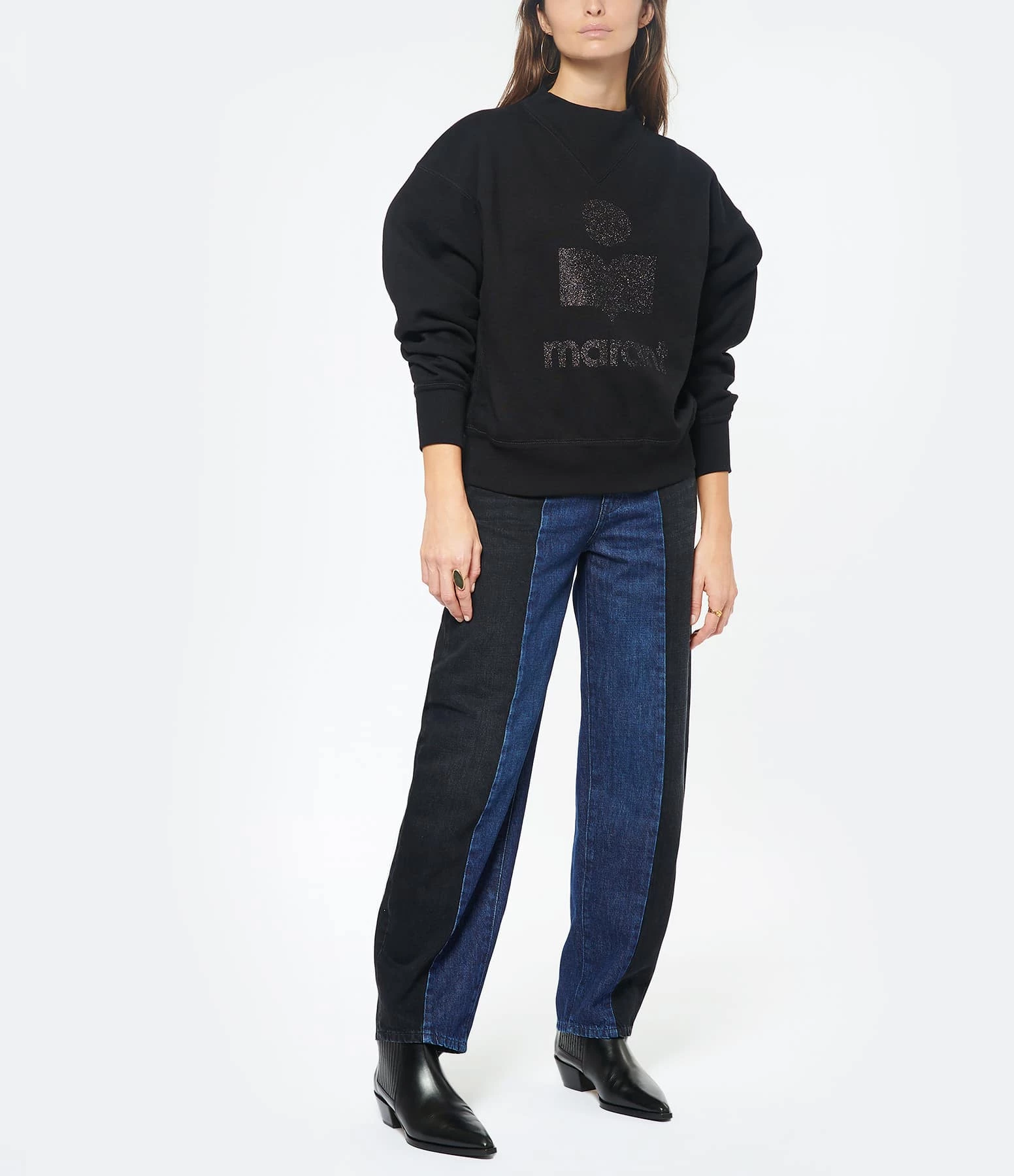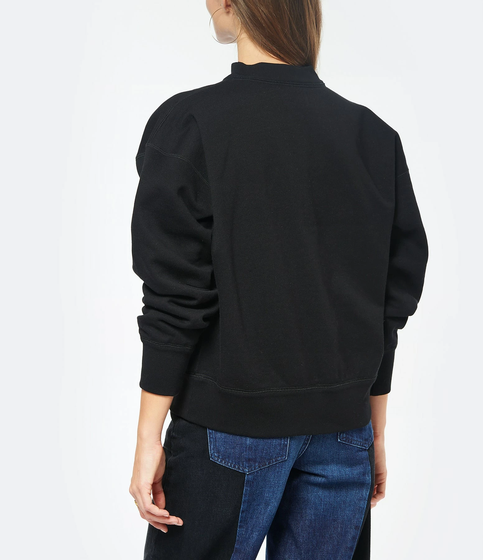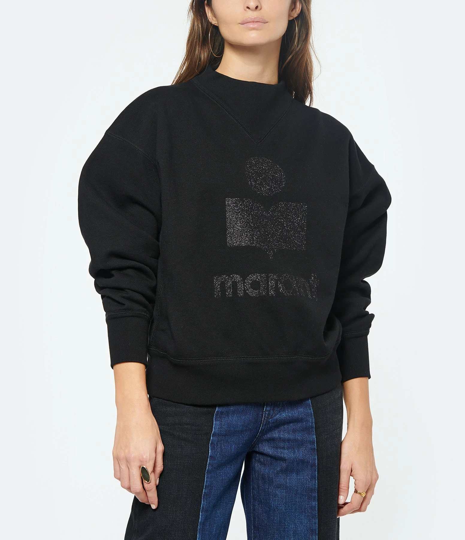 Sweatshirt en coton molletonné mélangé noir. Logo en flocage paillette noir sur le devant. Col montant côtelé. Manches longues avec poignets côtelés. Coupe droite. Base droite côtelée.