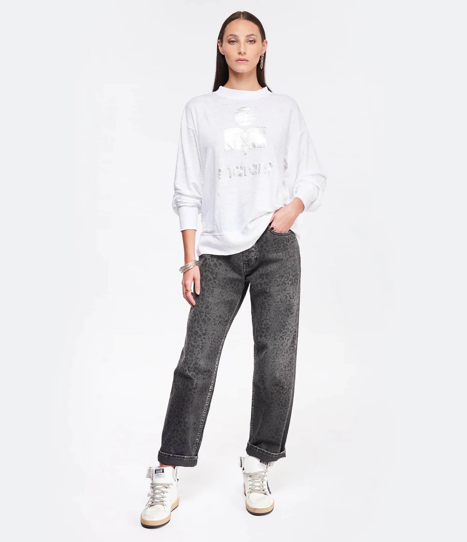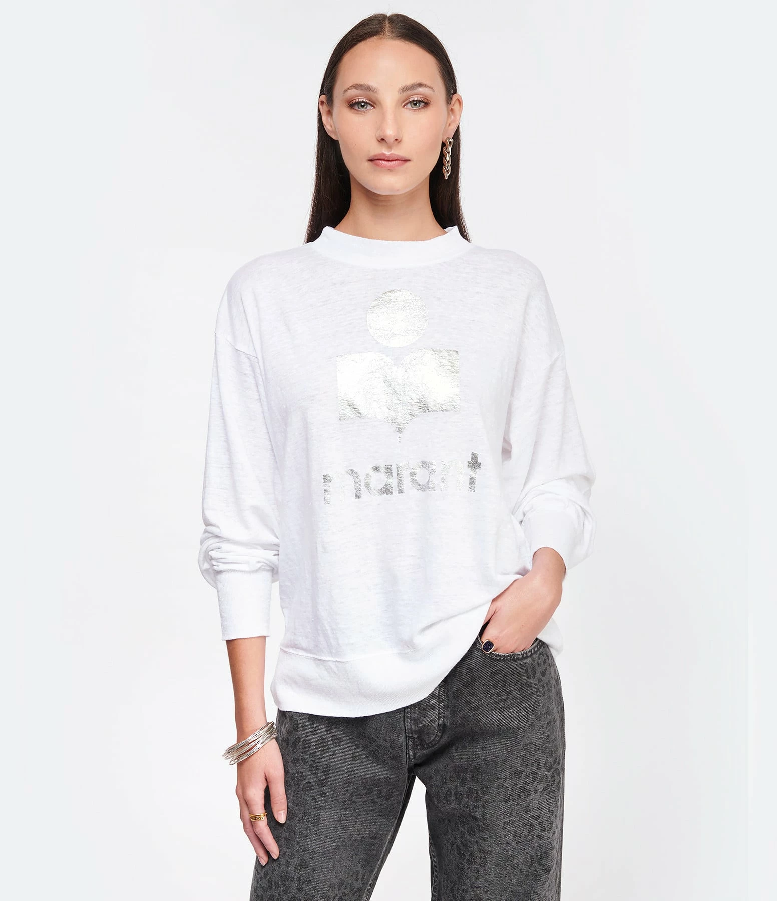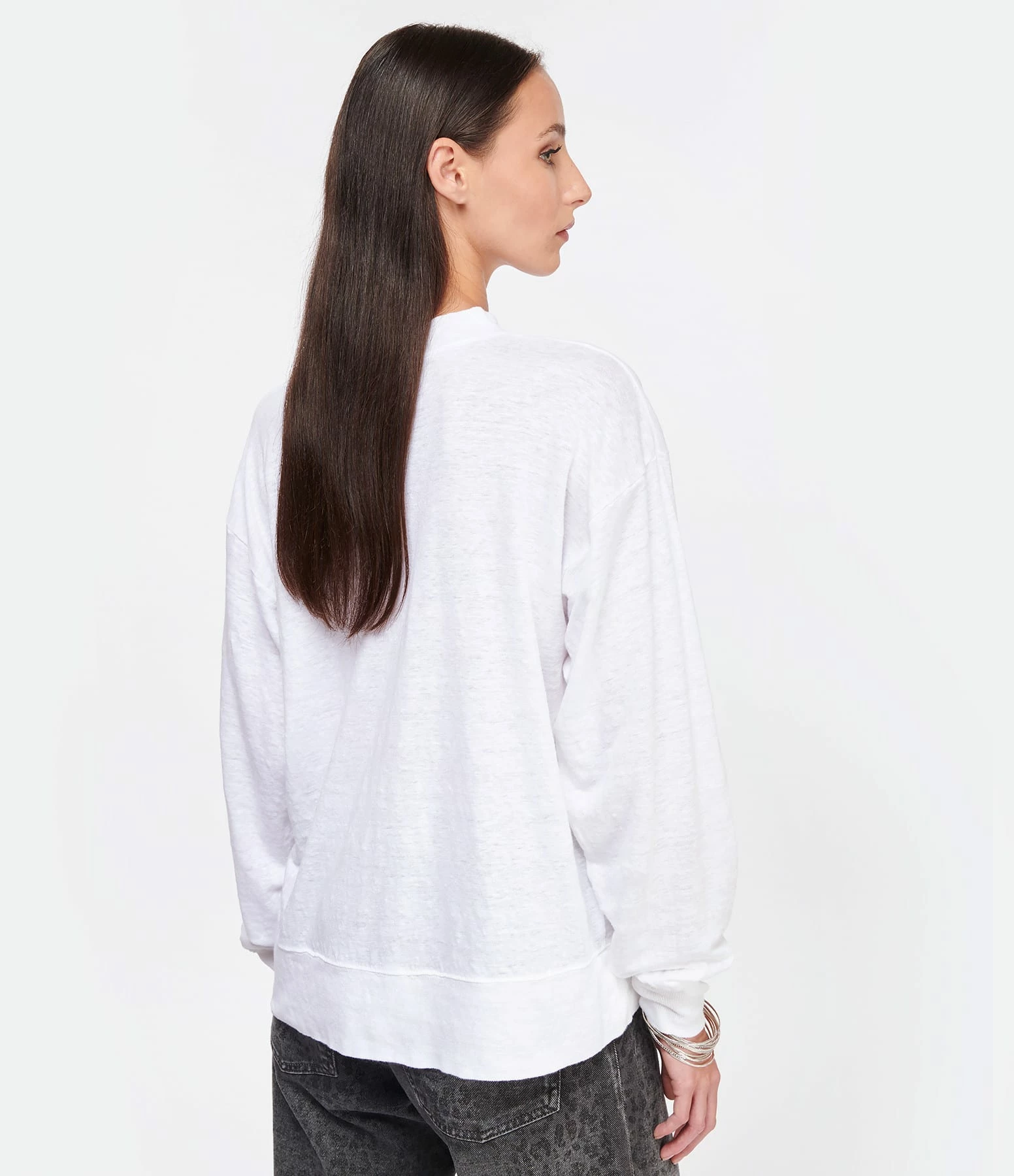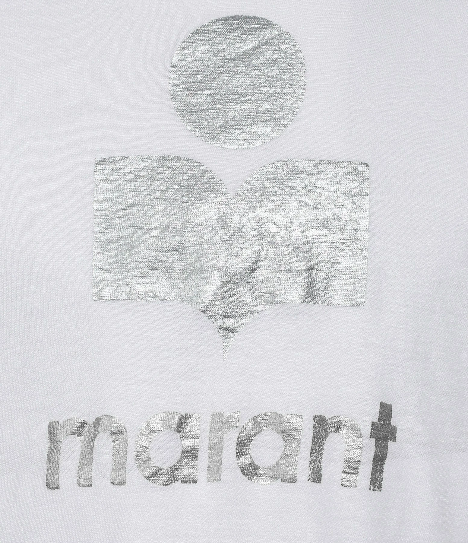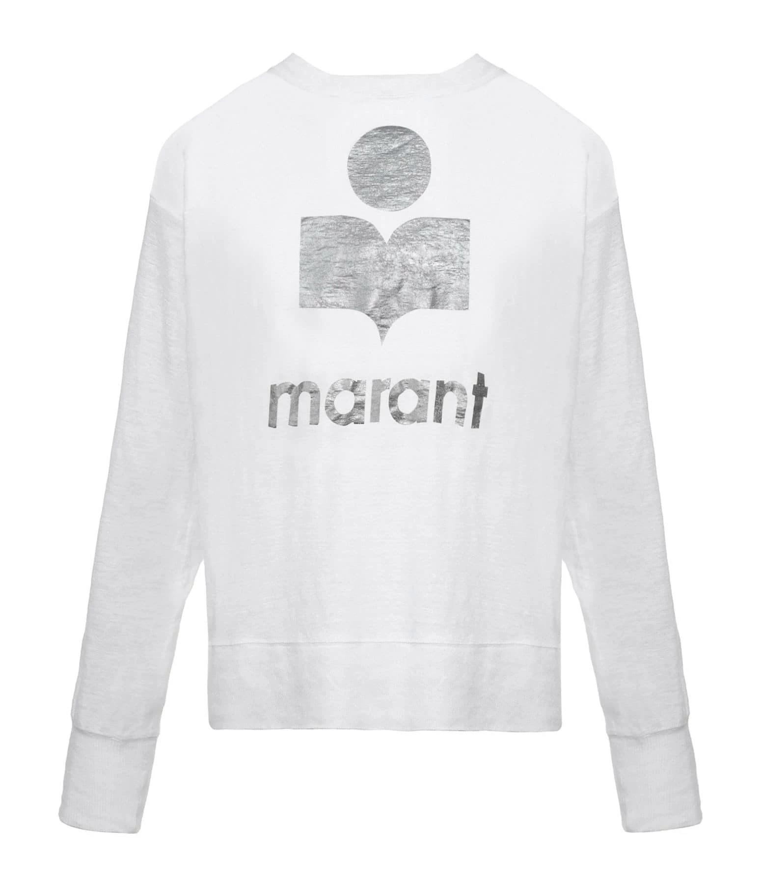 Tee-shirt en lin blanc orné du logo “Marant” flocké en argenté. Col rond côtelé. Manches longues avec poignets côtelés. Coupe droite. Base droite.