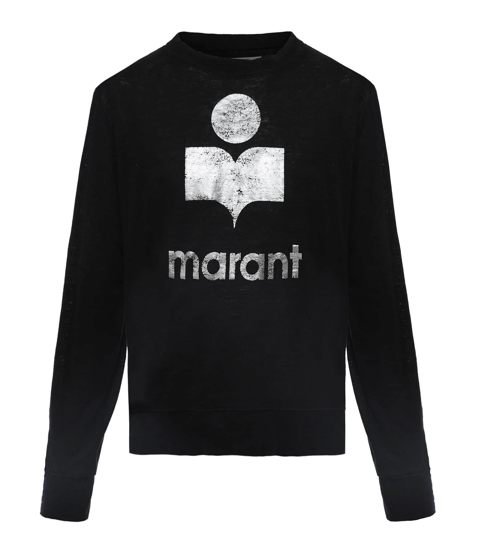 Tee-shirt en lin noir imprimé. Logo “MARANT” flocké argenté sur le devant. Col rond. Manches longues. Coupe droite. Base droite. Non doublé.