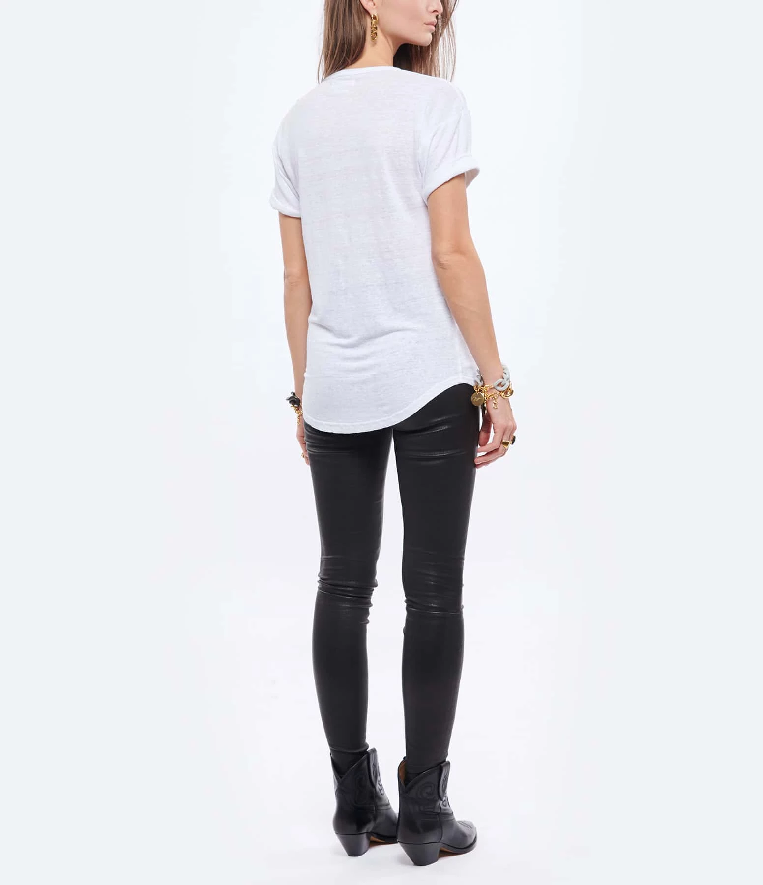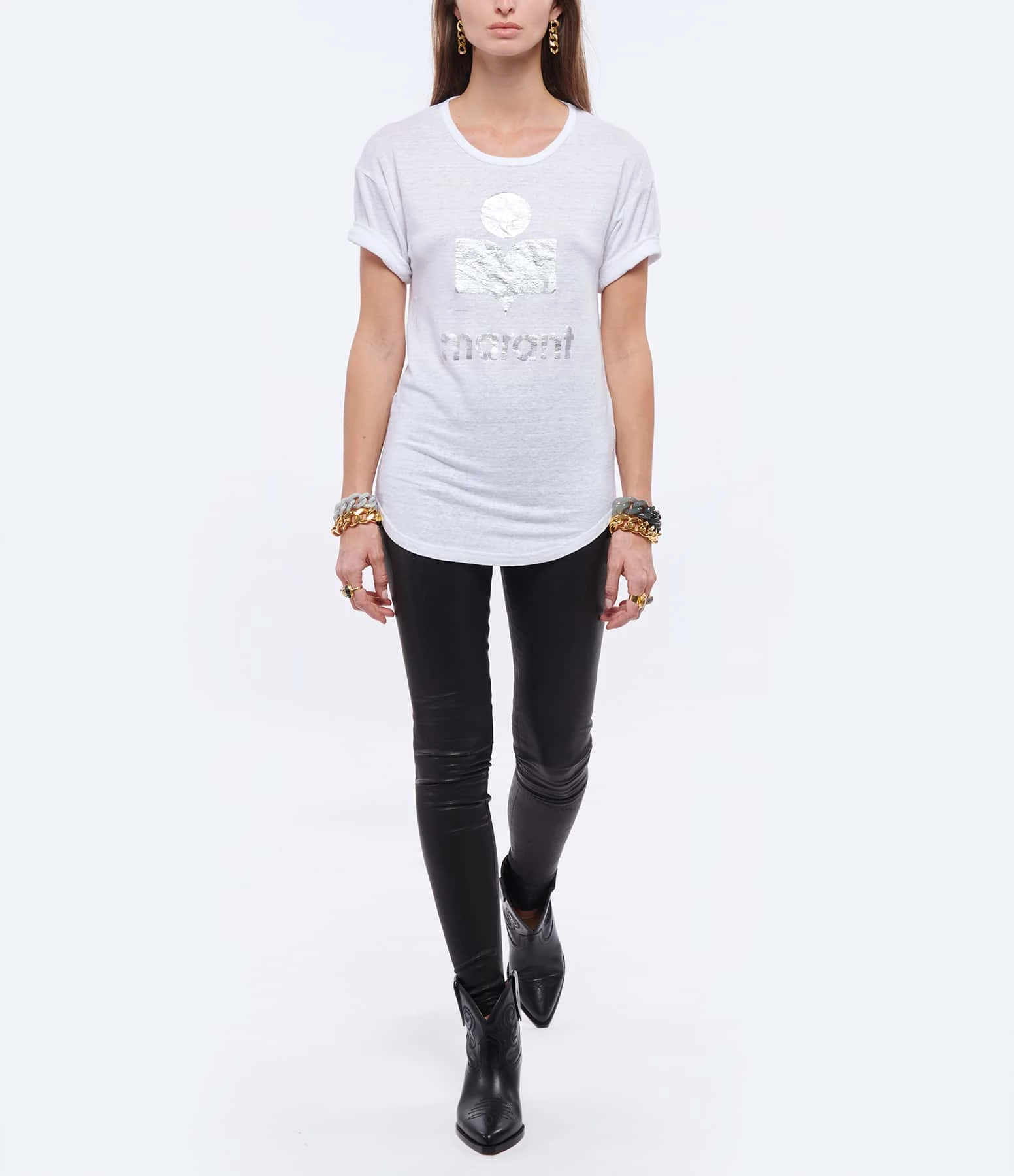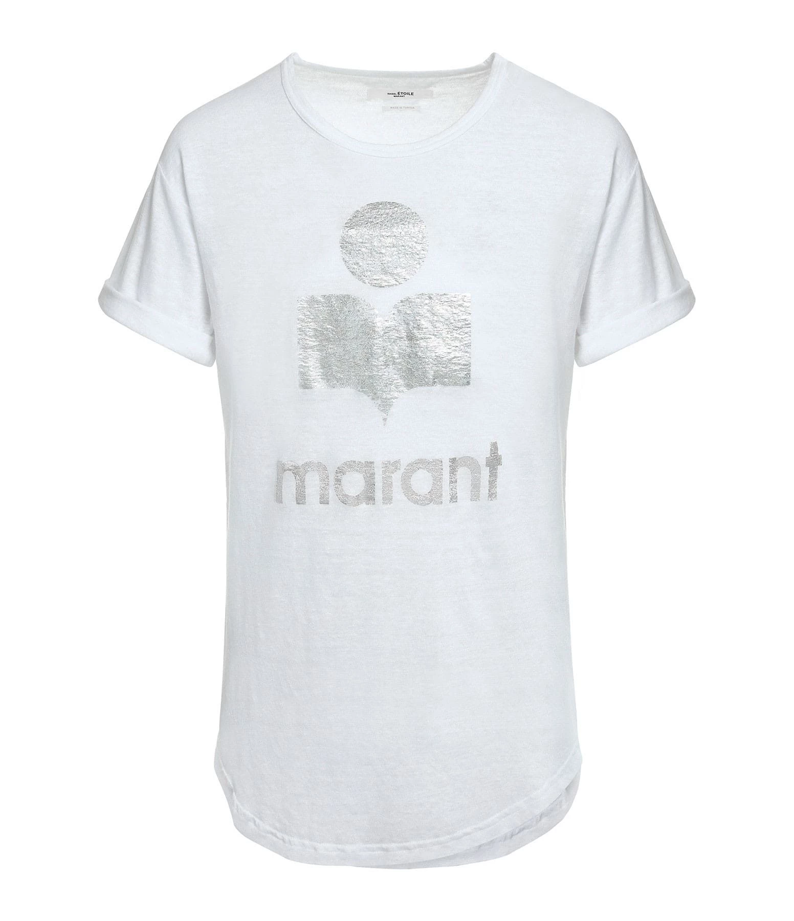 Tee-shirt en lin blanc. Col rond. Manches courtes retroussées. Logo argenté. Coupe droite. Base arrondie.