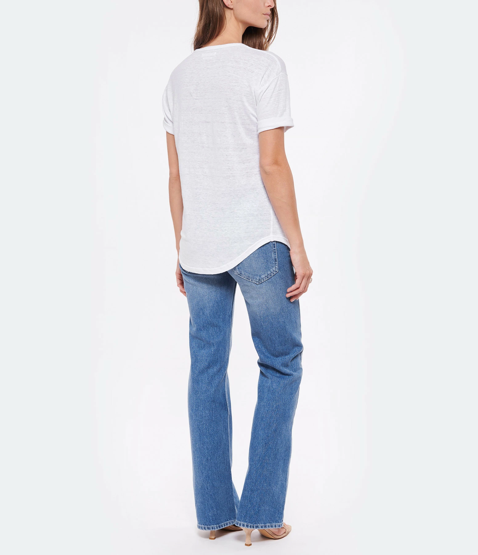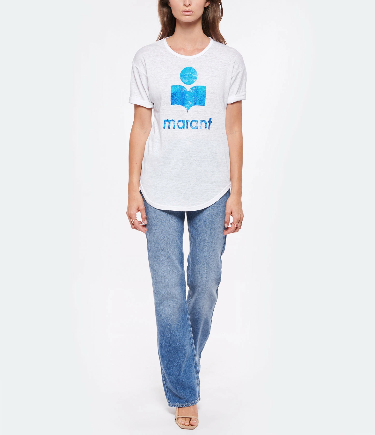 Tee-shirt en lin blanc. Col rond. Manches courtes retroussées. Logo et sérigraphie bleu métallisé. Coupe droite. Base arrondie.