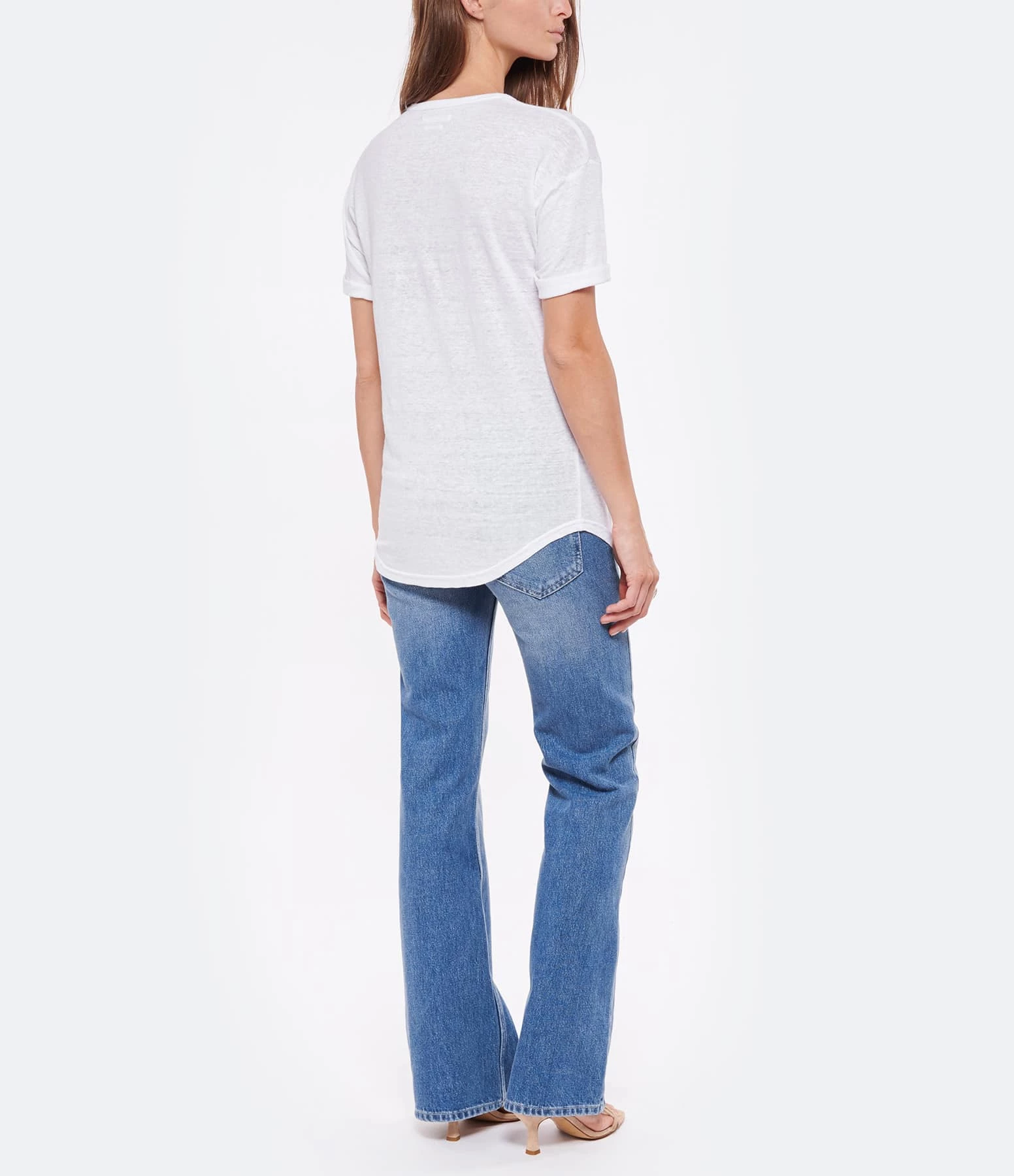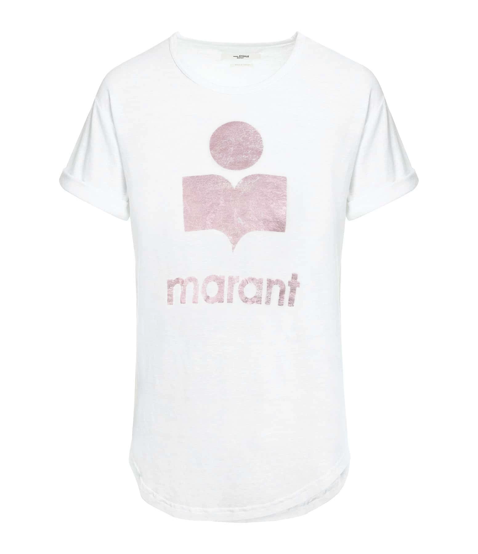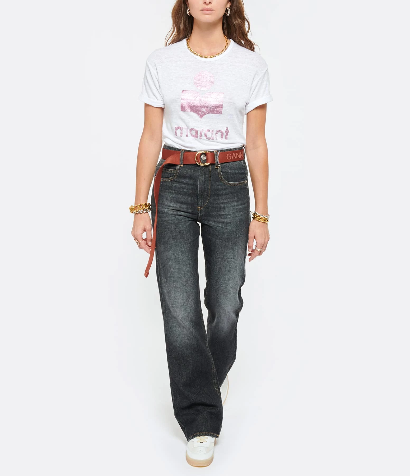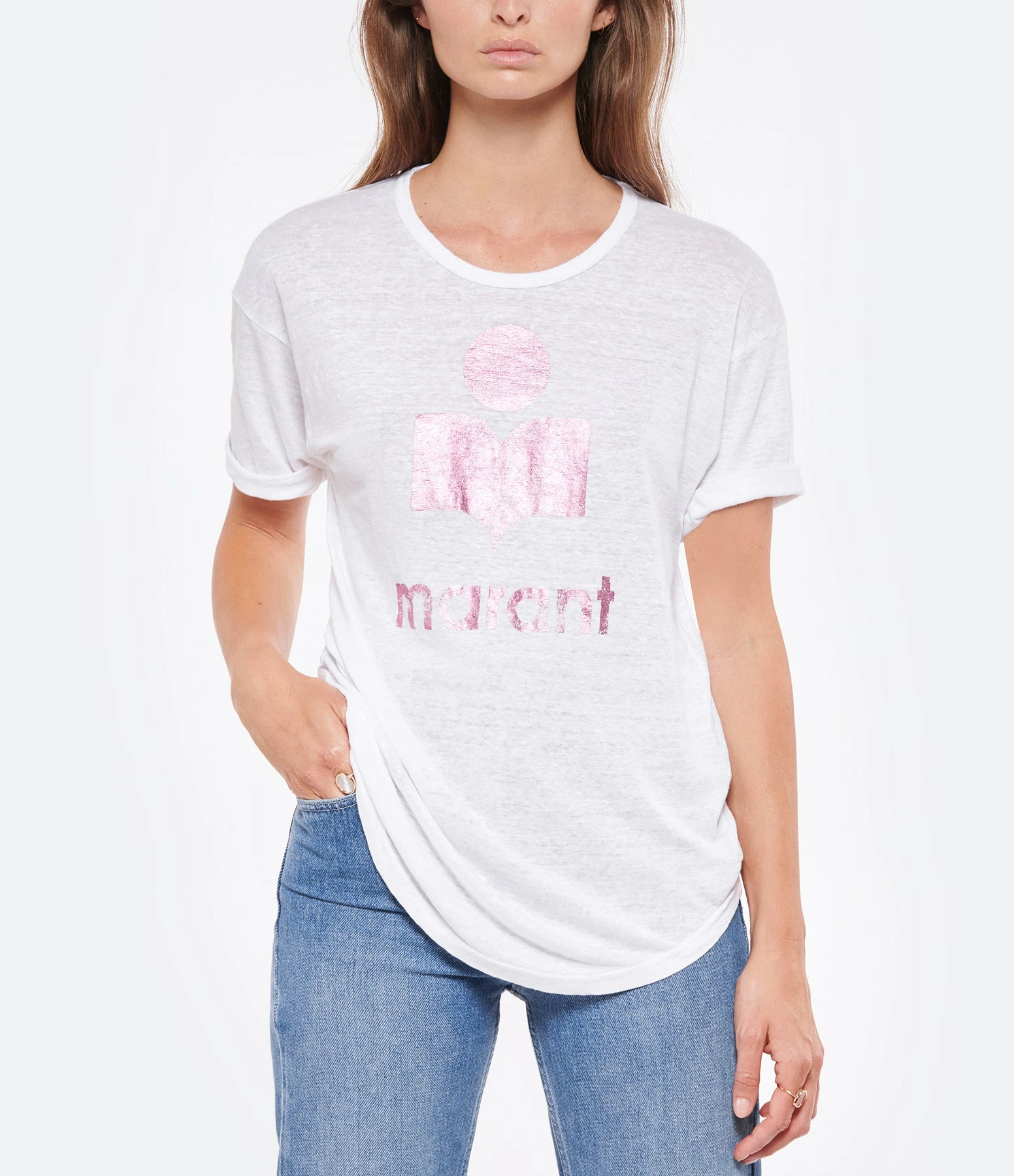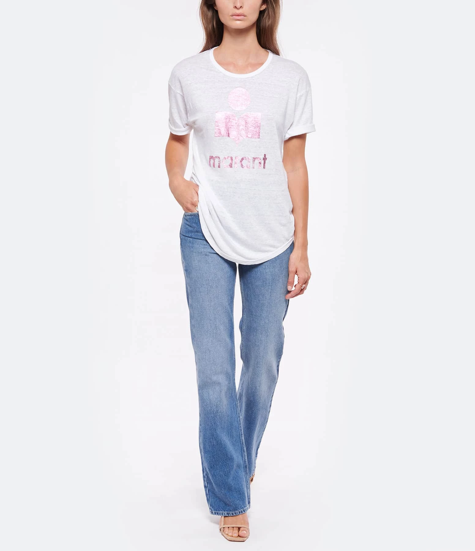 Tee-shirt en lin blanc. Col rond. Manches courtes retroussées. Logo et sérigraphie rose métallisé. Coupe droite. Base arrondie.