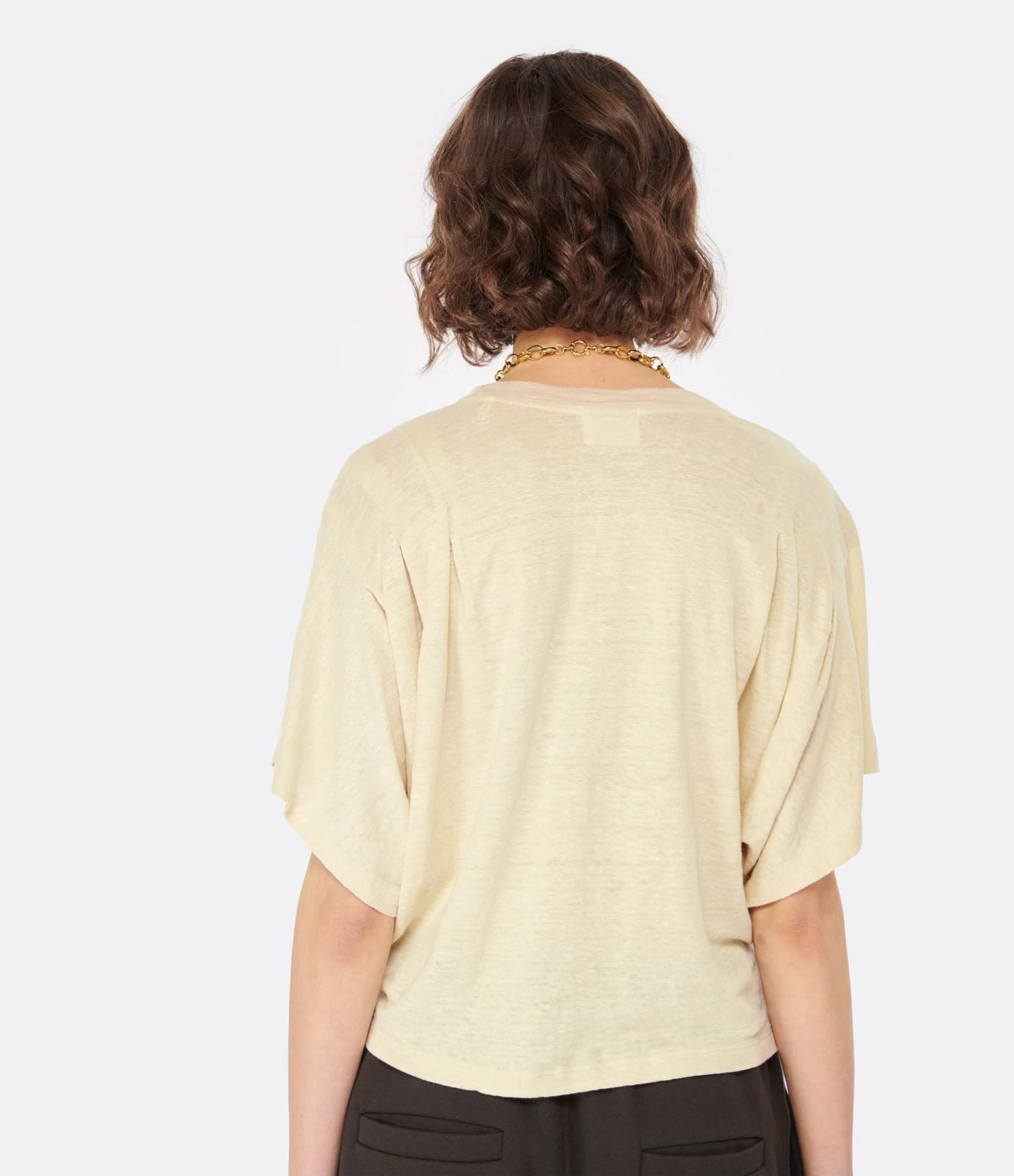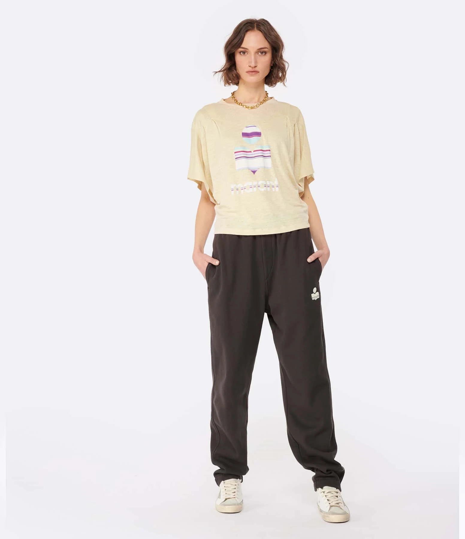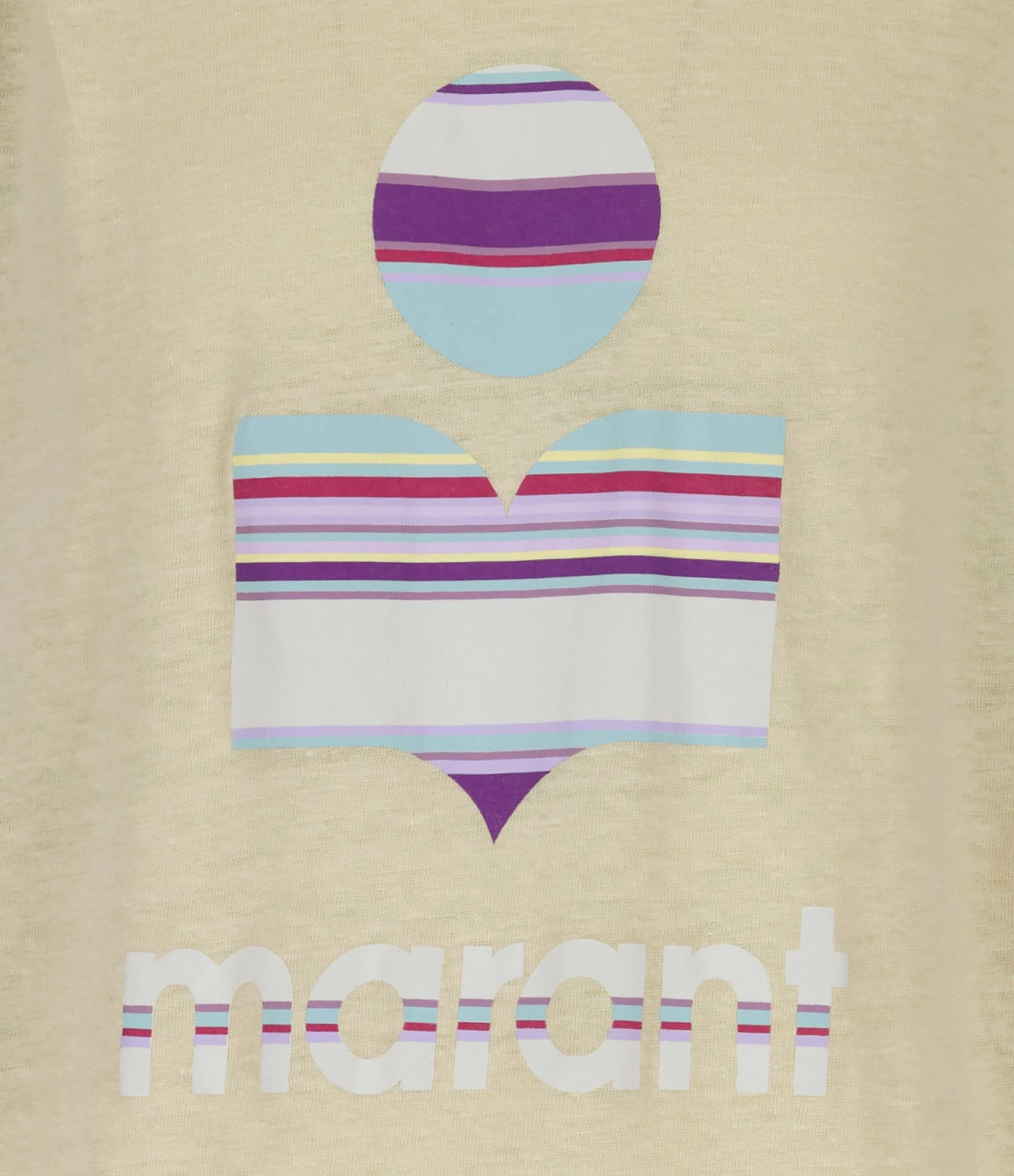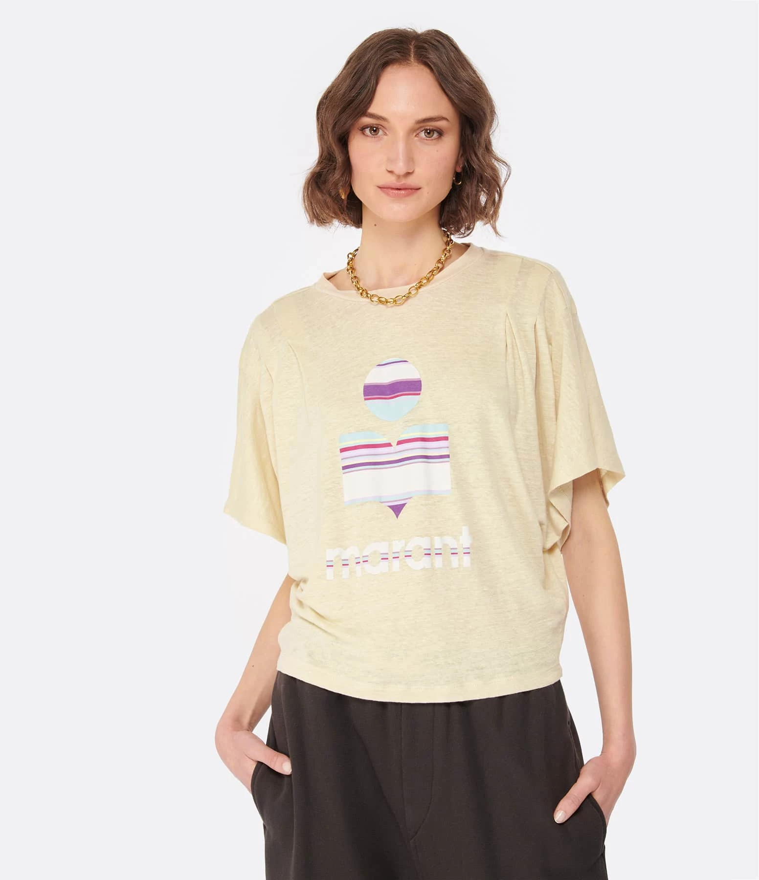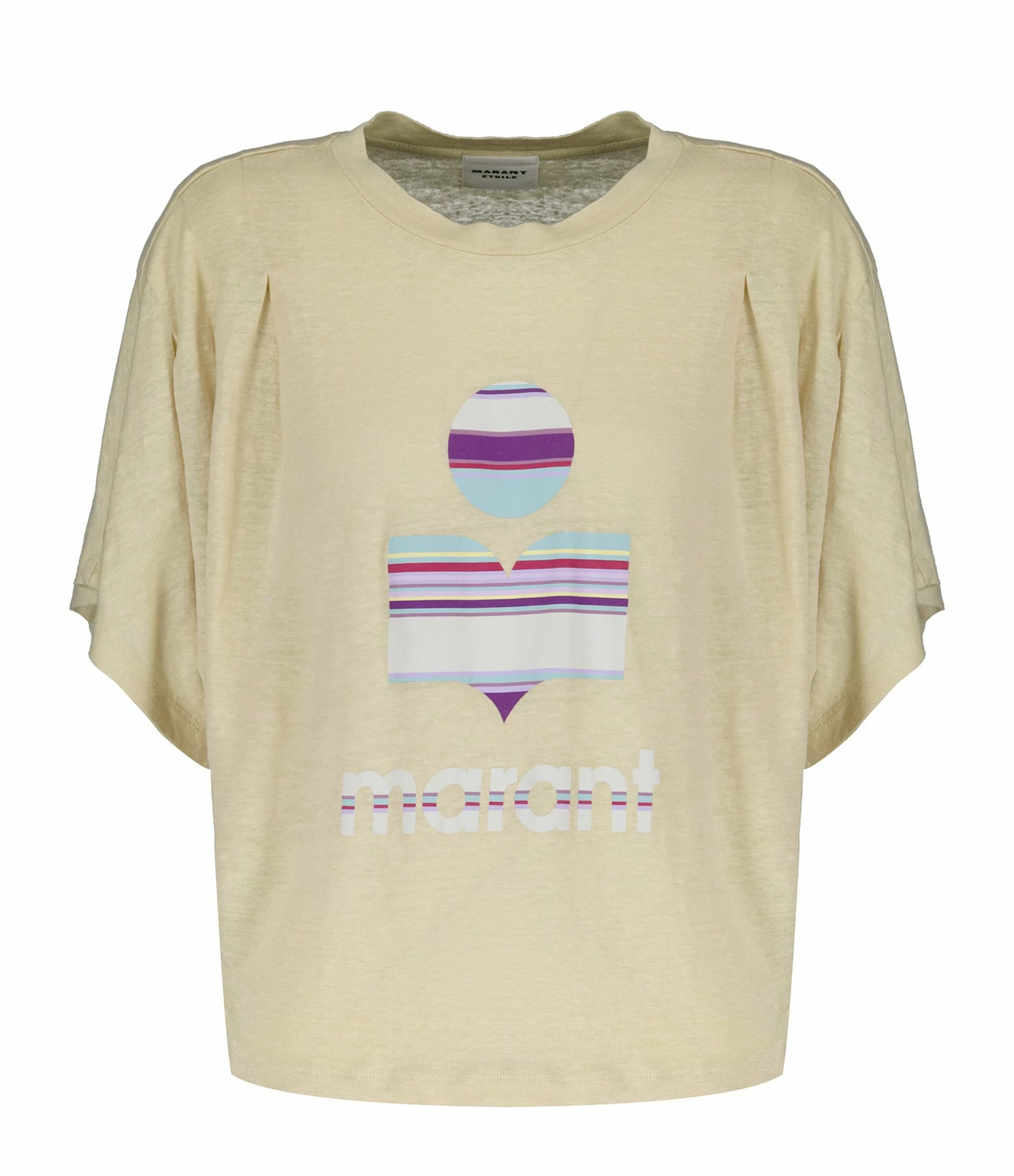 Tee-shirt en lin écru avec le logo Marant à rayures multicolores flocké sur le devant. Col rond côtelé. Épaules plissées. Manches courtes chauve-souris. Coupe ample. Base droite.