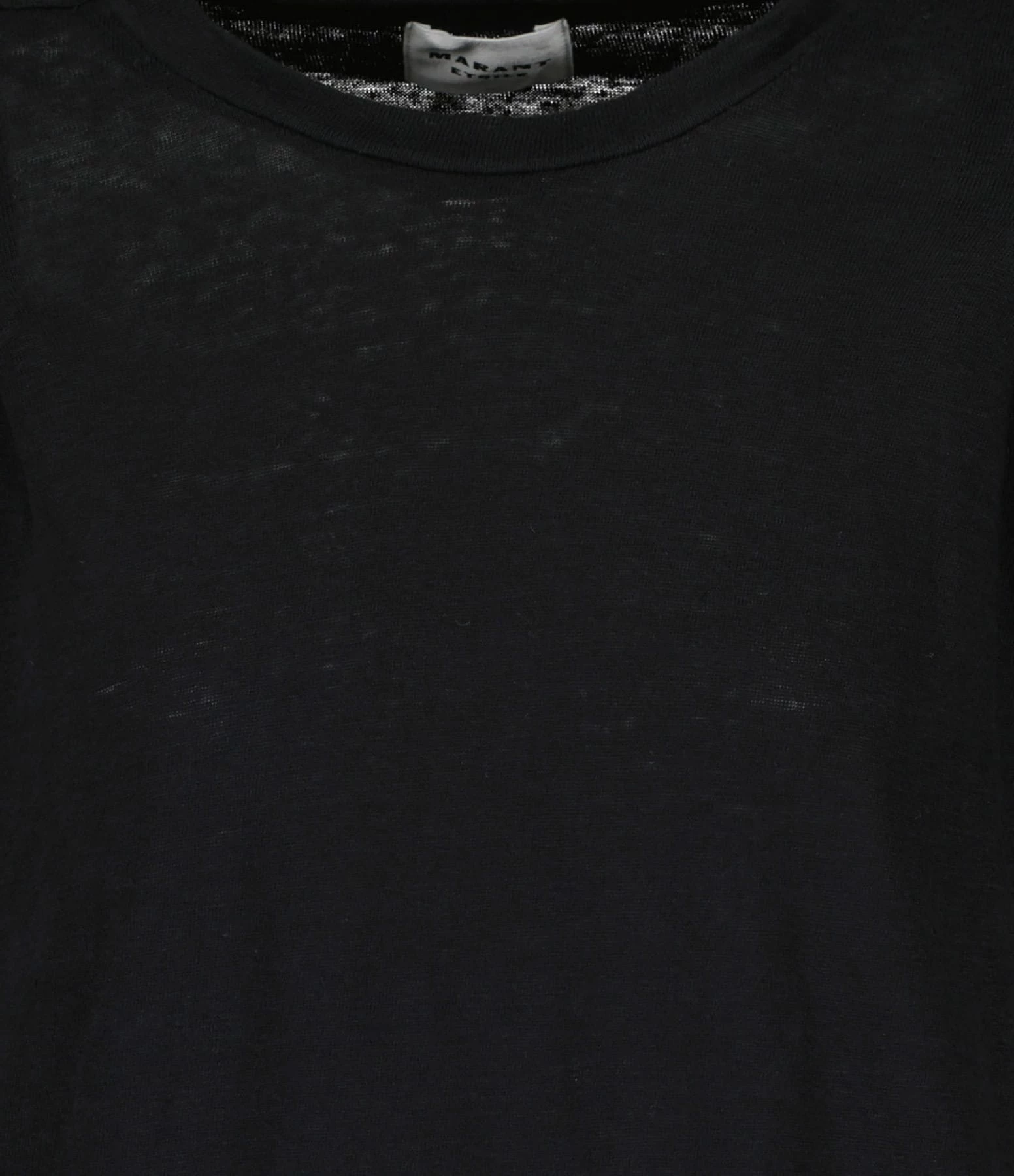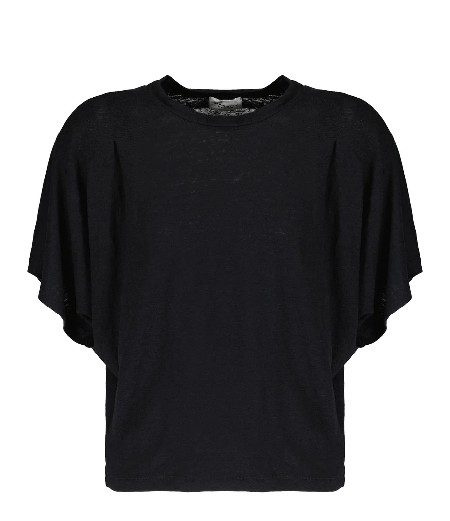 Tee-shirt en lin noir. Col rond côtelé. Épaules plissées. Manches courtes chauve-souris. Coupe ample. Base droite.