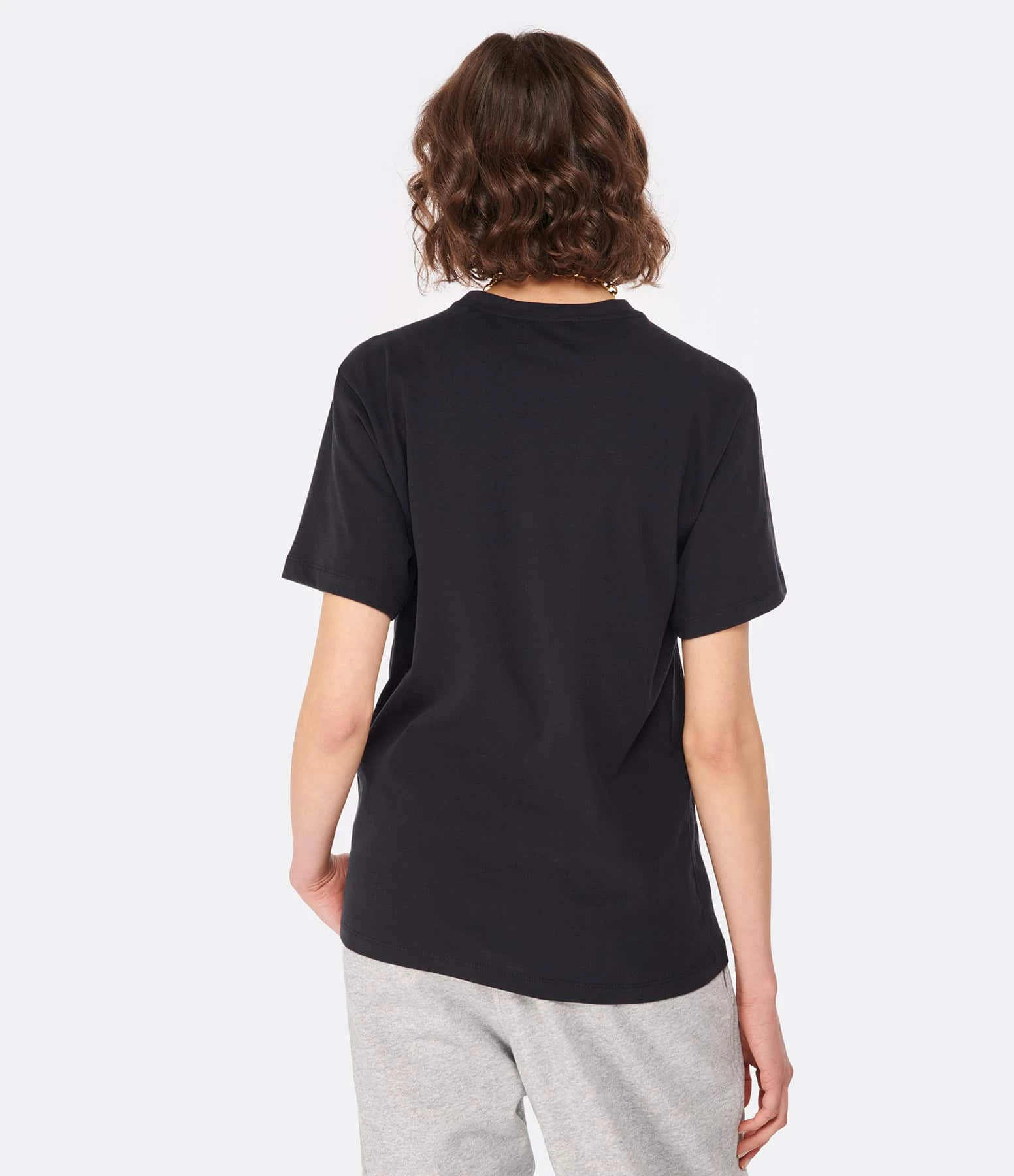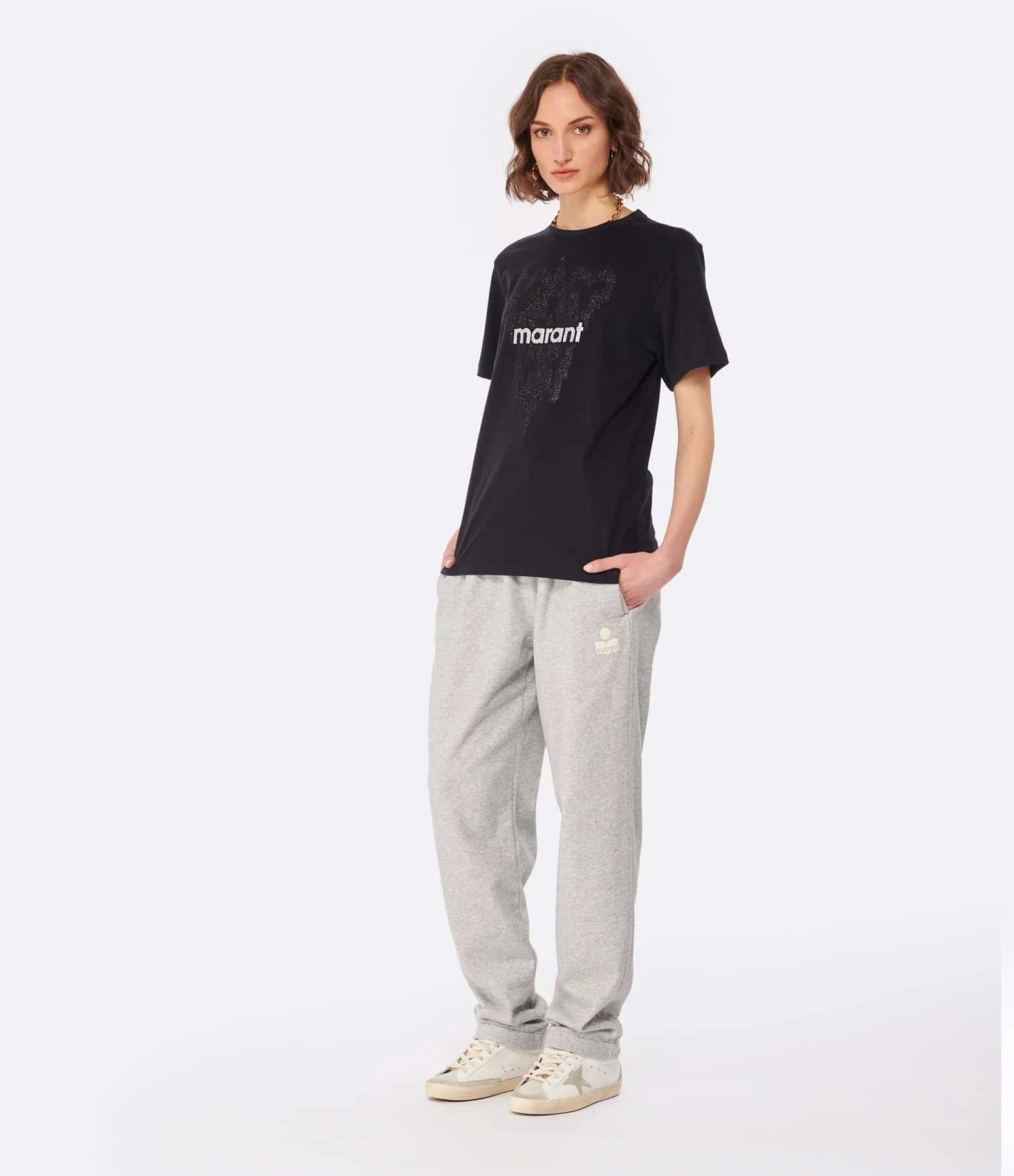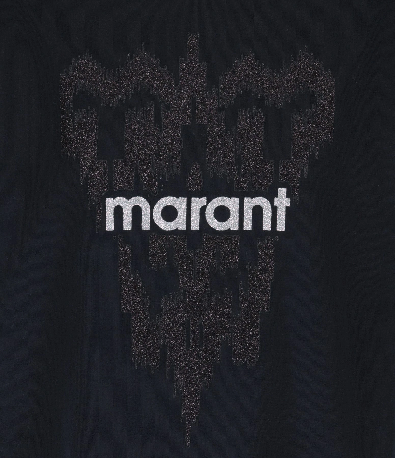 Tee-shirt en coton noir avec le logo Marant flocké en paillettes noir et argenté sur le devant. Col rond côtelé. Manches courtes. Coupe droite. Base droite.