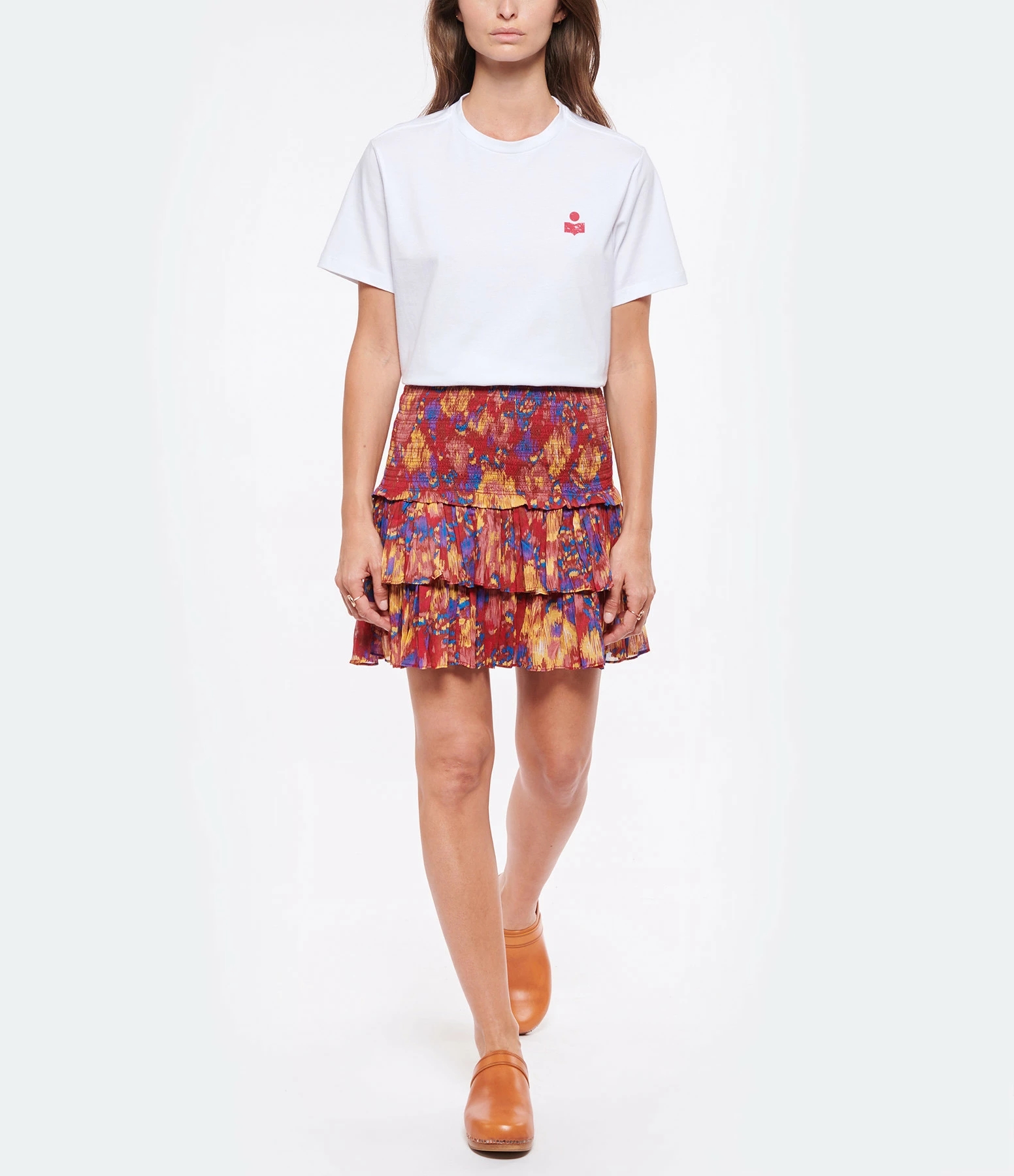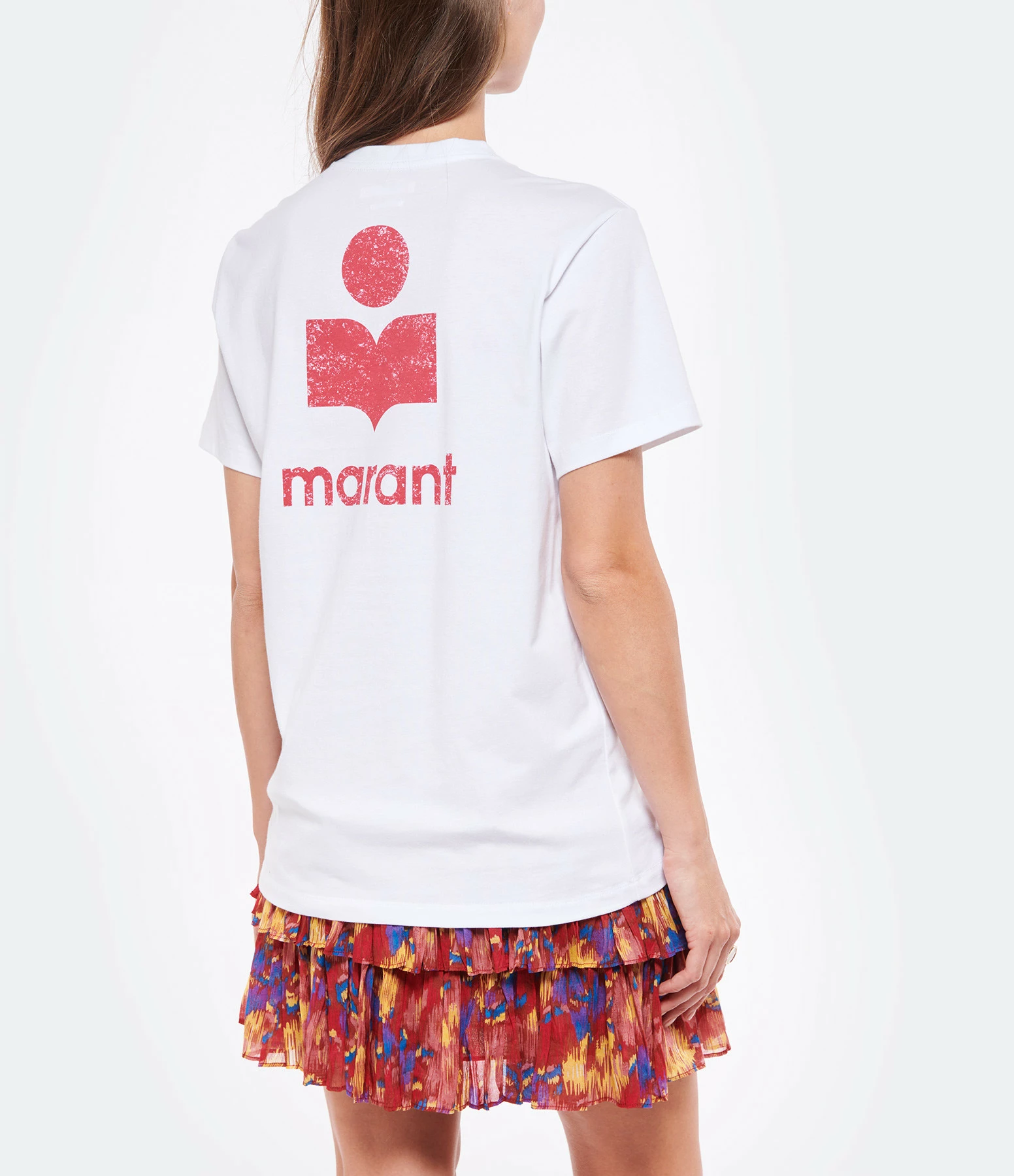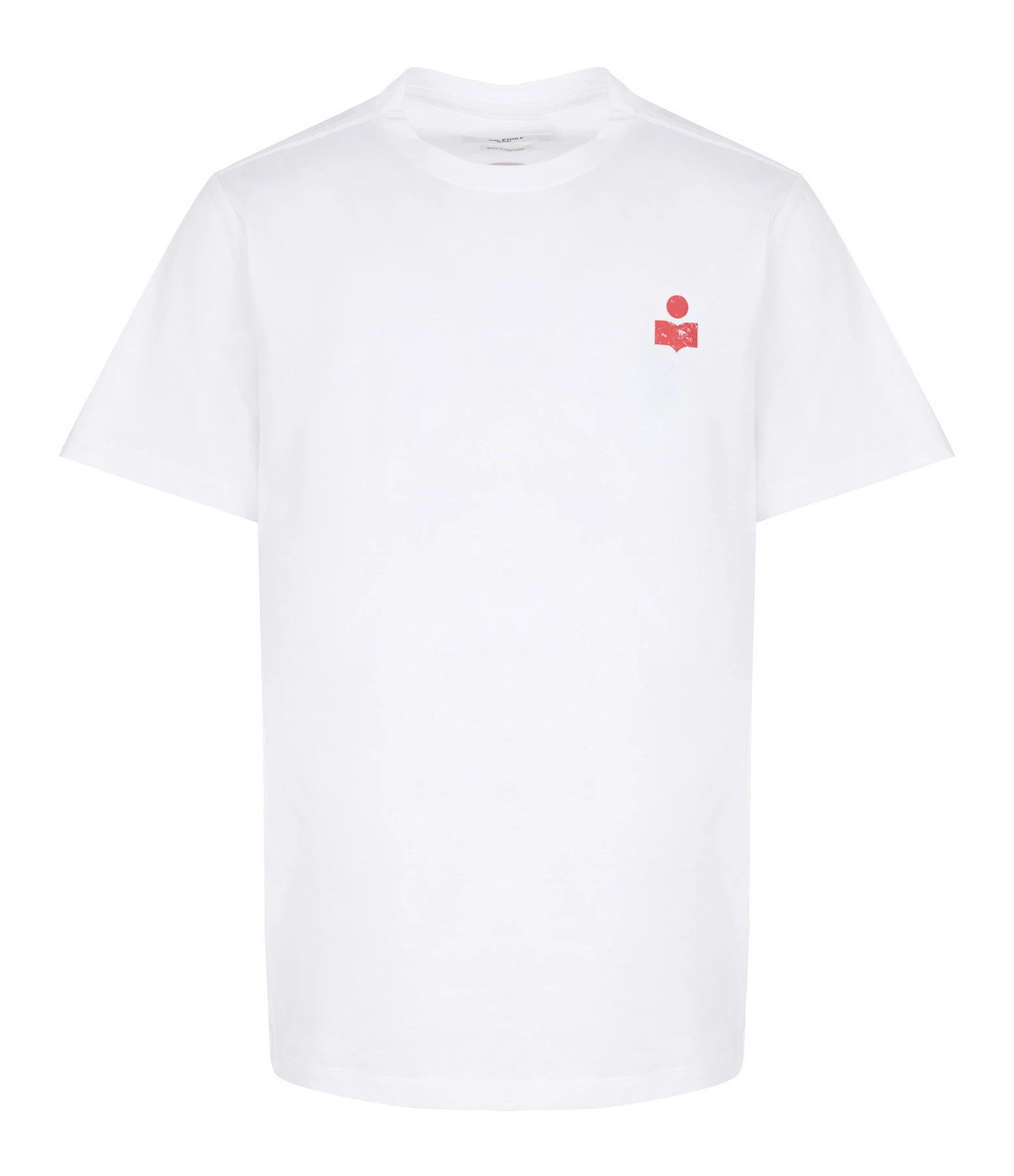 Tee-shirt en coton blanc. Petit logo rouge floqué sur la poitrine et grand logo rouge floqué dans le dos. Col rond. Manches courtes. Coupe droite. Base droite.