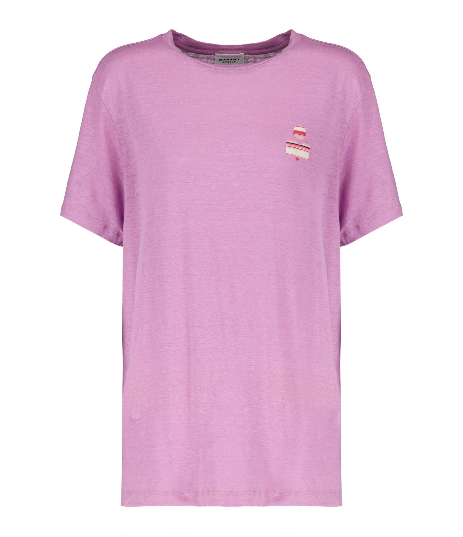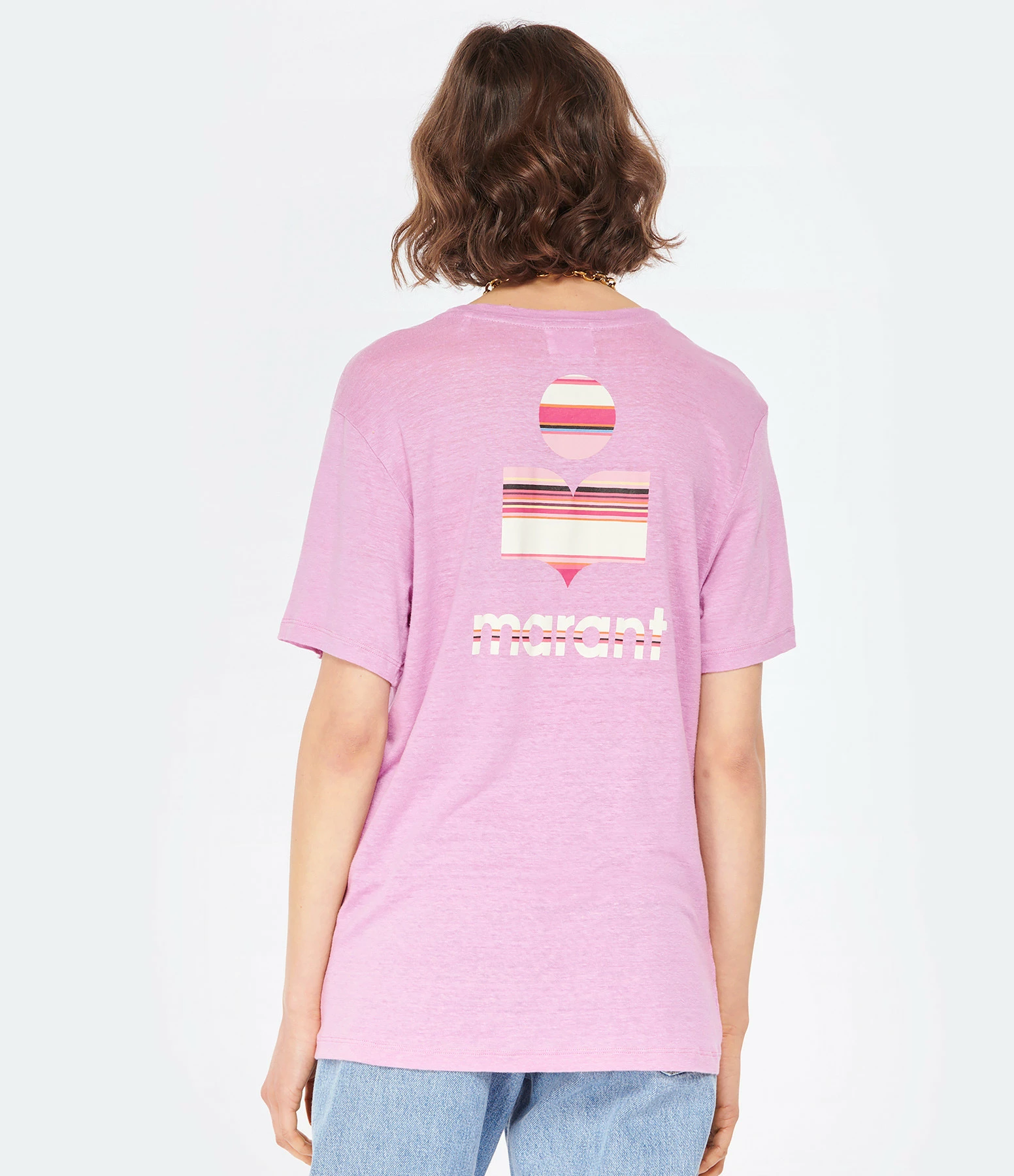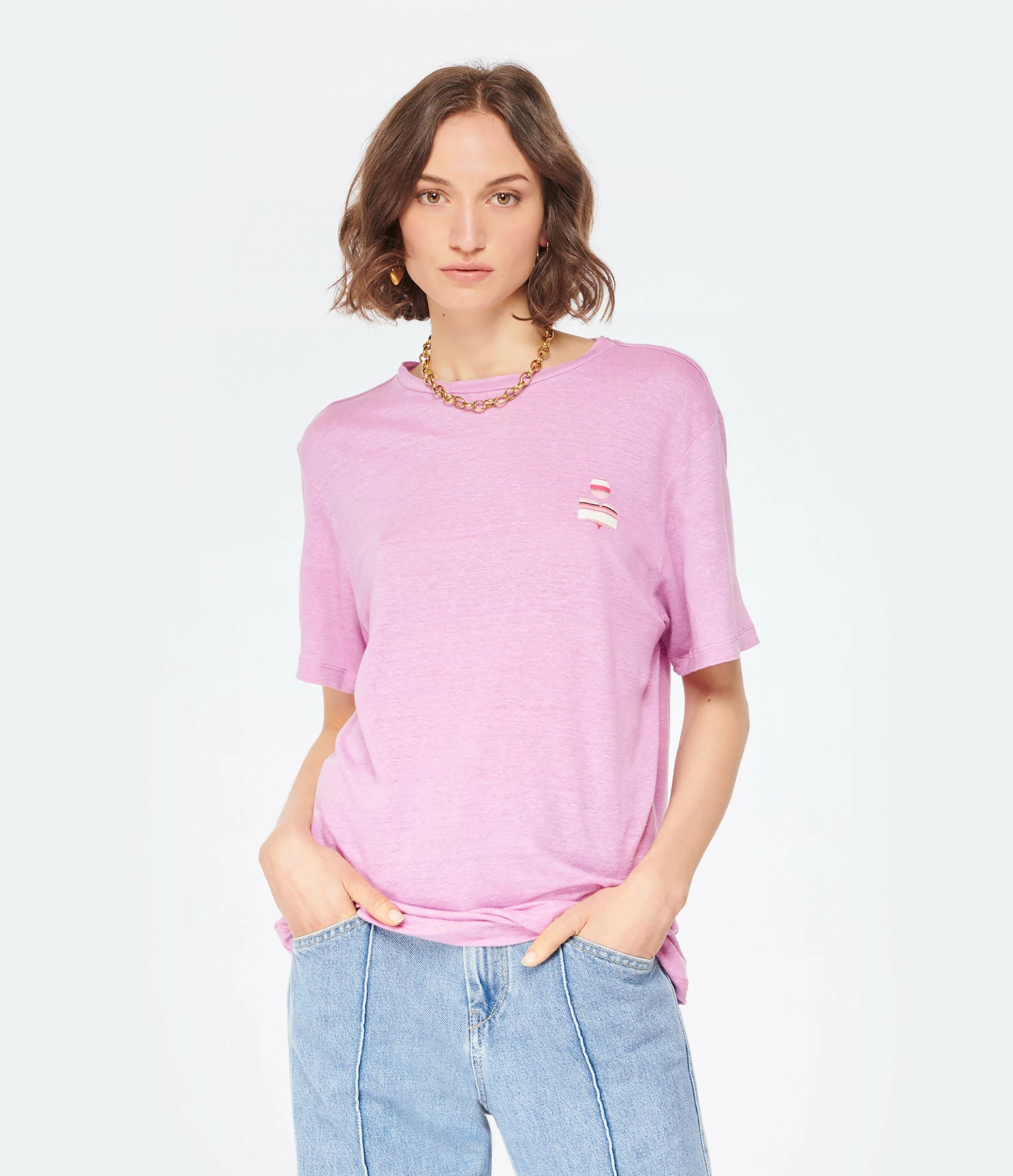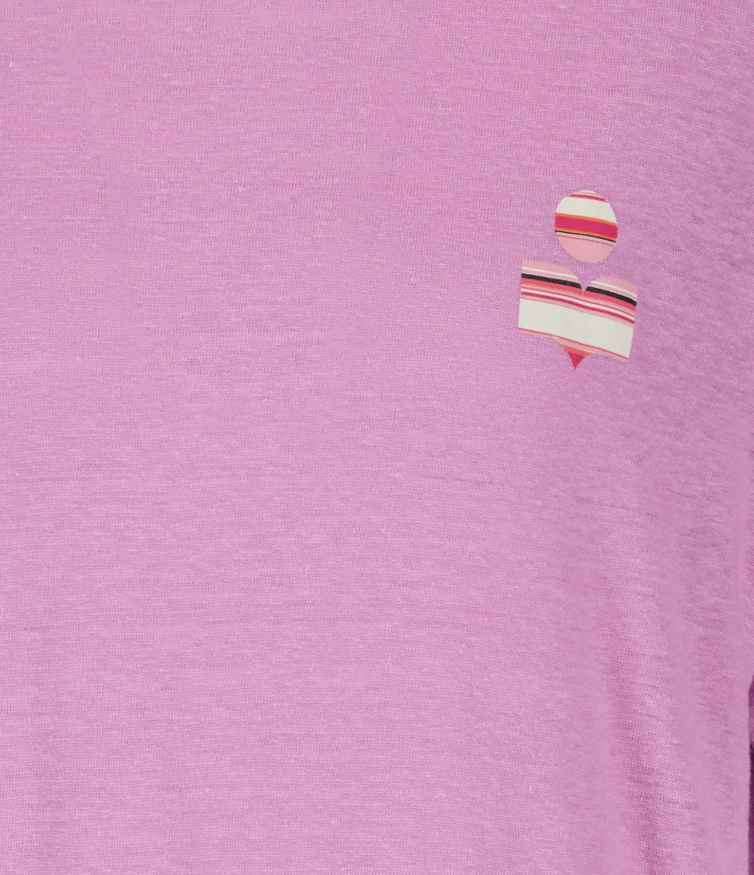 Tee-shirt en lin rose avec le logo à rayures dans des tons roses et beiges flocké sur la poitrine et dans le dos. Col rond côtelé. Manches courtes. Coupe droite. Base droite.