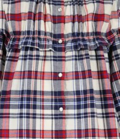 Blouse en cupro écru ornée de fronces. Col officier. Épaules froncées. Manches courtes avec bords rabattus. Demi-patte de boutonnage sur le devant. Petits boutons nacrés. Dos froncé. Coupe ample. Base arrondie.