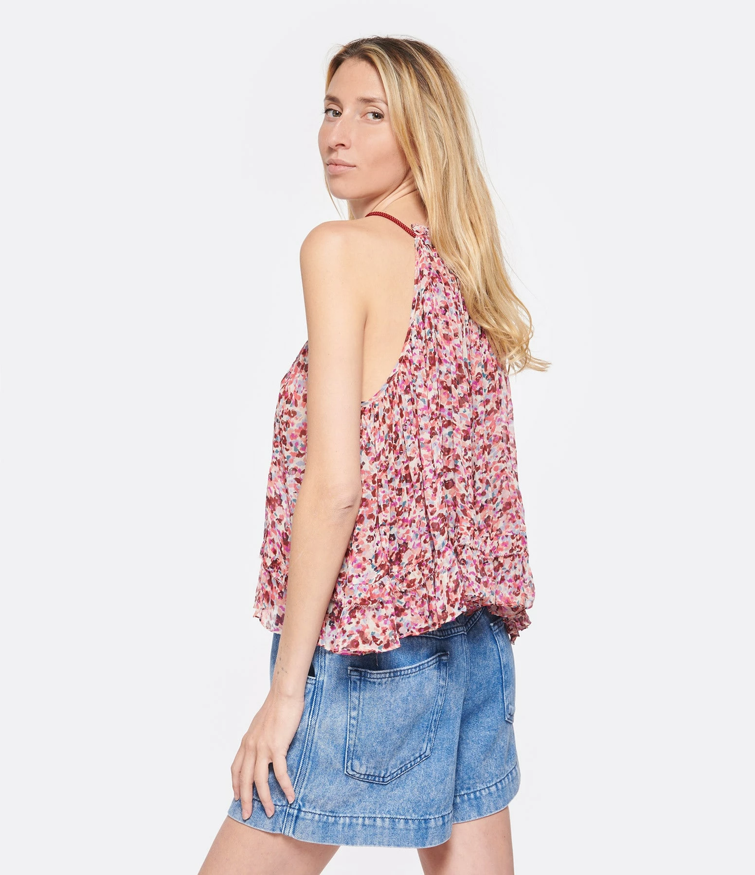 Top à imprimé dans des tons roses orné de fronces et de volants. Col montant à volants avec lien de serrage. Sans manches. Coupe ample. Base asymétrique volantée.