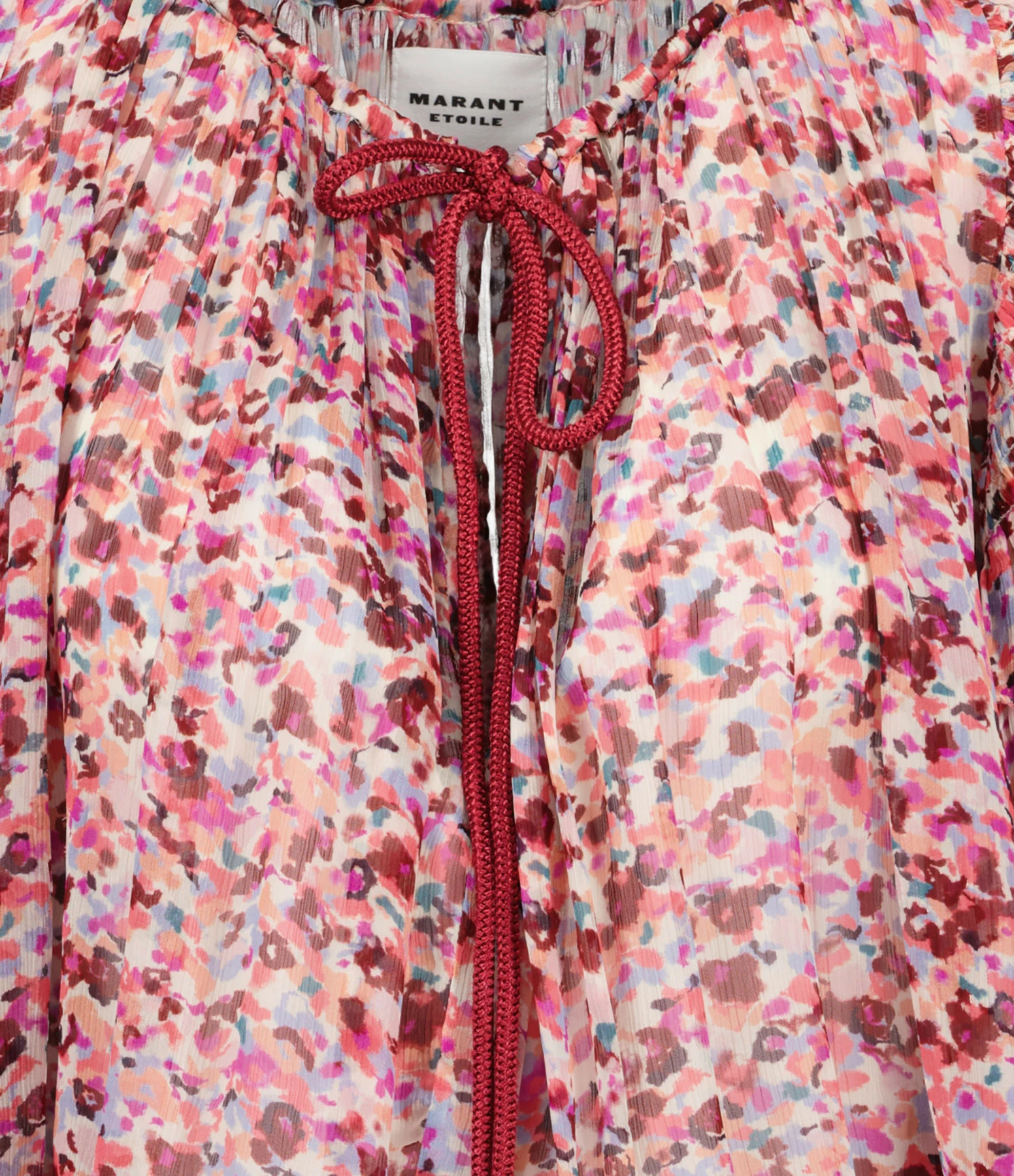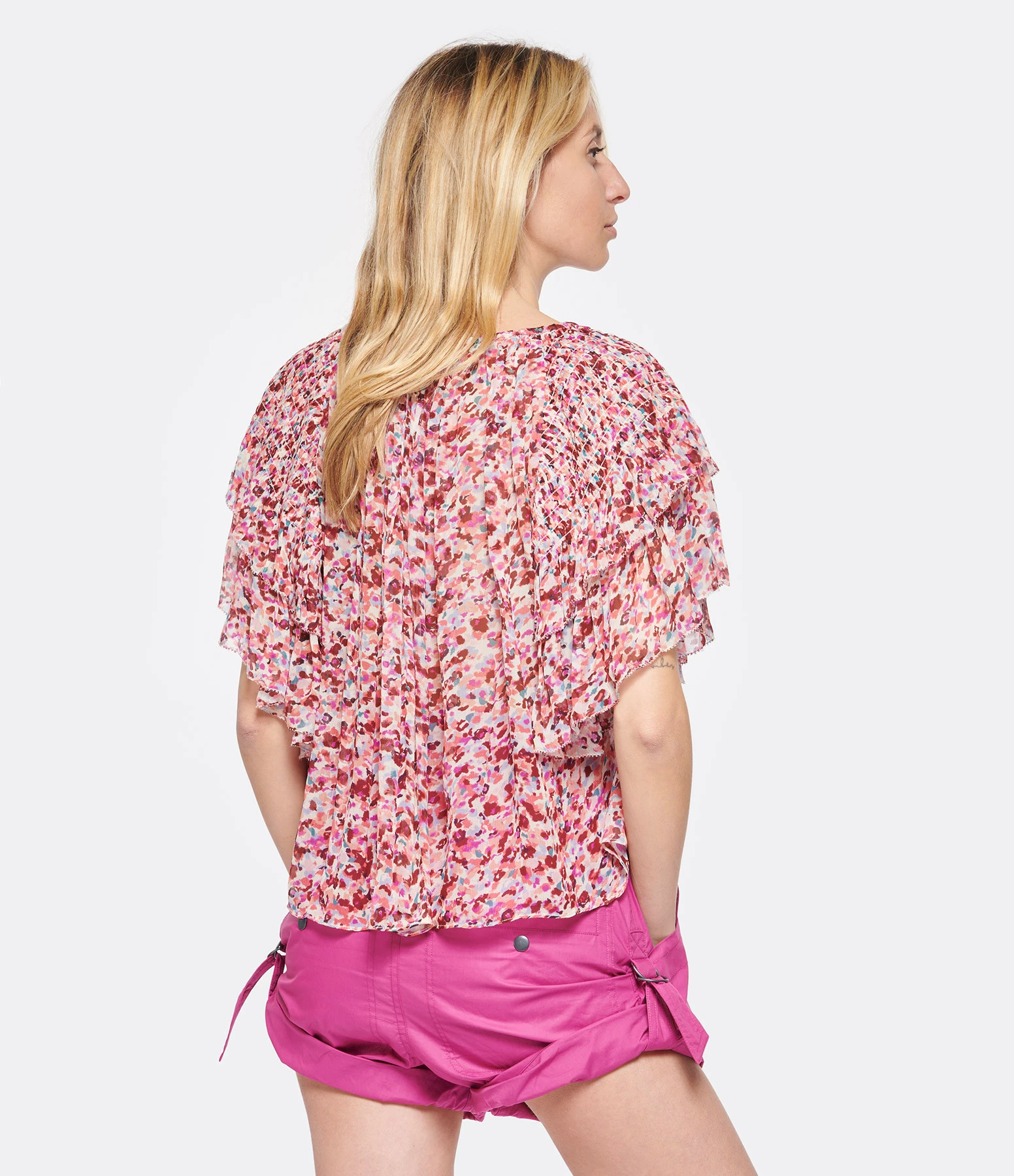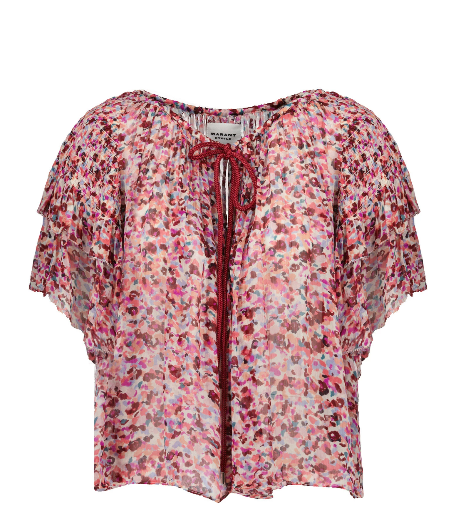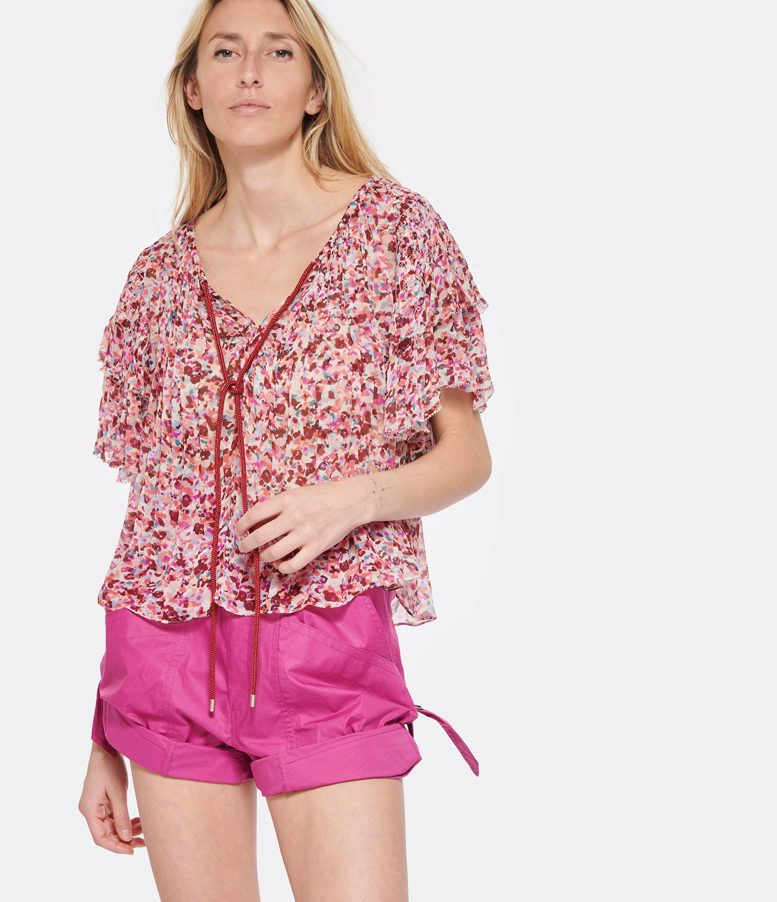 Top froncé à imprimé framboise. Col rond froncé avec lien à nouer framboise. Manches courtes volantées. Coupe ample. Base arrondie.
