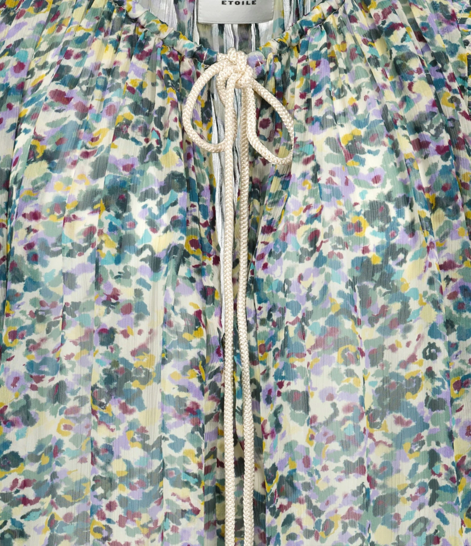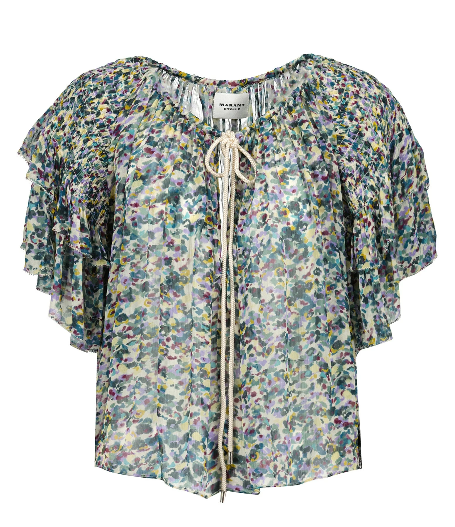 Top froncé à imprimé vert. Col rond froncé avec lien à nouer écru. Manches courtes volantées. Coupe ample. Base arrondie.