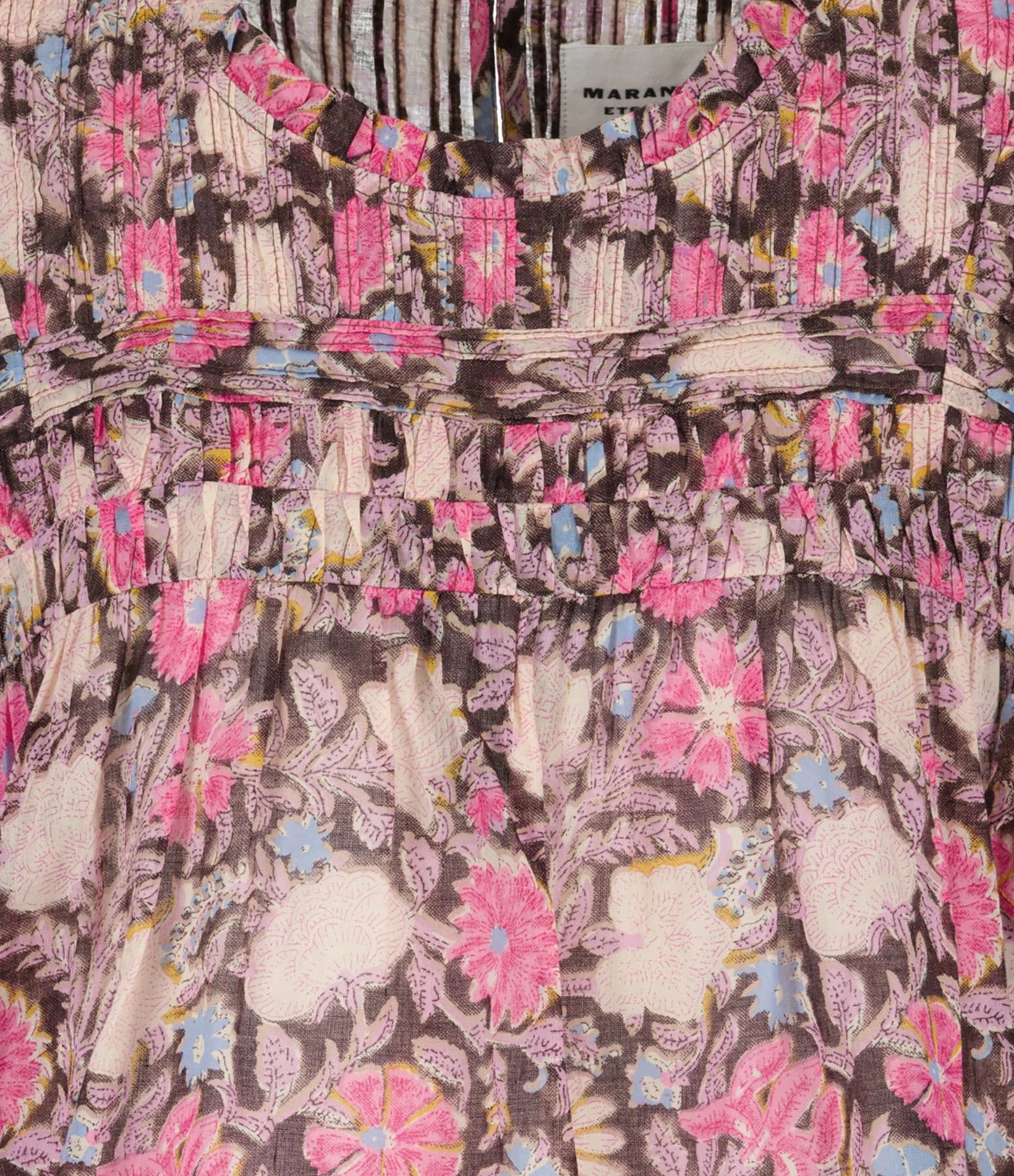 Top en coton fleuri dans les tons roses. Col rond plissé. Sans manches. Volants au niveau des coutures épaules. Plissé sur le devant et le dos. Fermeture boutonnée dans le dos. Base droite. Coupe droite. Non doublé.