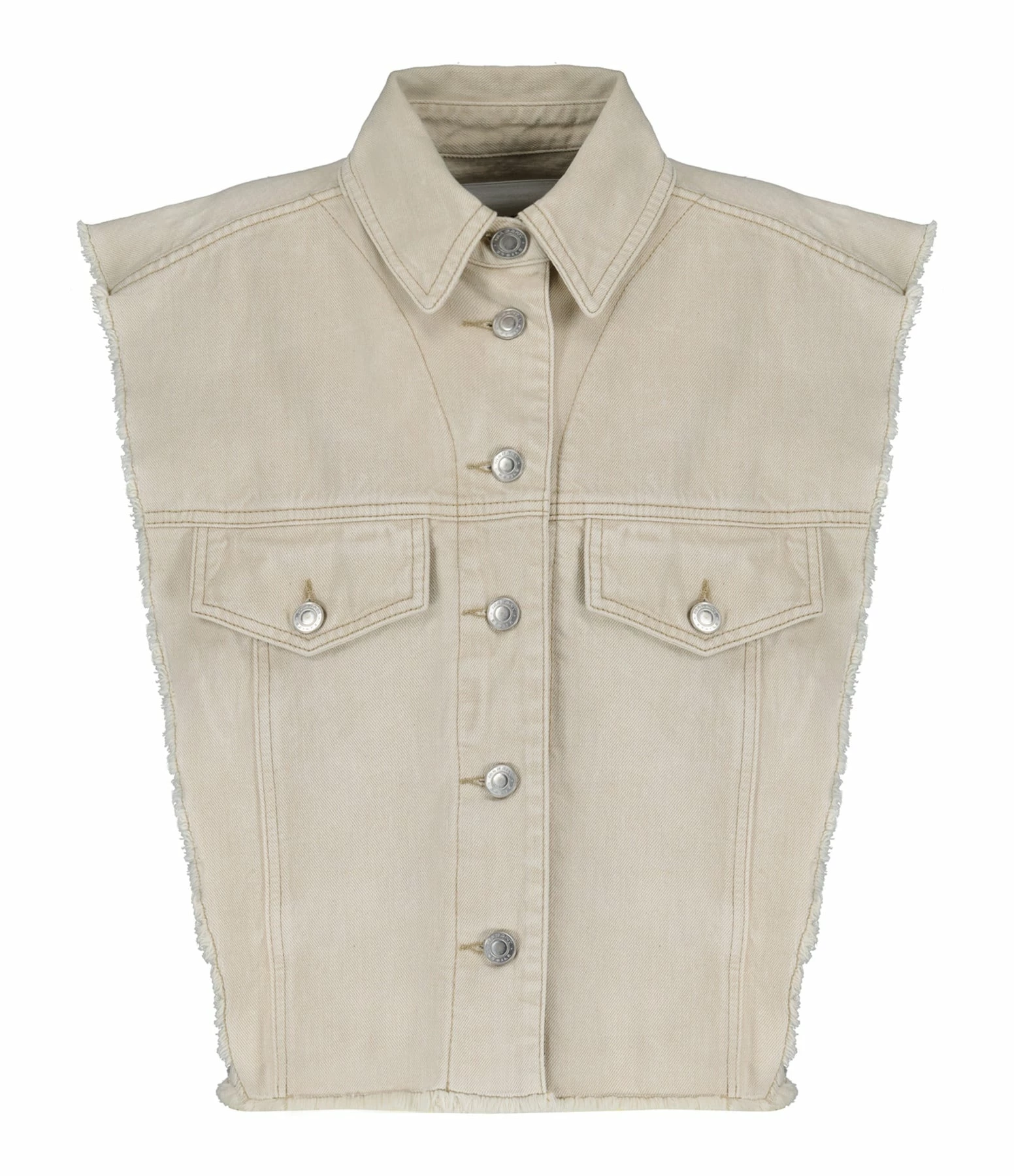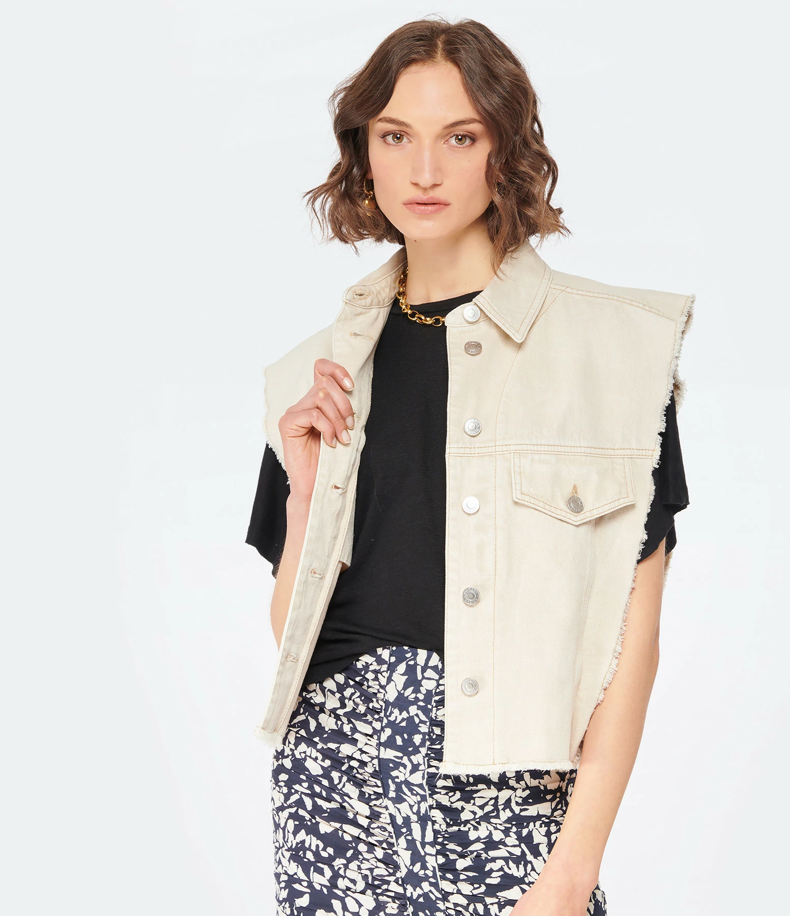 Veste en denim de coton écru. Col chemise. Sans manches. Fermeture boutonnée sur le devant. Boutons métalliques argentés. Deux poches à rabat boutonné sur le devant. Coupe droite. Base droite coupée à cru.