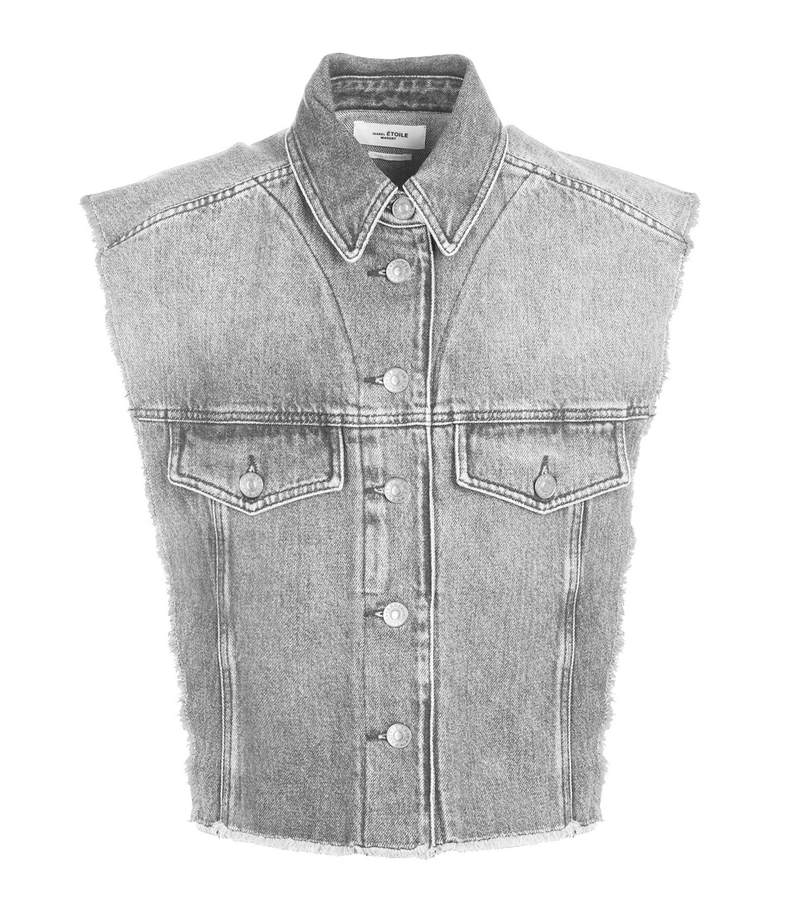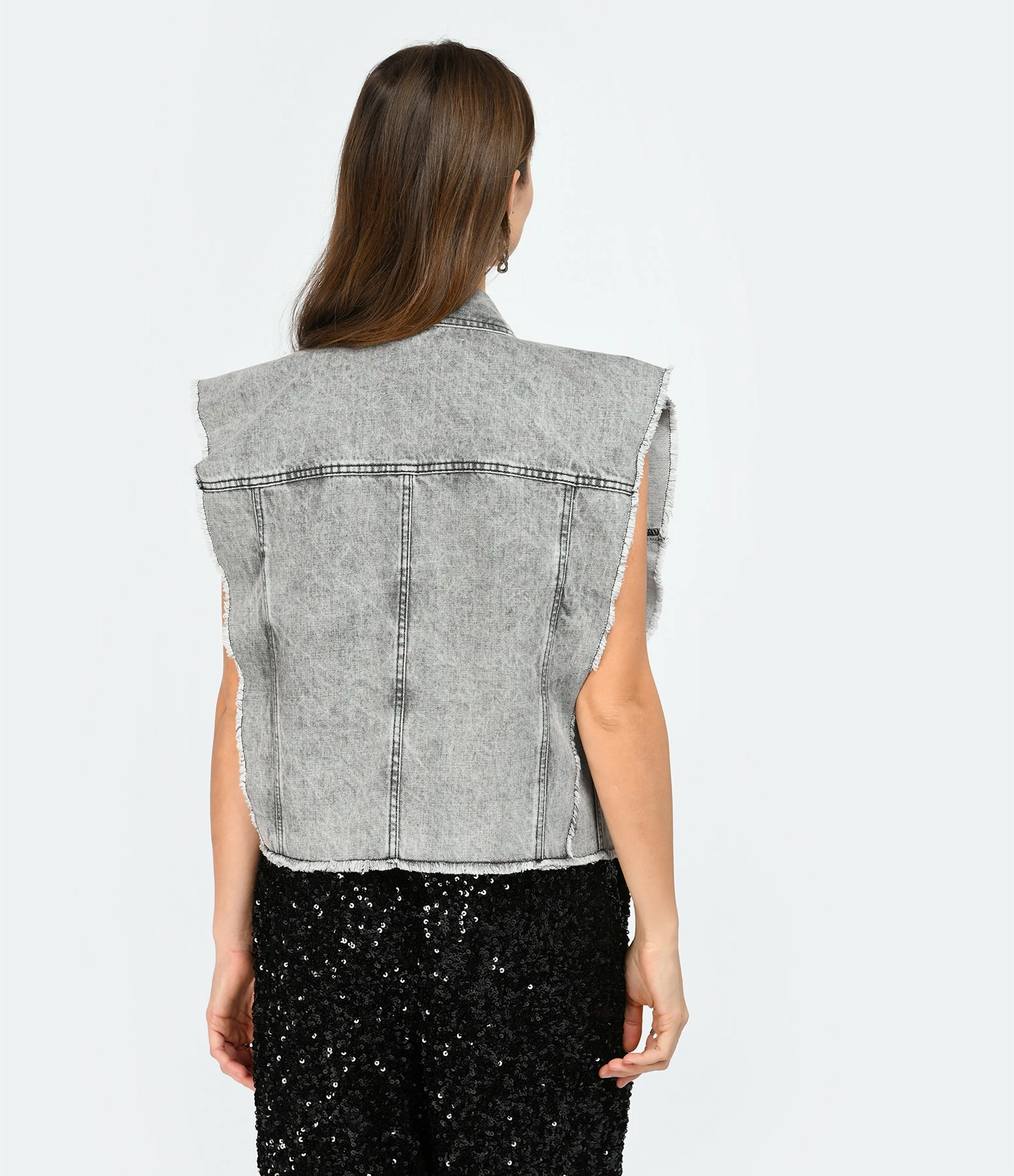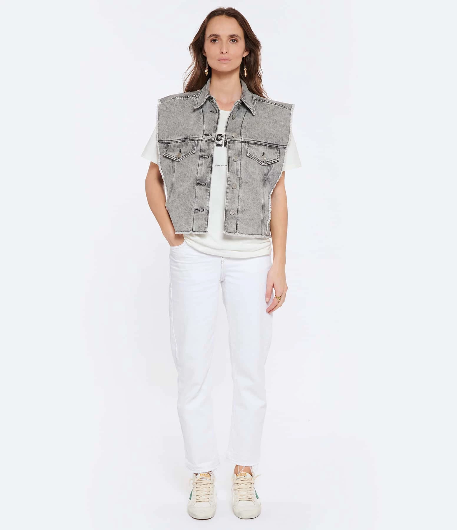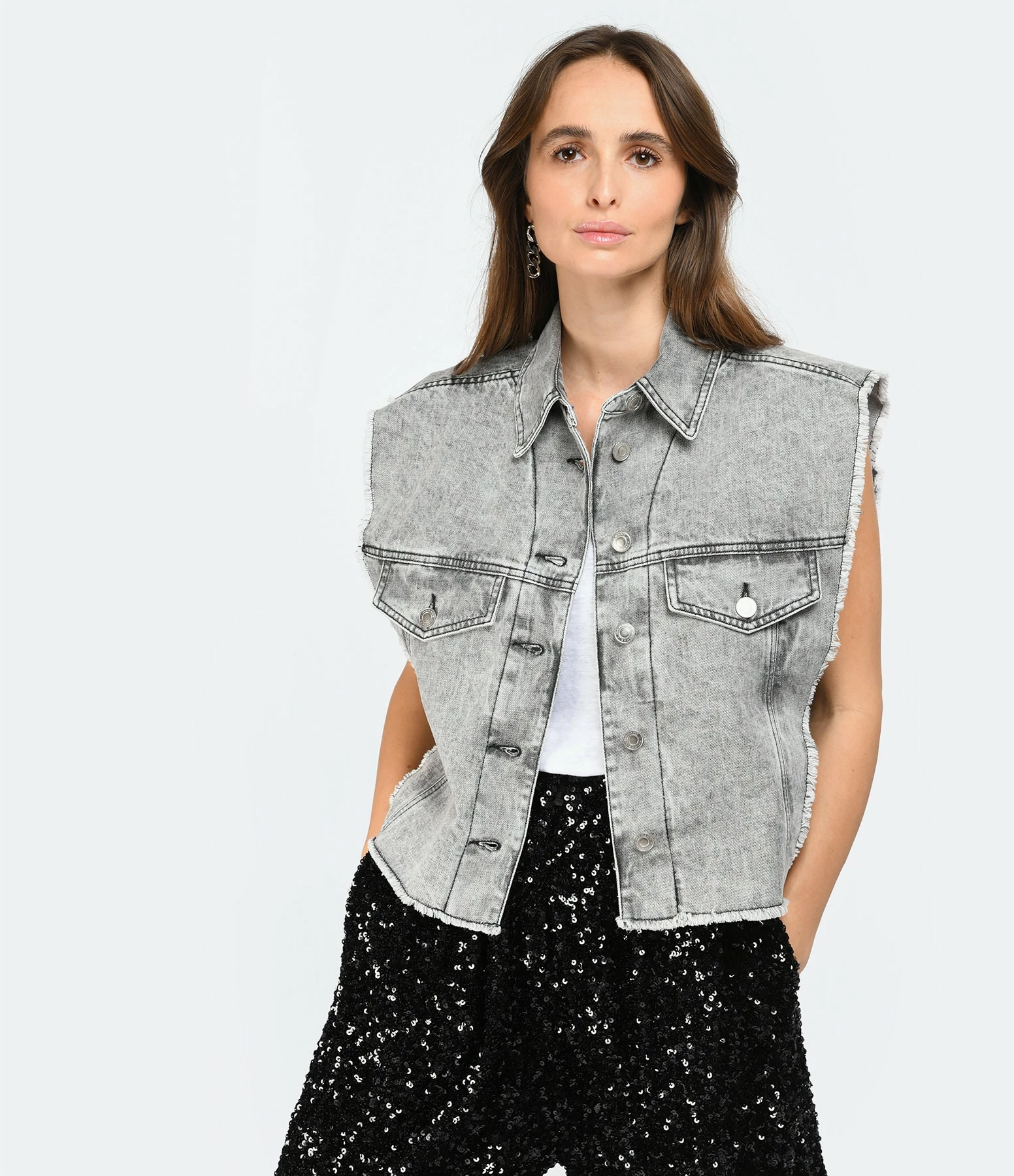 Veste en denim de coton gris clair. Col chemise. Sans manches. Fermeture boutonnée sur le devant. Boutons métalliques argentés. Deux poches à rabat boutonné sur le devant. Coupe droite. Base droite coupée à cru.