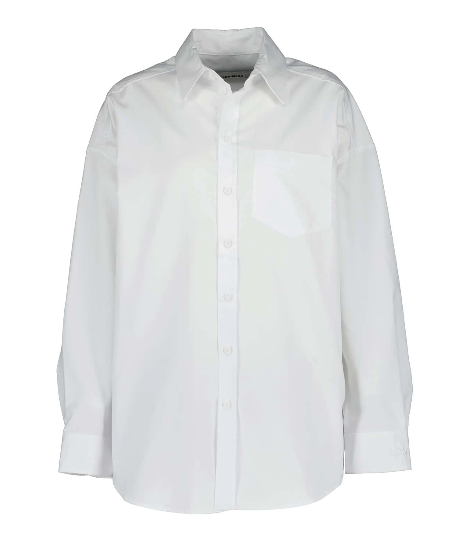 Chemise en coton blanc. Col chemisier. Manches longues avec fentes et poignets boutonnés. Logo brodée en blanc sur le poignet. Fermeture boutonnée sur le devant. Boutons blancs. Une poche plaquée poitrine. Un pli creux dans le dos. Coupe droite ample. Base arrondie.