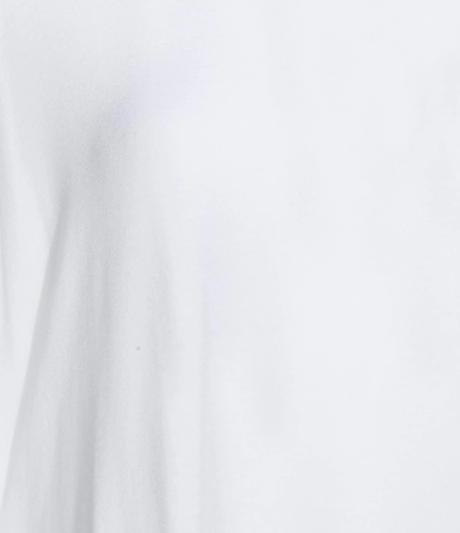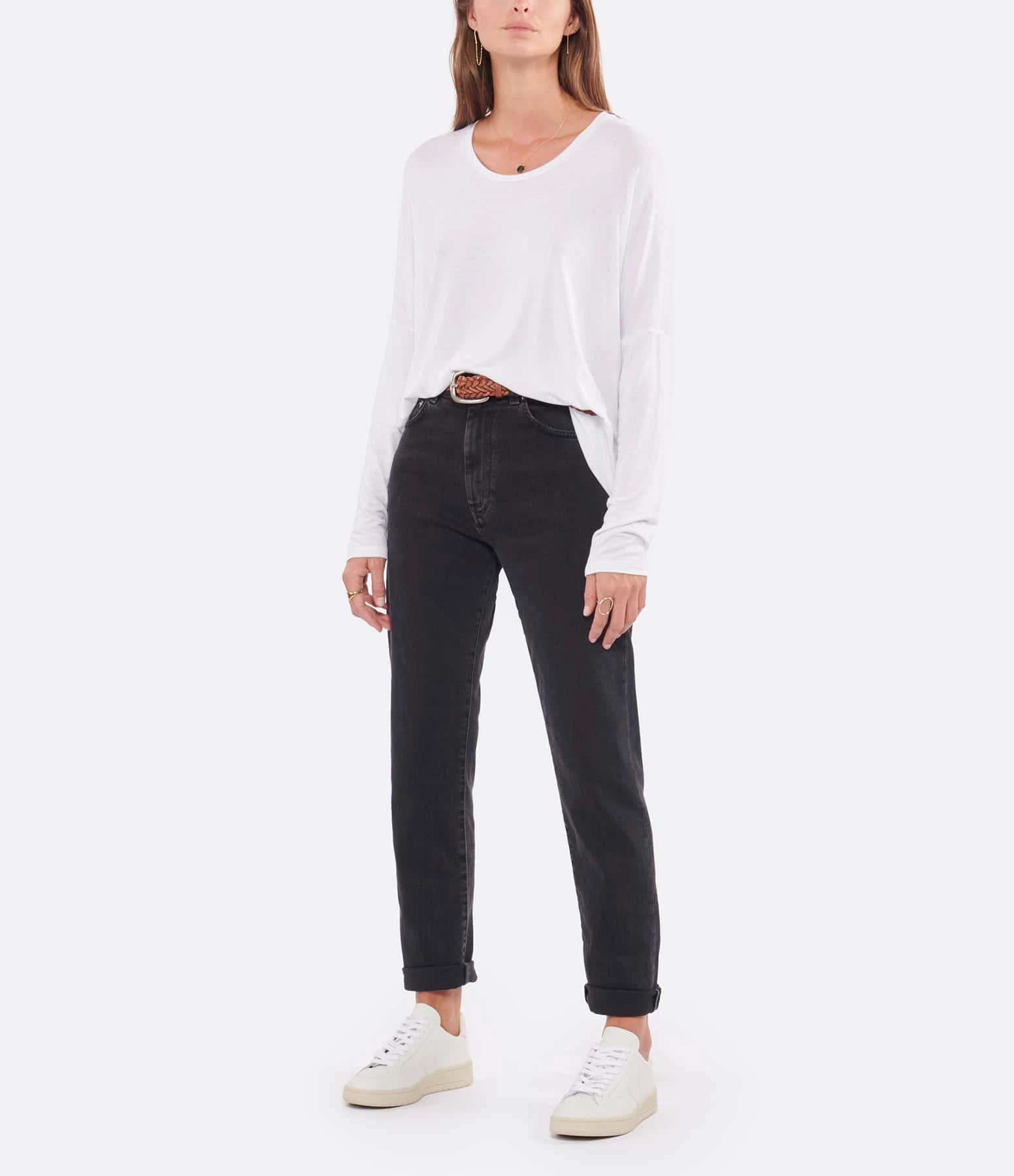Tee-shirt fluide blanc. Col rond. Manches longues. Coupe ample. Base droite, plus longue et arrondie à l’arrière. Non doublé.