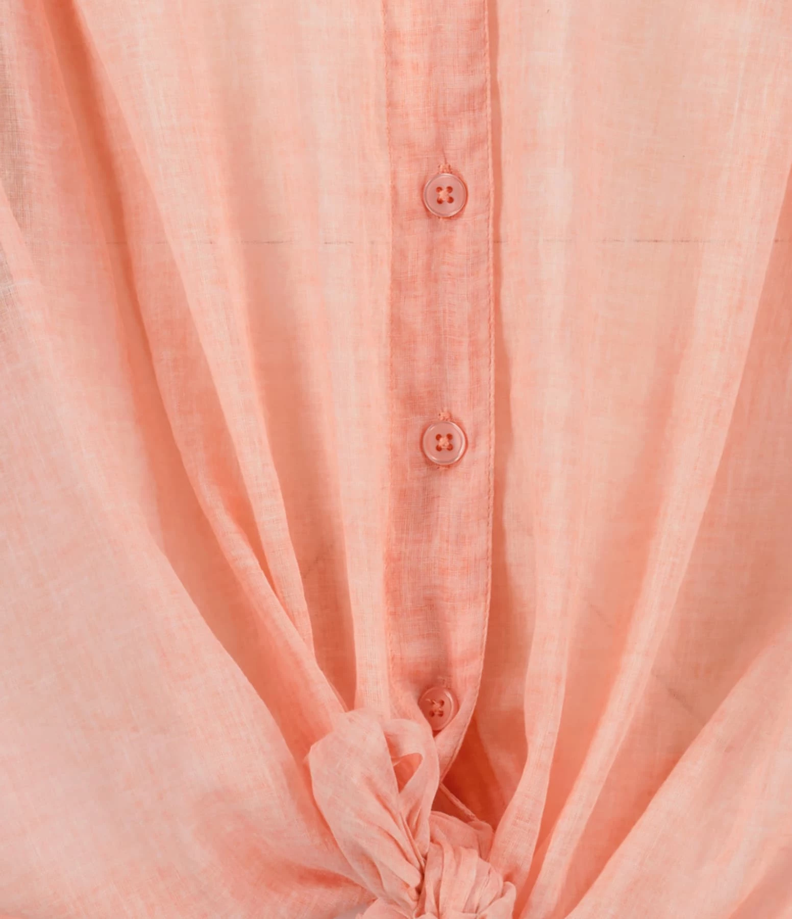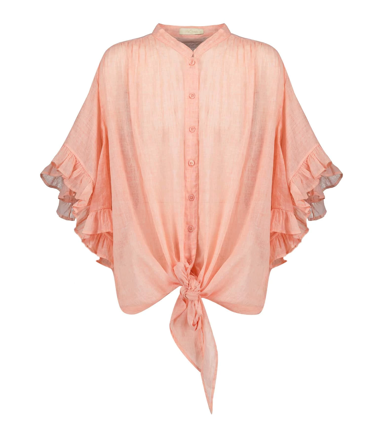 Blouse fluide en coton rose. Manches trois-quarts à volants. Bas de la blouse à nouer ou à tourner autour de la taille façon cache-cœur. Col rond. Fermeture par boutons sur le devant.