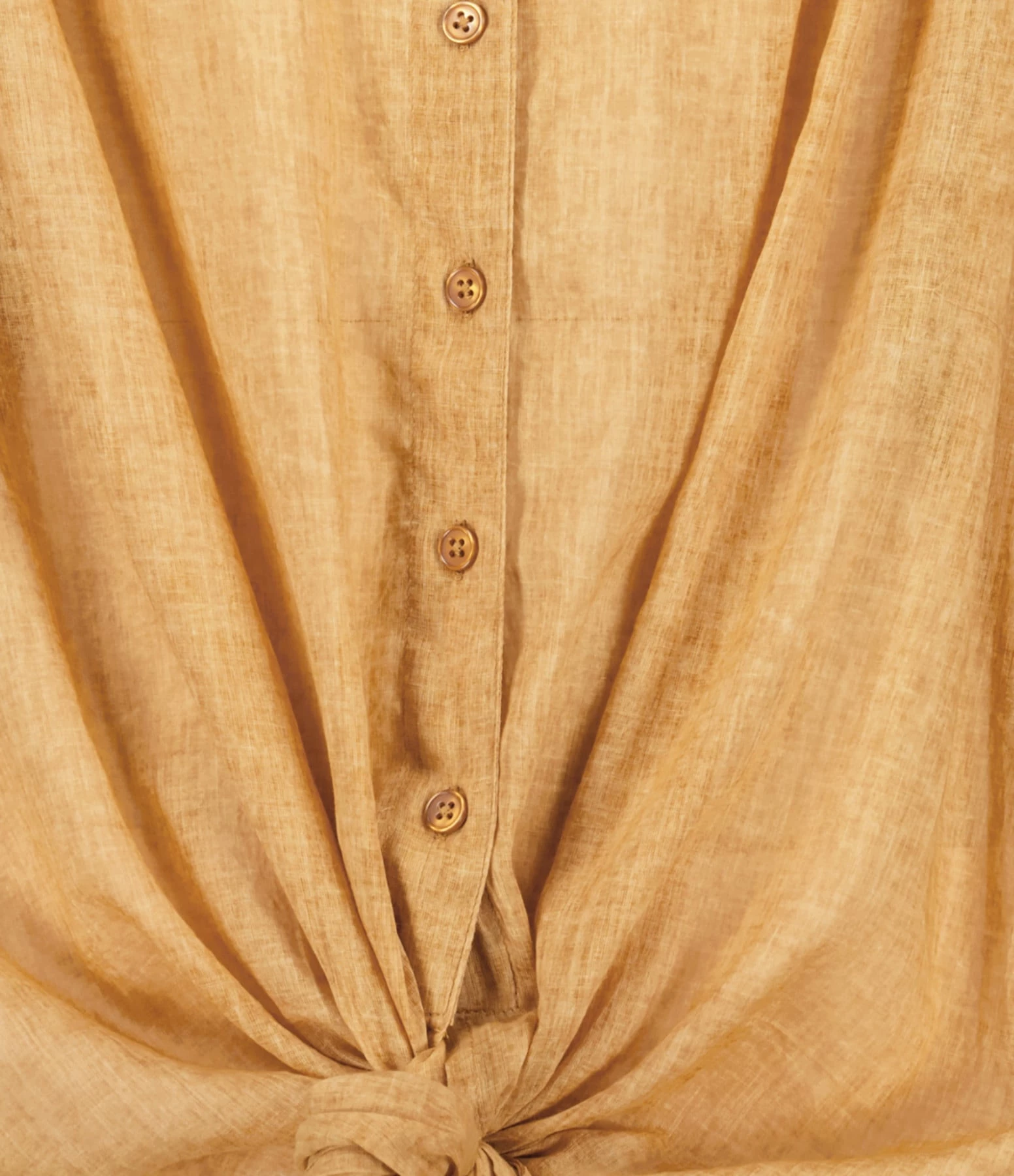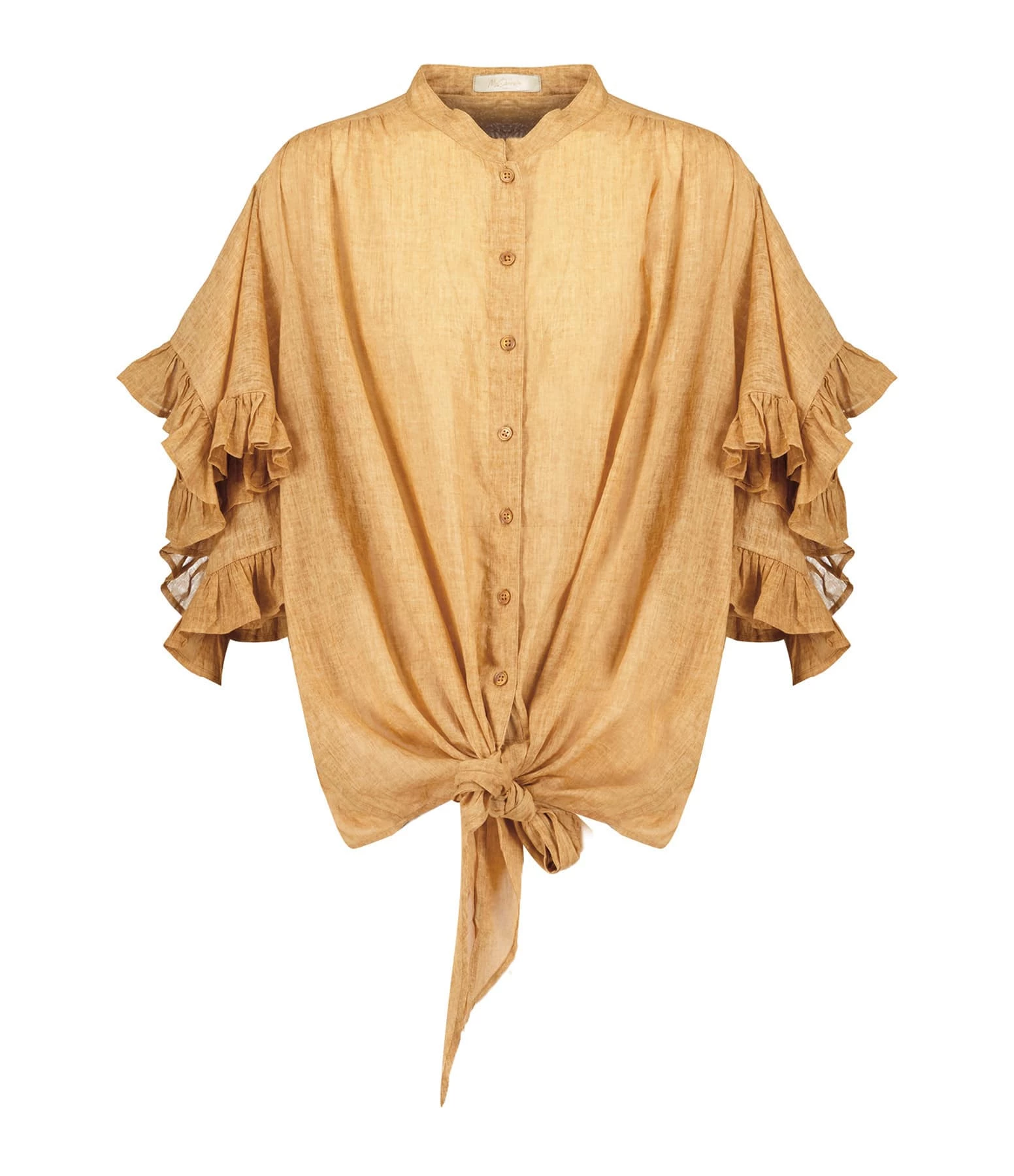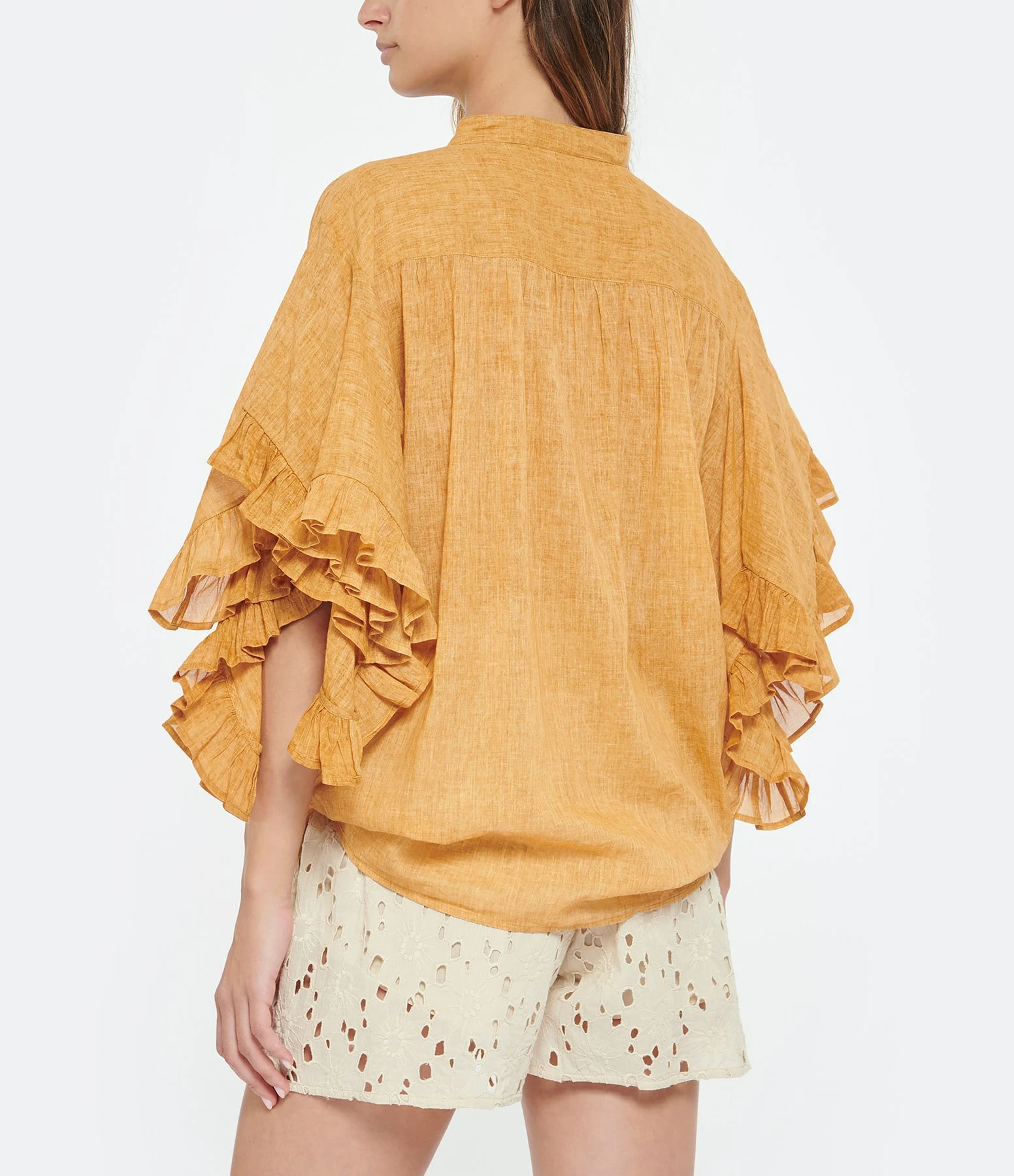 Blouse fluide en coton orange. Manches trois-quarts à volants. Bas de la blouse à nouer ou à tourner autour de la taille façon cache-cœur. Col rond. Fermeture par boutons sur le devant.