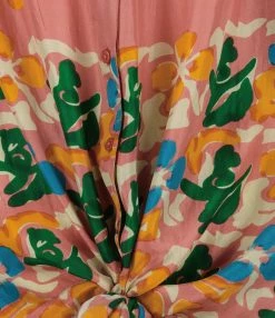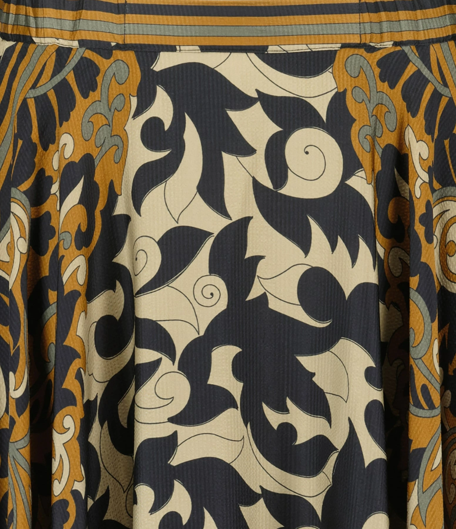 Jupe longue en tissu fluide à imprimé à motif floral dans des tons marron. Taille élastiquée. Deux poches prises dans les coutures latérales. Coupe évasée. Base droite. Non doublée.