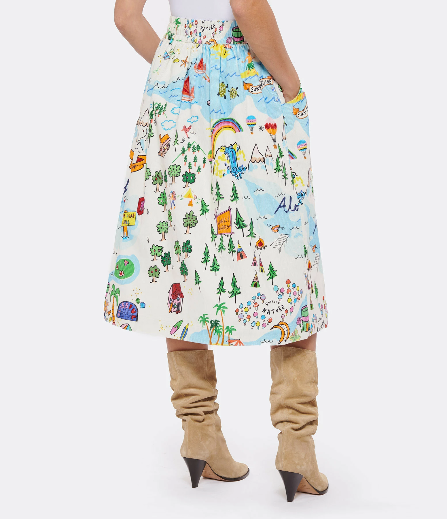 Jupe midi en velours côtelé de coton blanc imprimé multicolore. Taille élastiquée froncée avec cordons de serrage. Deux poches italiennes sur le devant. Coupe évasée. Base droite. Non doublée.