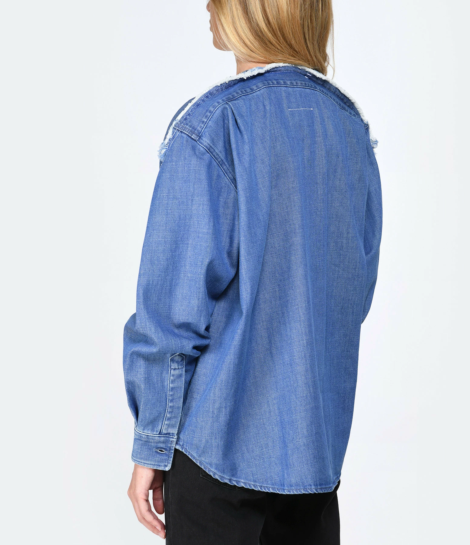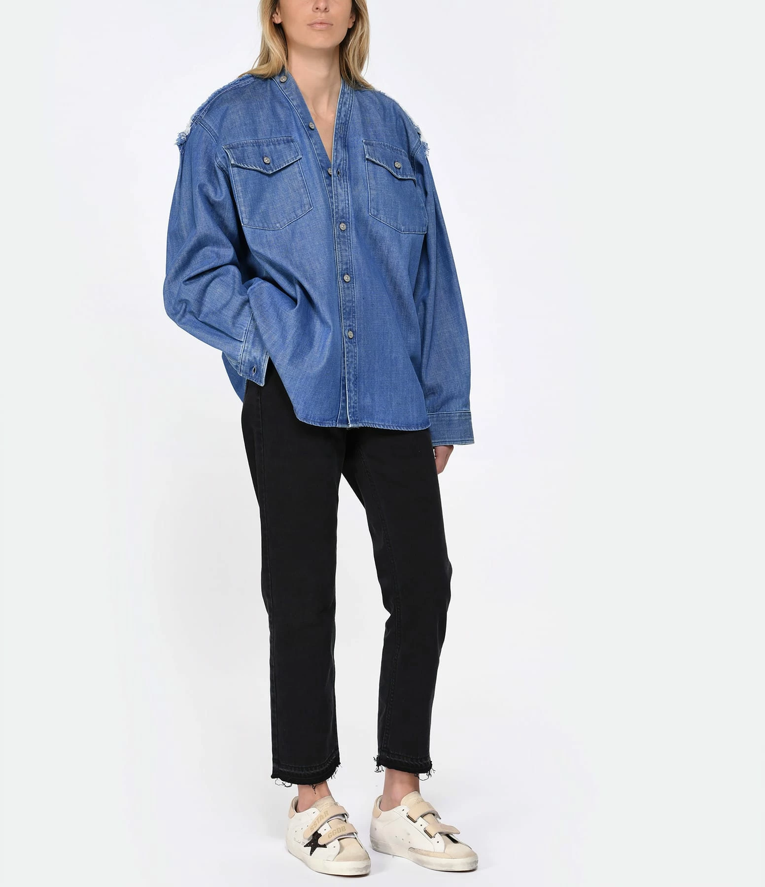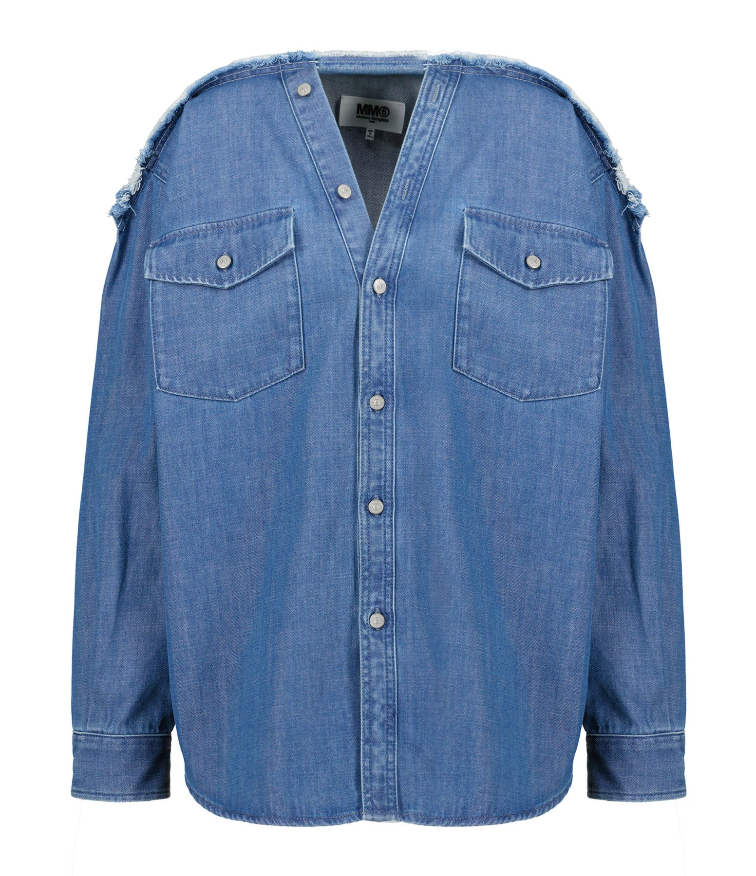 Chemise en denim de coton bleu. Haut coupé à cru. Fermeture par boutons métalliques sur le devant. Deux poches plaquées poitrine. Manches longues. Coupe droite. Base arrondie.