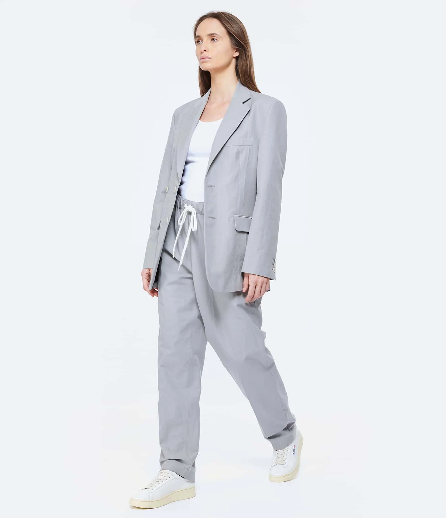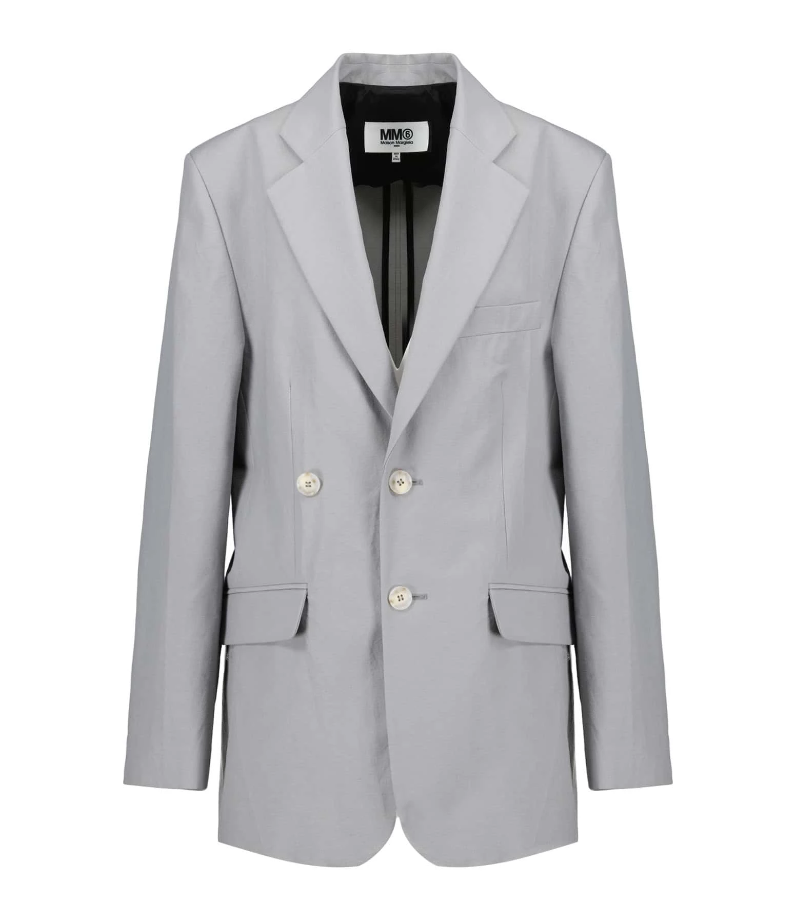 Veste de blazer en coton et soie grise. Col à rabat. Manches longues. Fermeture boutonnée. Poches à rabat. Une poche passepoilée. Coupe droite. Base arrondie. Doublée.