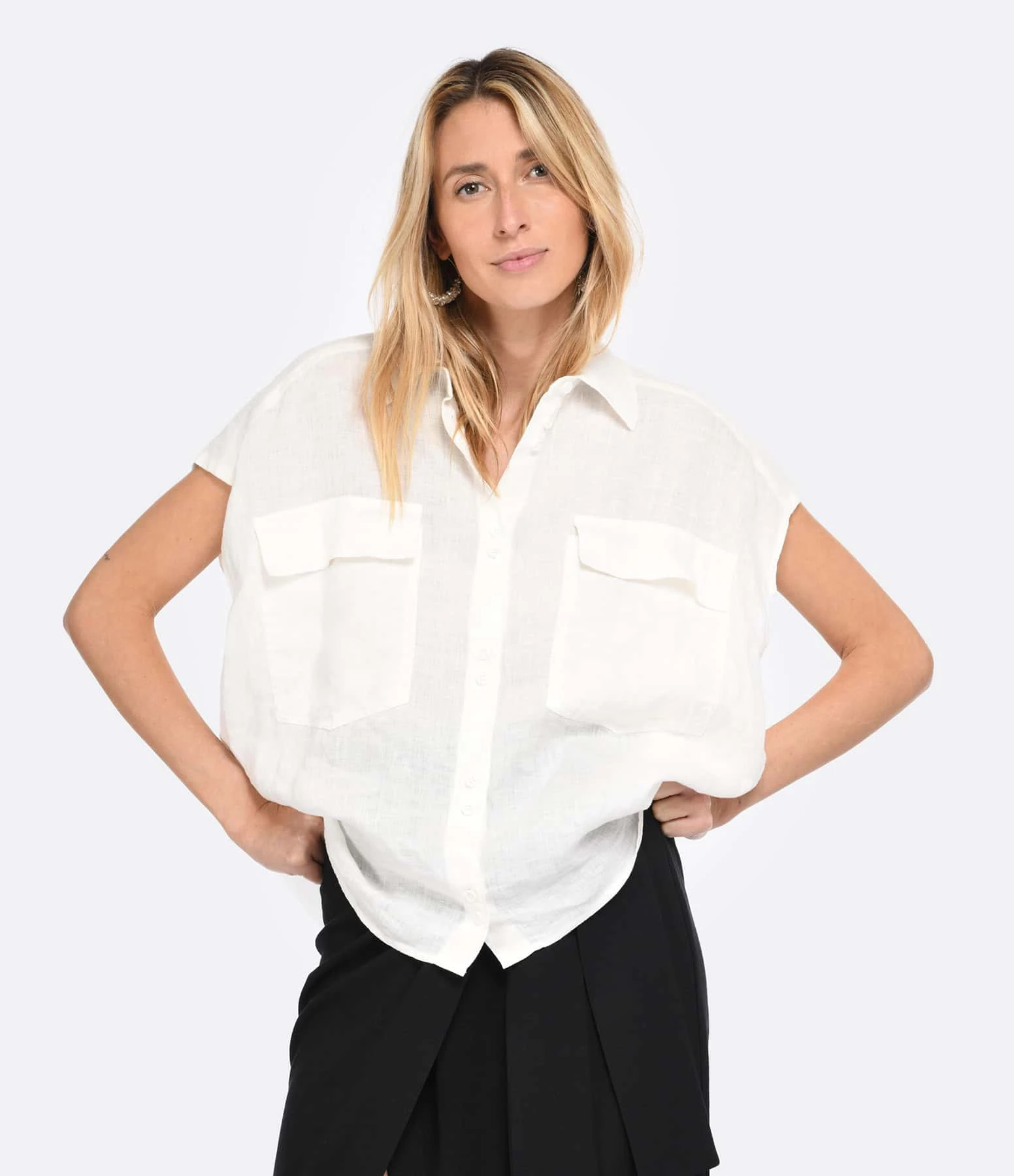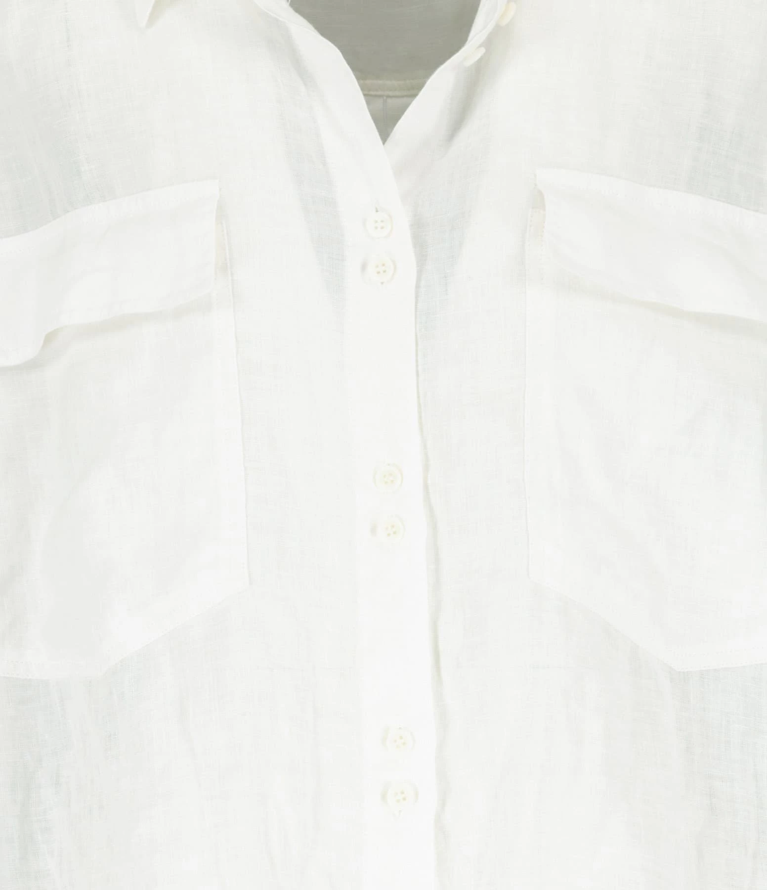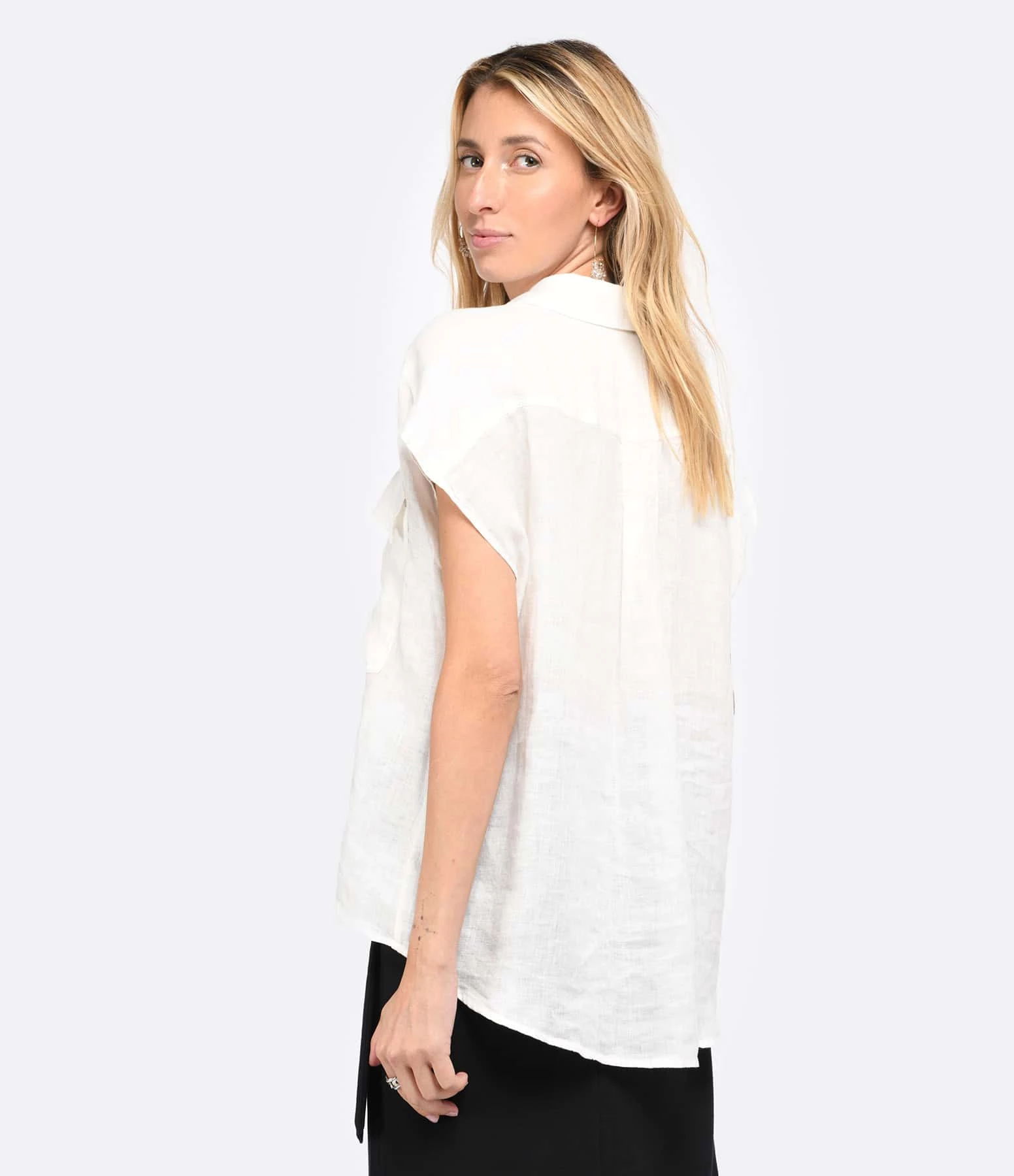 Chemise en lin blanc. Col chemisier. Manches courtes. Fermeture par boutons. Coupe droite. Base arrondie, légèrement plus longue à l’arrière. Non doublée.