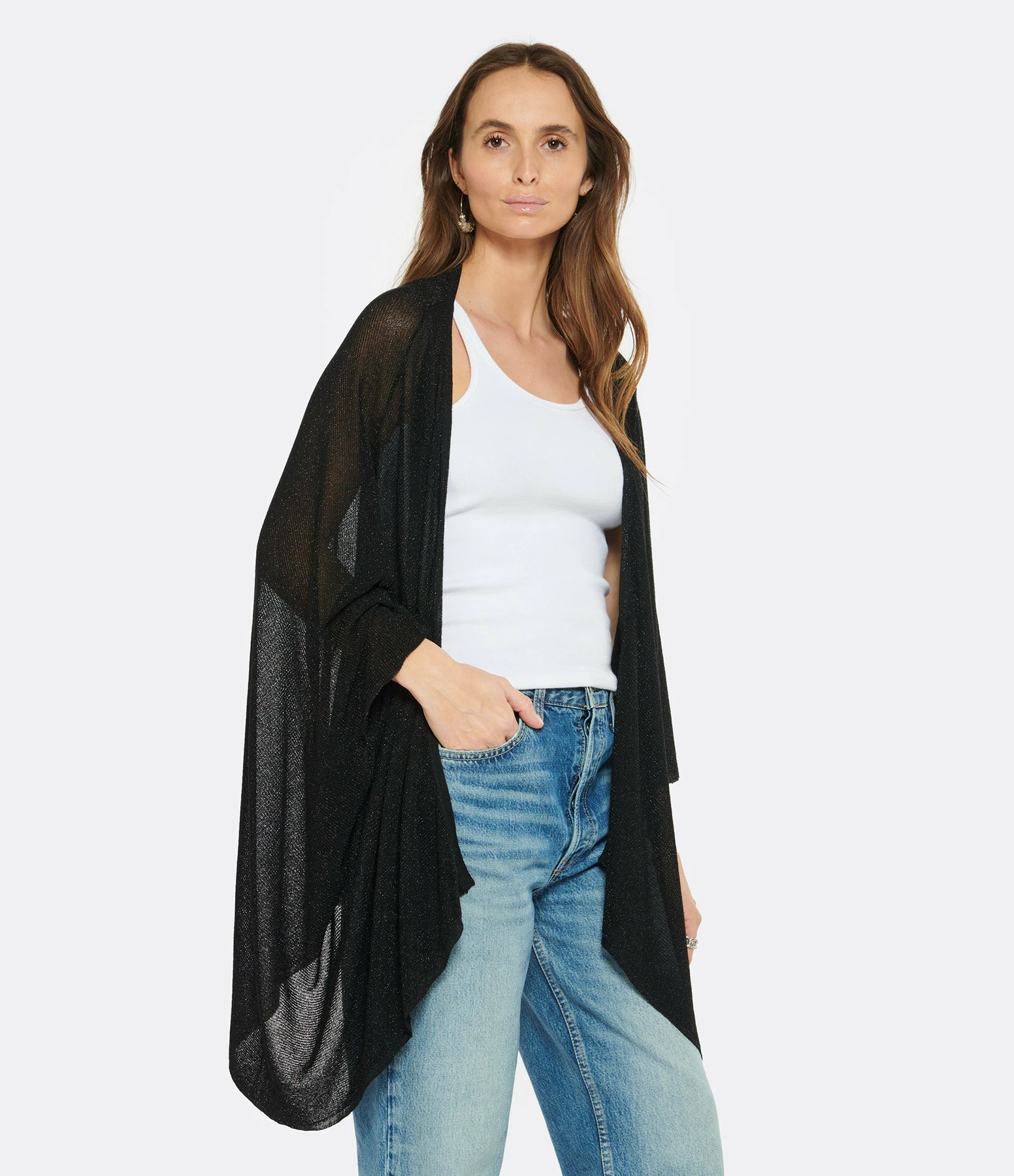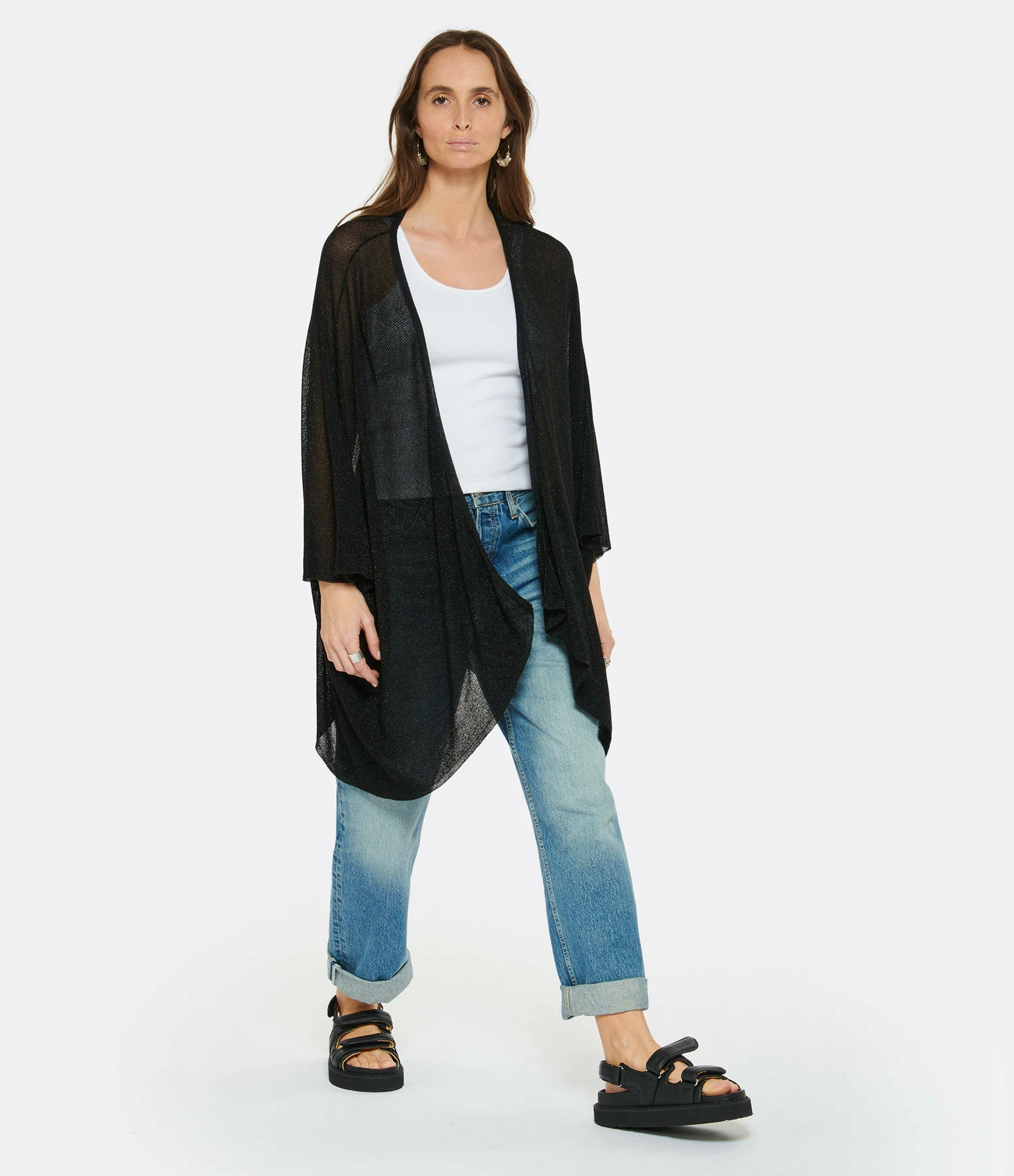 Gilet noir avec effet pailleté. Manches trois-quarts large. Effet de transparence. Coupe droite. Base droite.