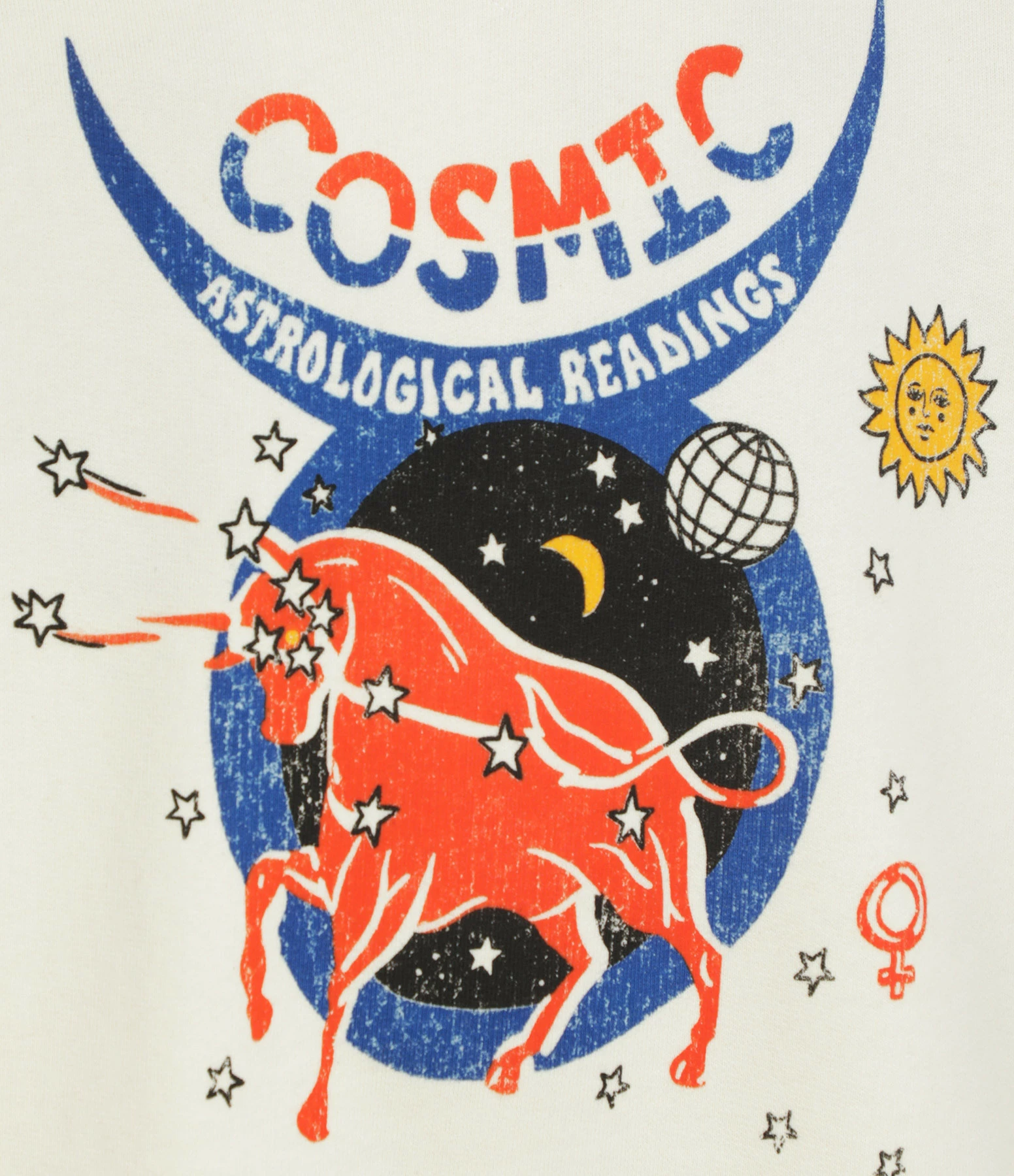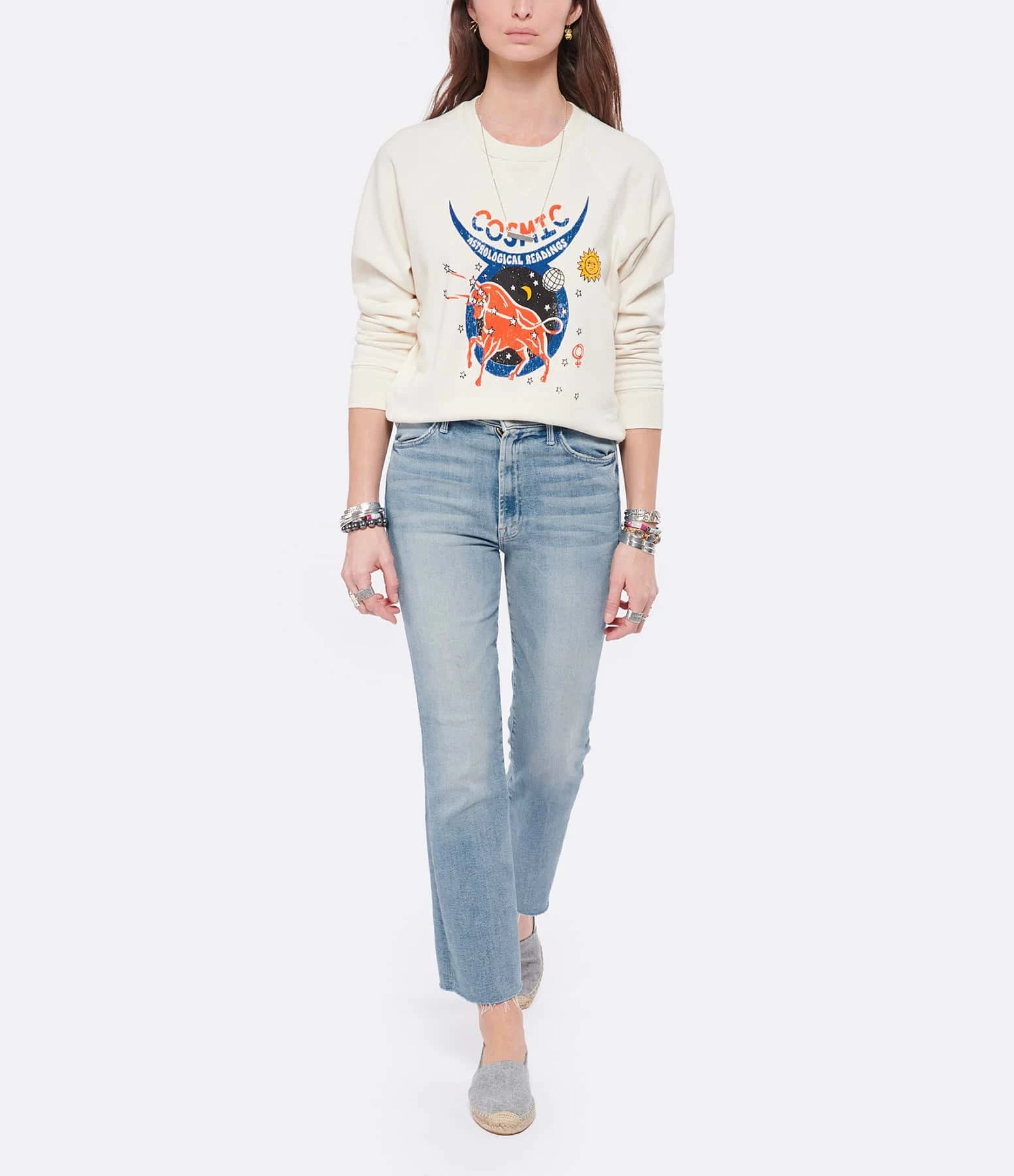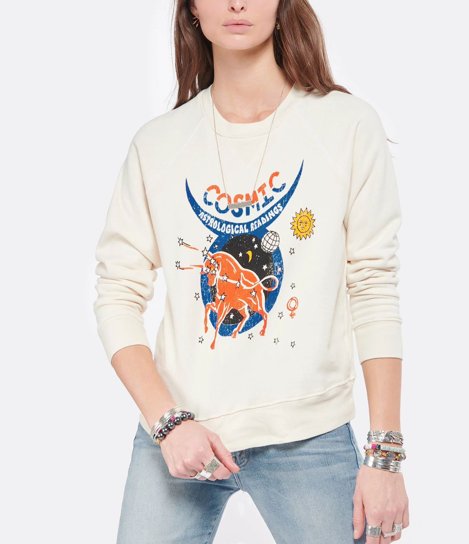 Sweatshirt en coton écru. Sérigraphie multicolore floquée à l’avant. Col rond. Manches longues. Coupe droite. Base droite.