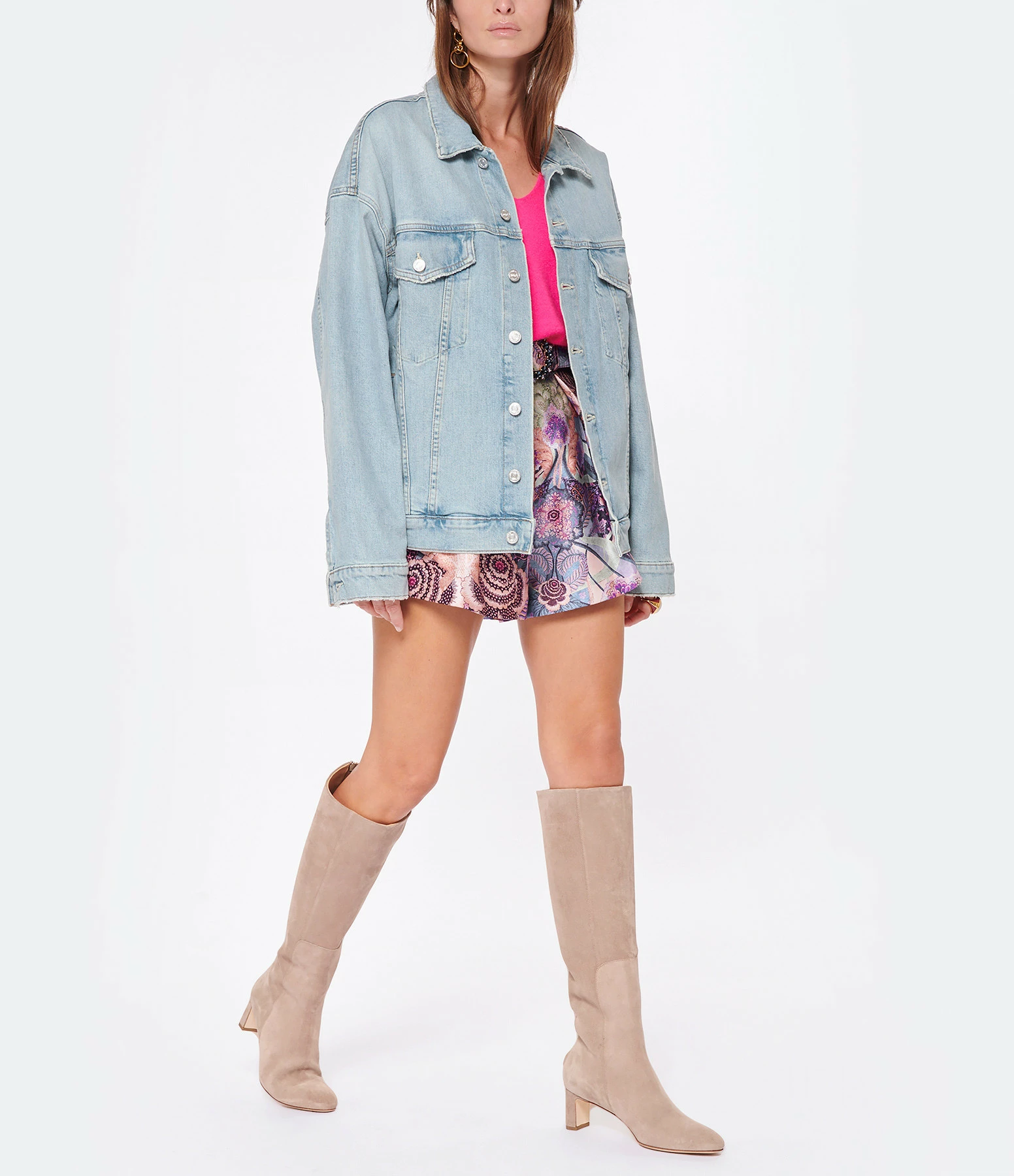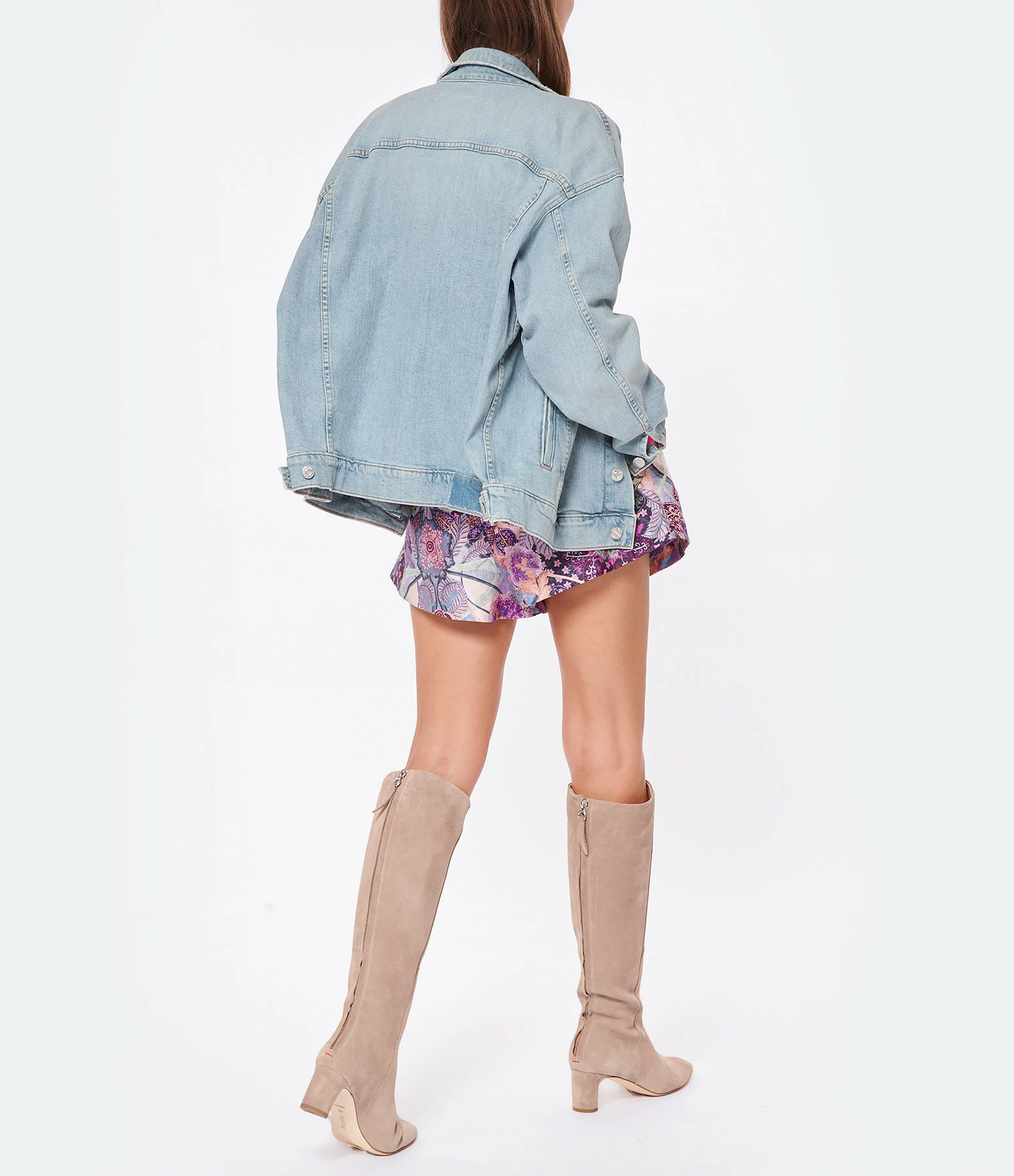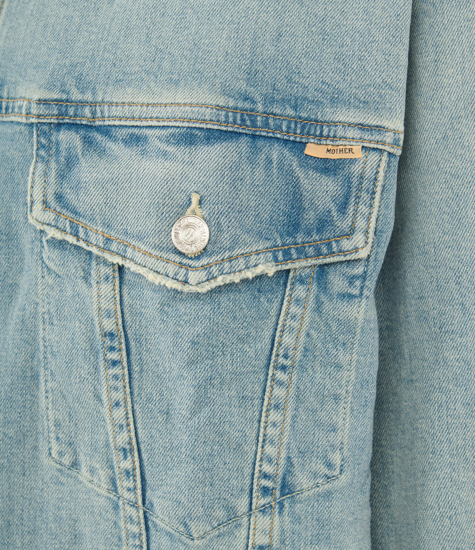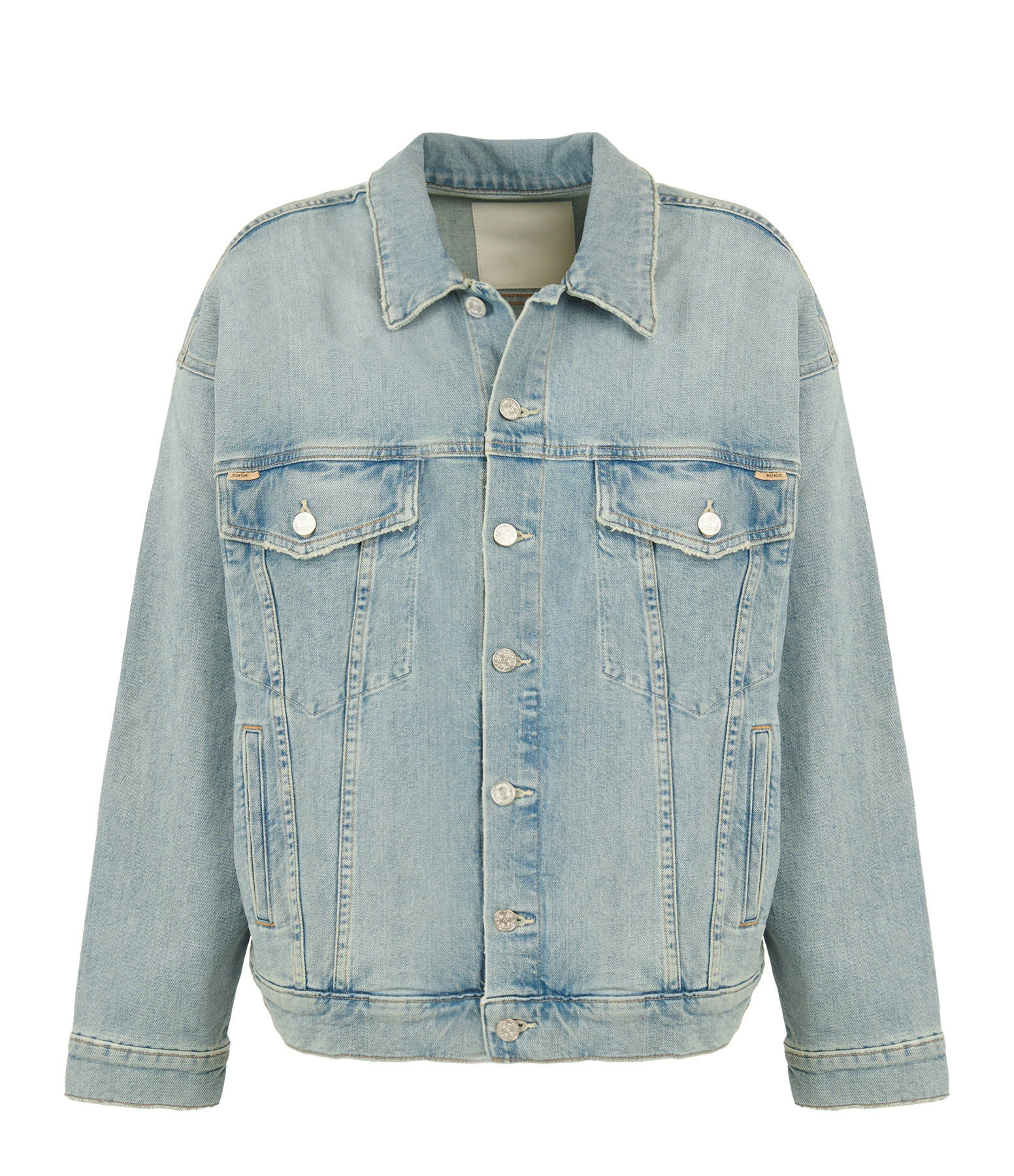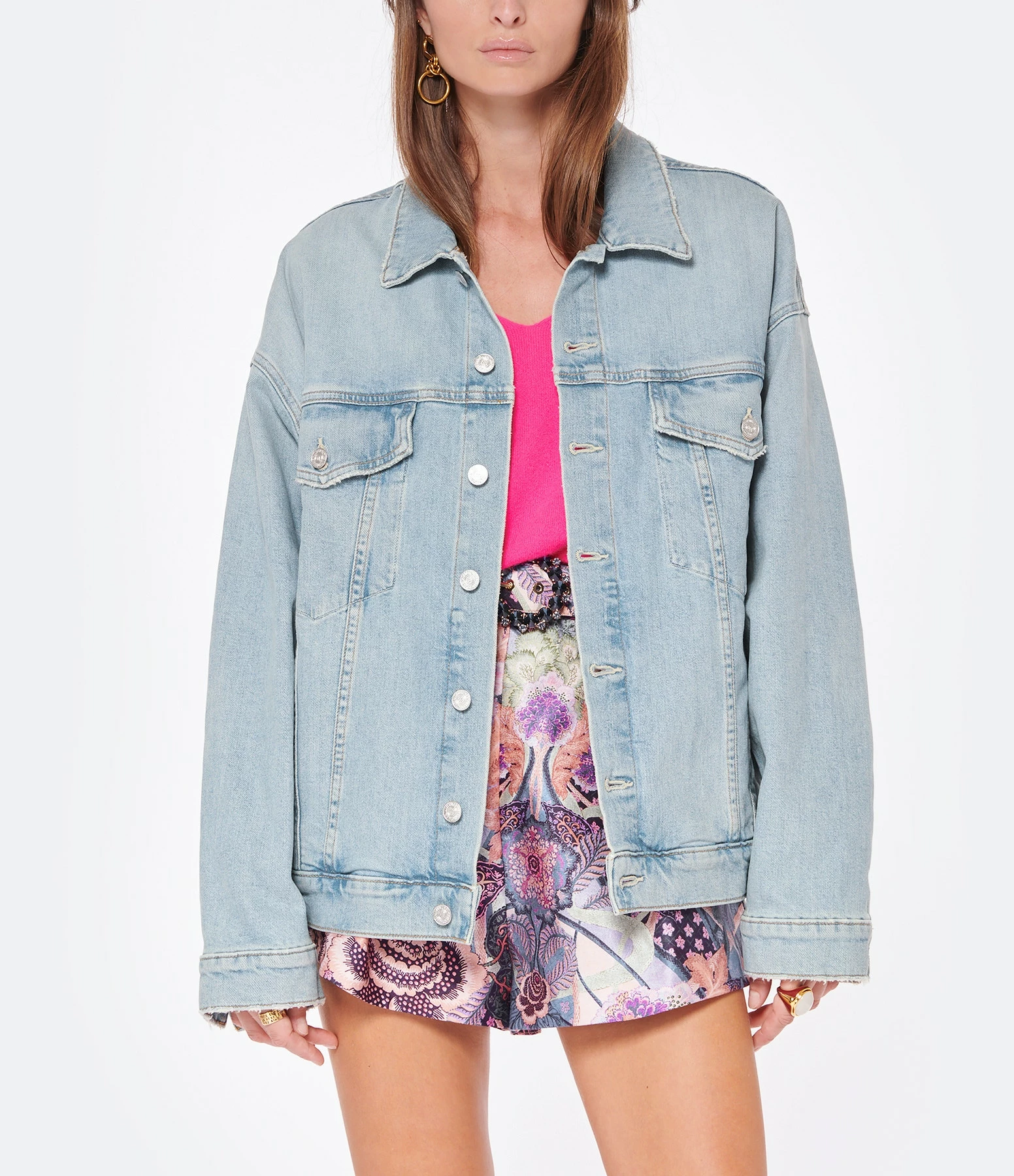 Veste courte en denim de coton mélangé bleu clair délavé. Col chemisier. Manches longues avec fentes et poignets boutonnés. Fermeture boutonnée sur le devant. Deux poches à rabat boutonné et deux poches passepoilées sur le devant. Boutons métalliques argentés. Coupe oversize. Base droite avec pattes de serrage. Détails délavés et vieillis.