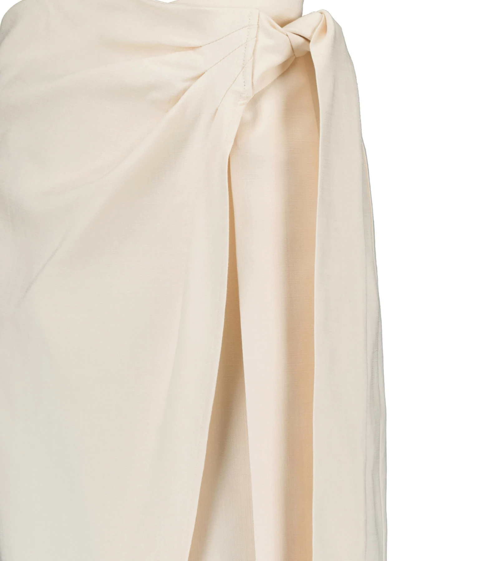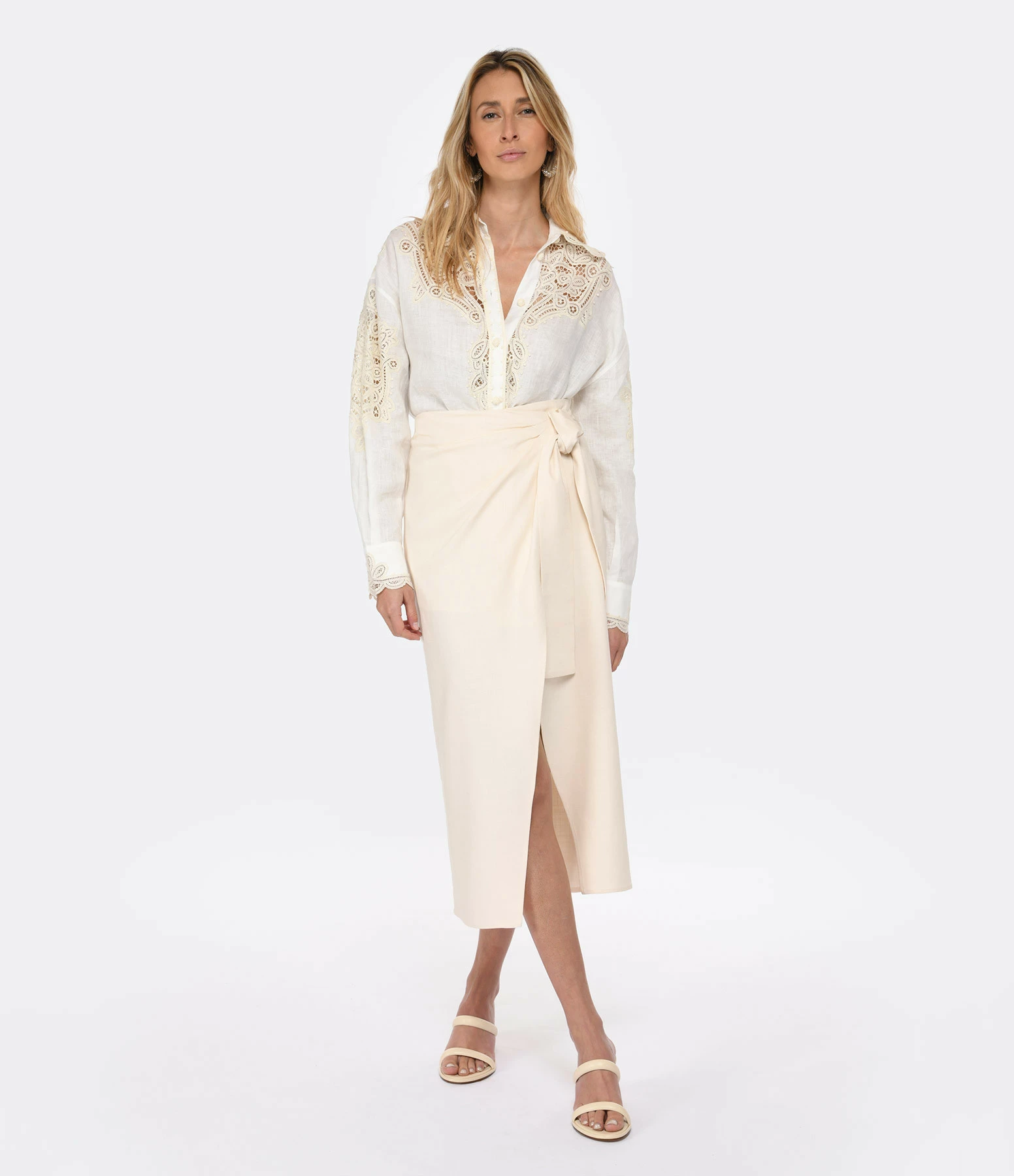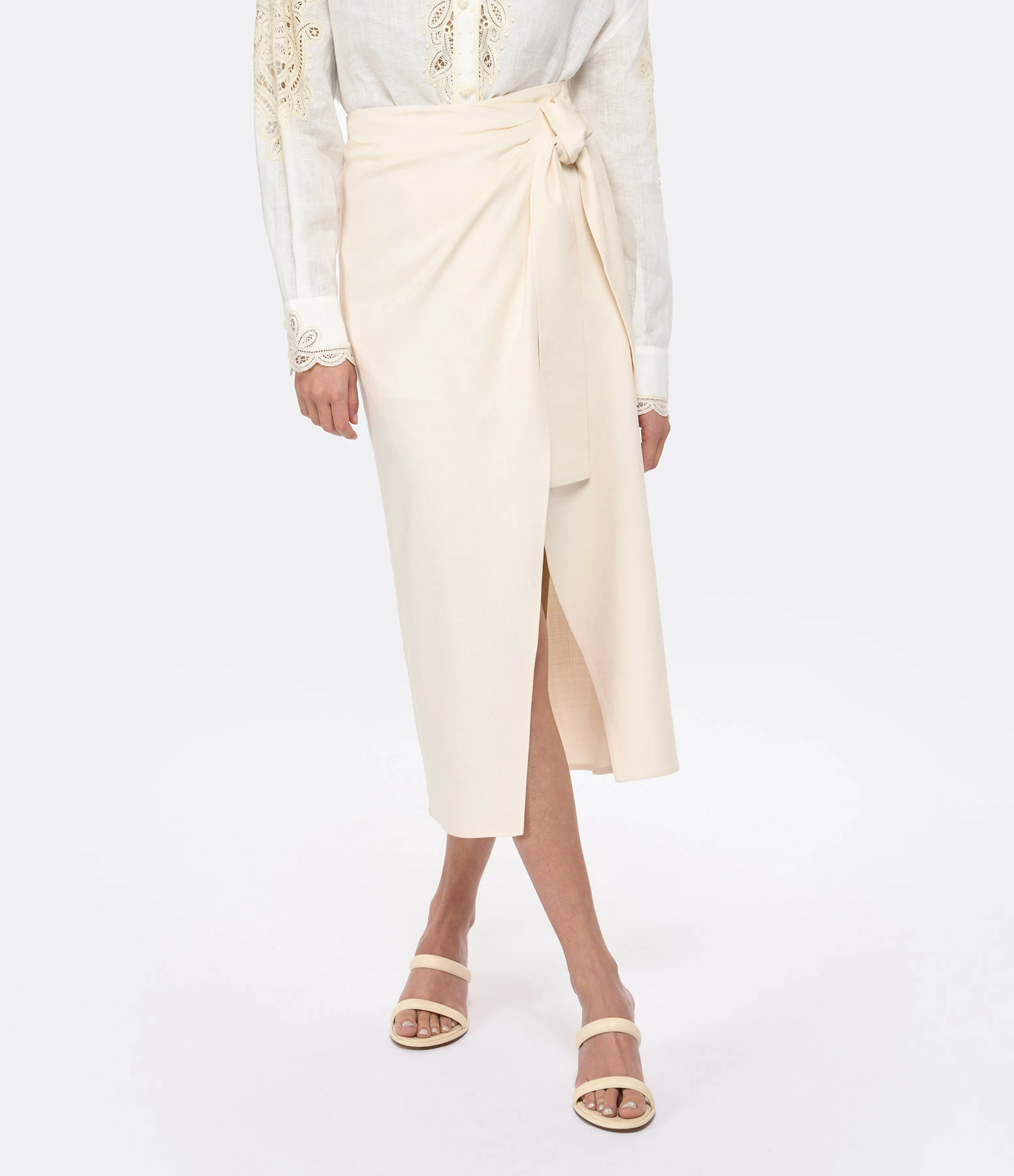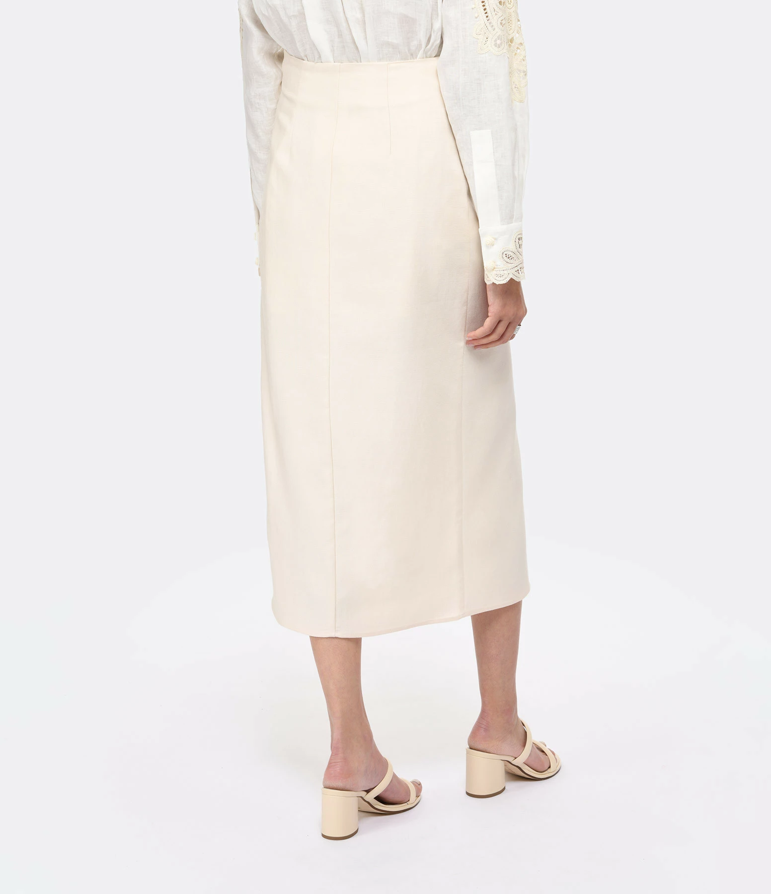Jupe midi crème. Fermeture portefeuille sur le devant par nœud latéral. Coupe crayon. Base droite.