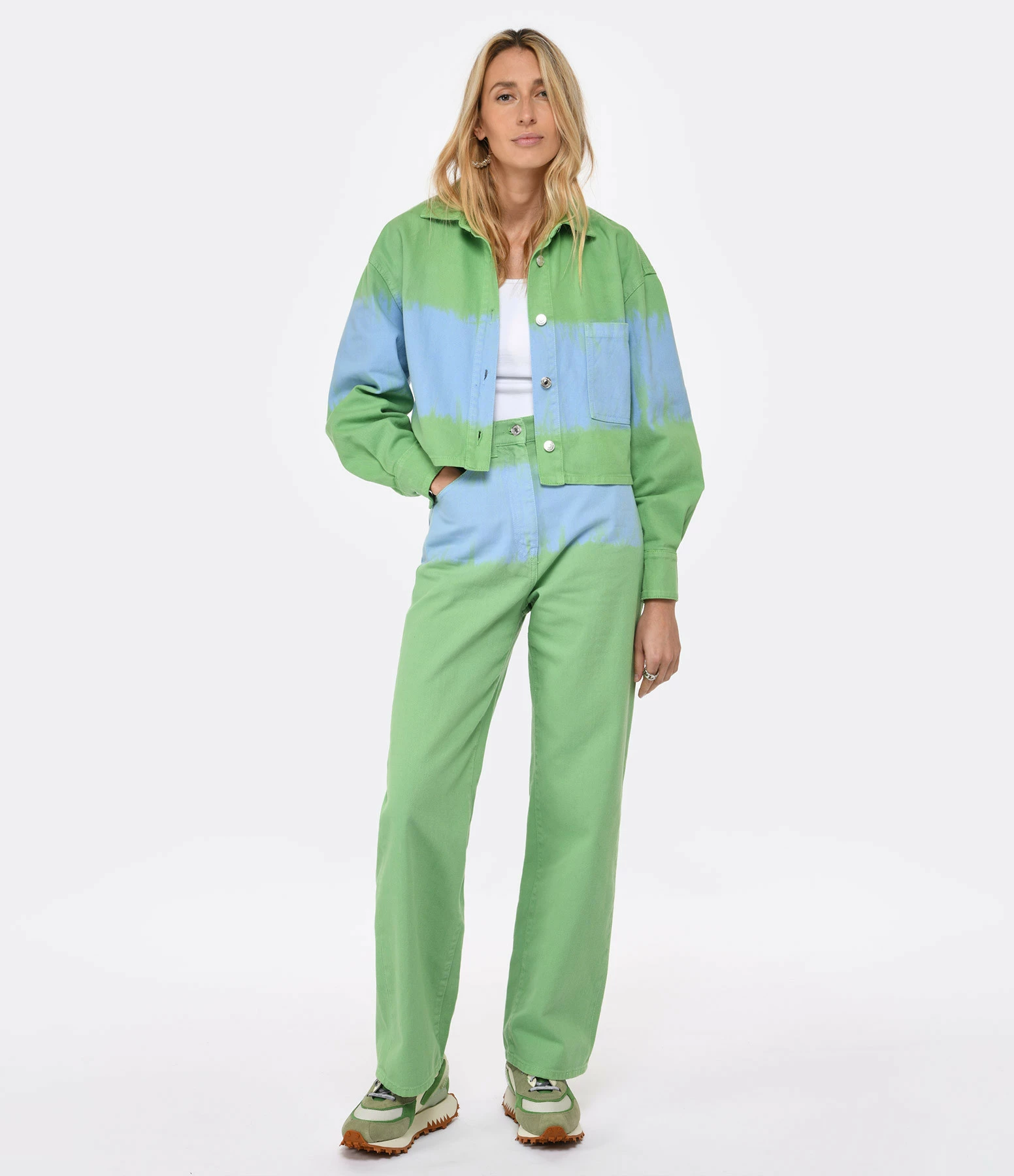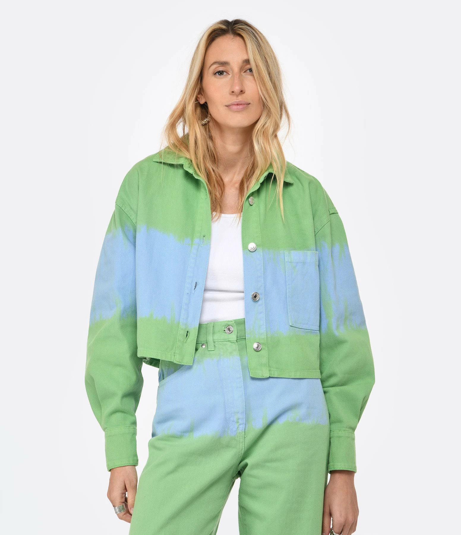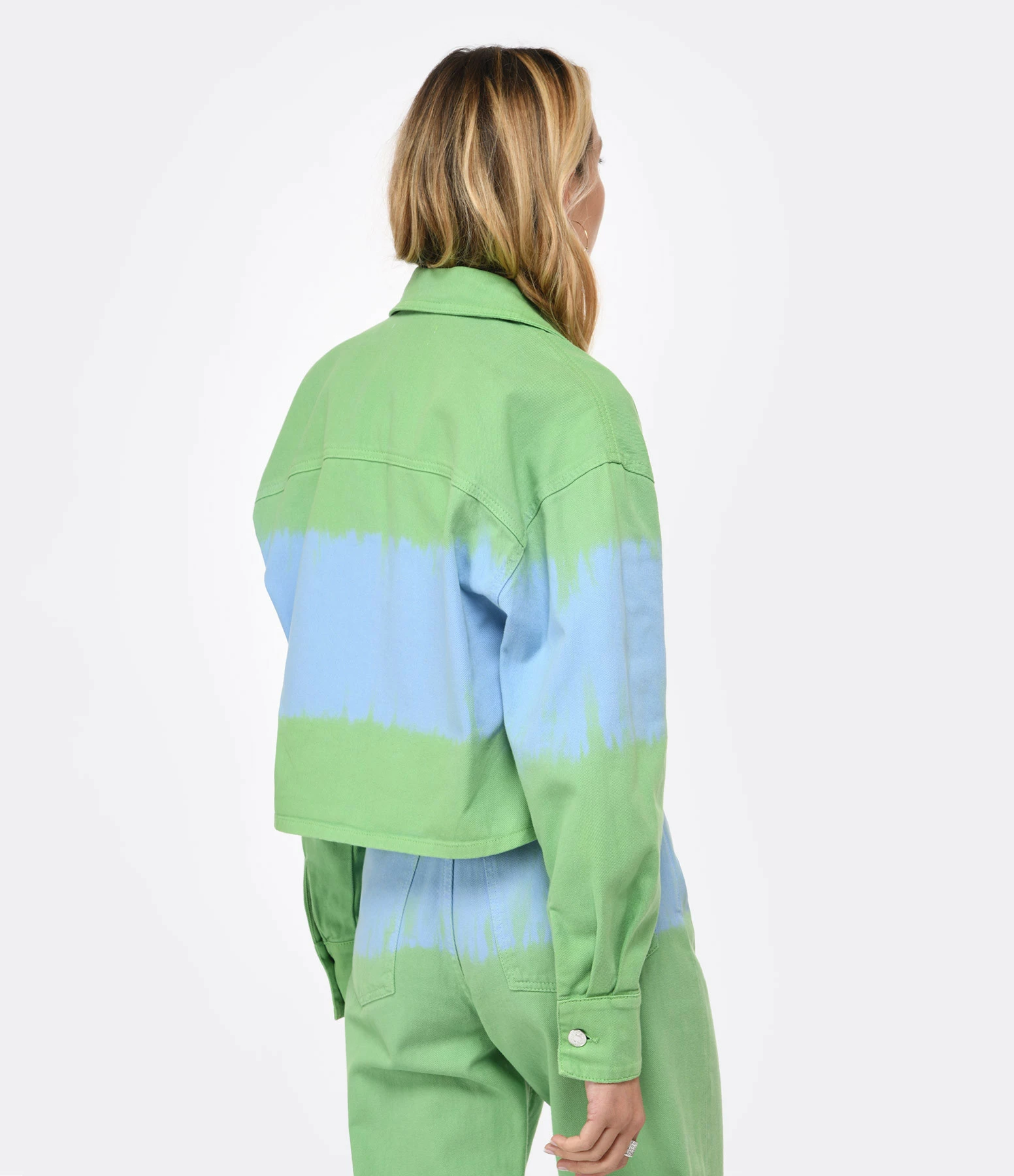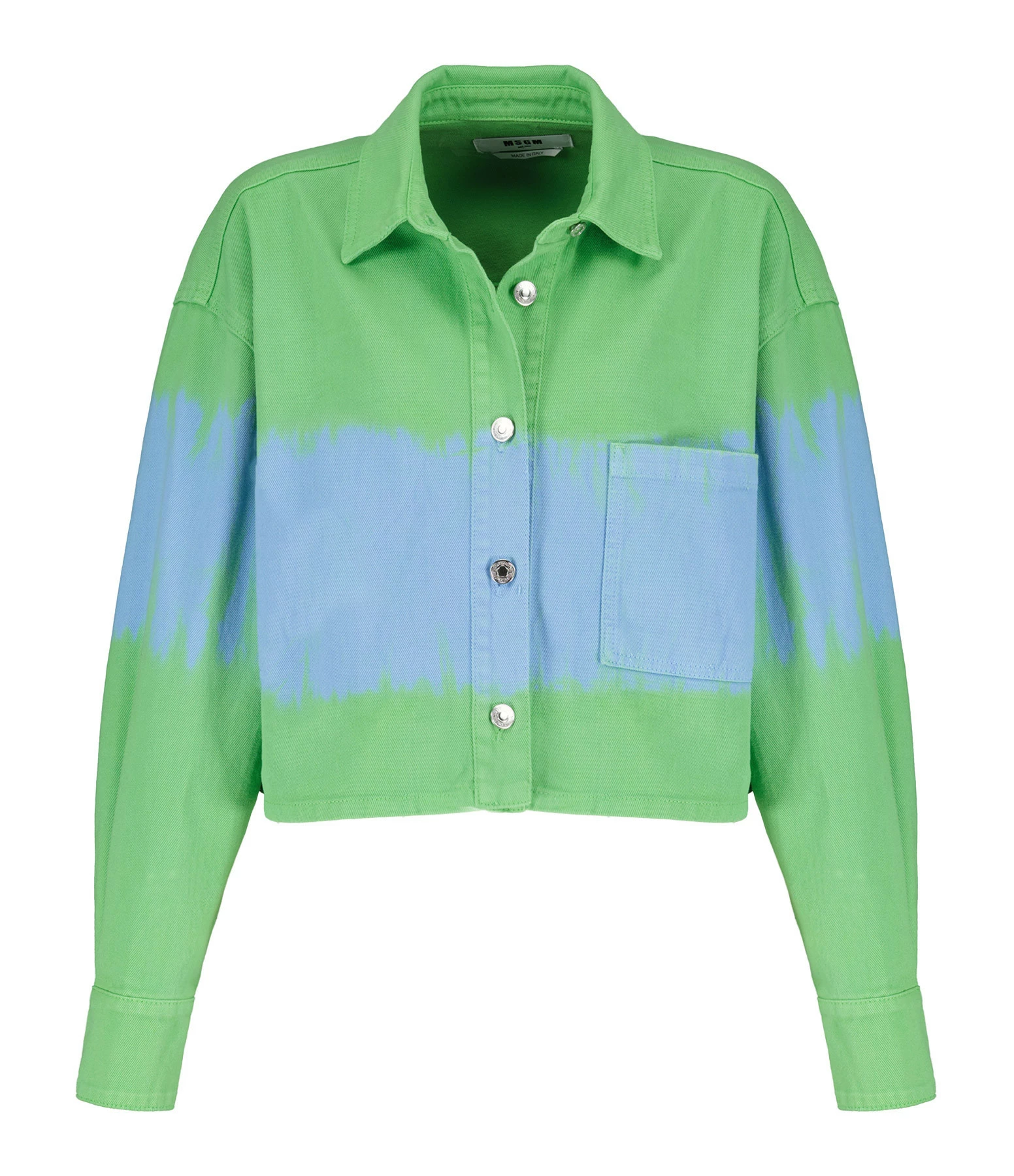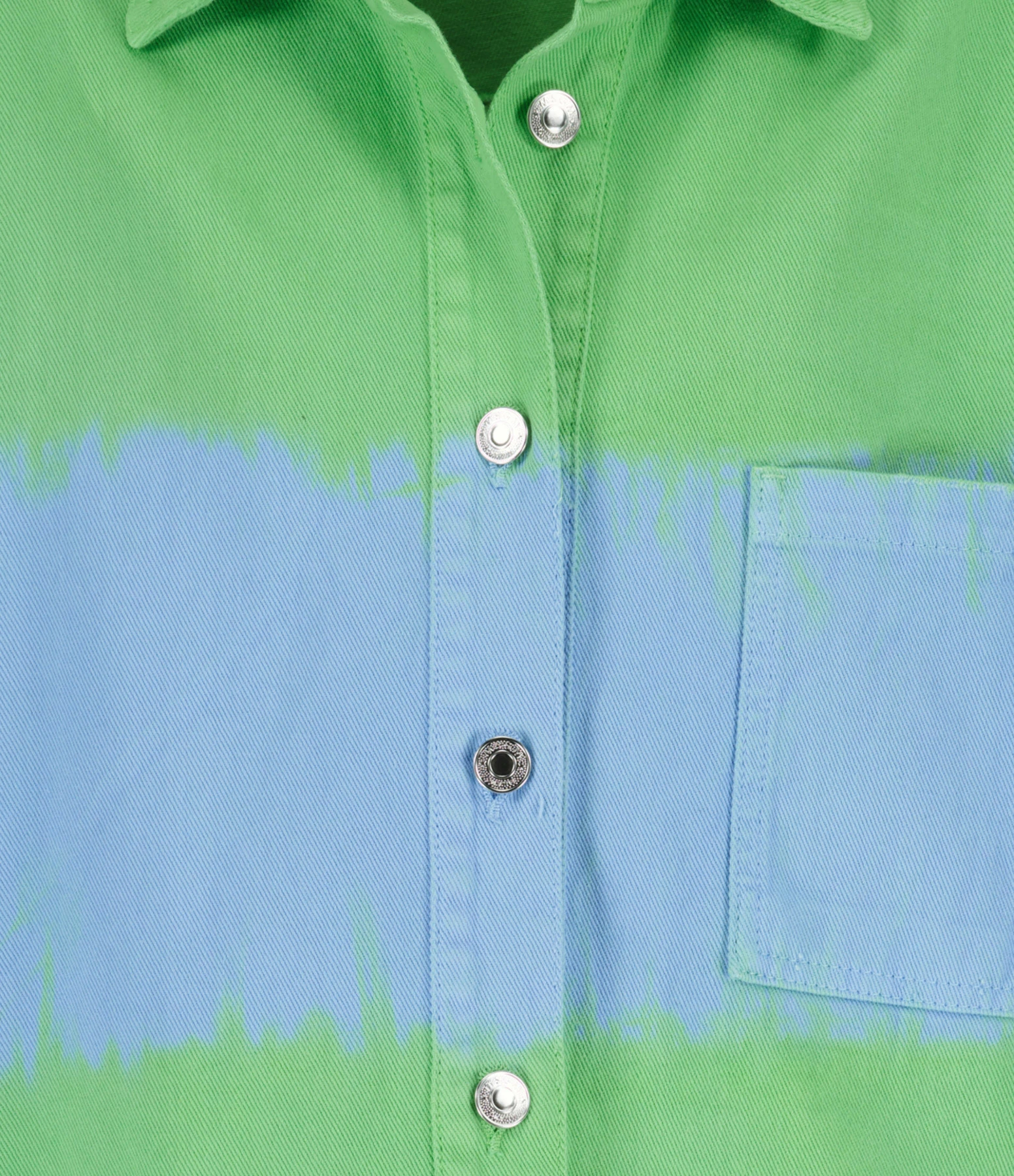 Chemise ou veste courte en denim vert avec bande bleu effet peinture. Col chemisier. Fermeture par boutons métalliques argentés. Manches longues. Une poche plaquée. Coupe droite. Base droite.