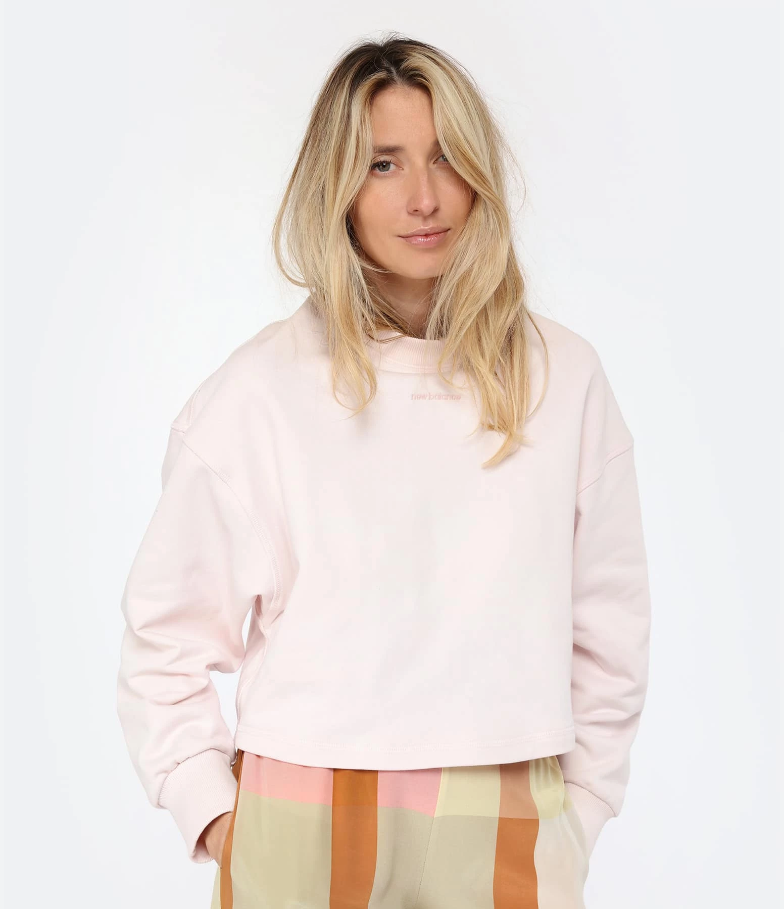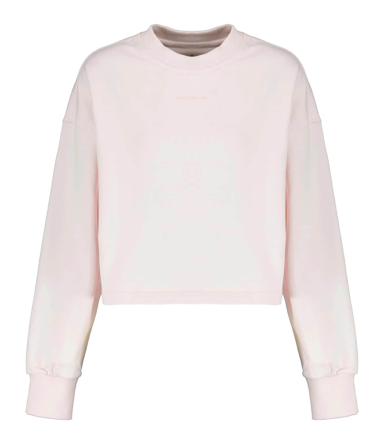 Sweatshirt en coton rose. Logo au centre de la poitrine. Manches longues. Col ras du cou. Coupe courte. Base droite.