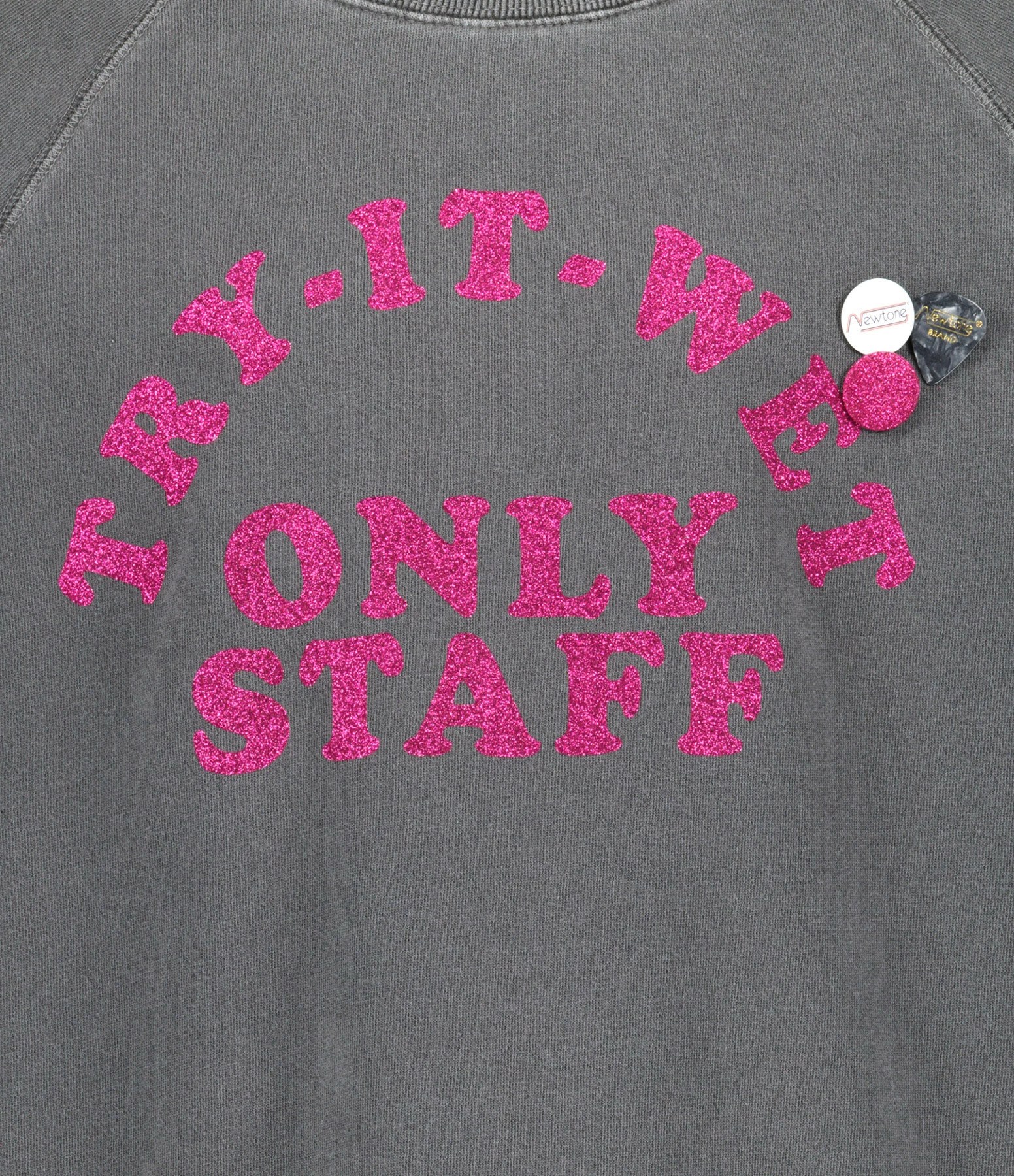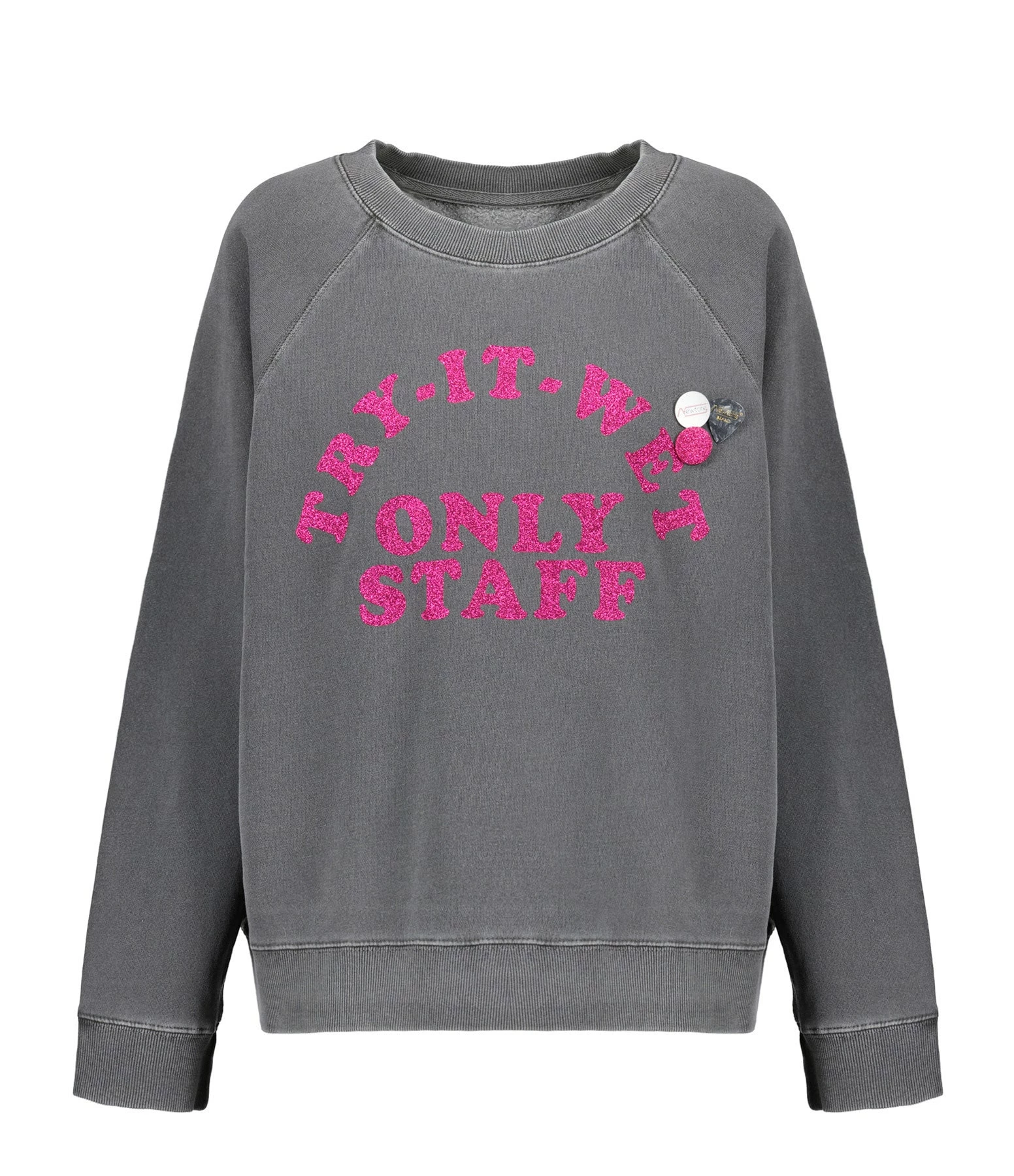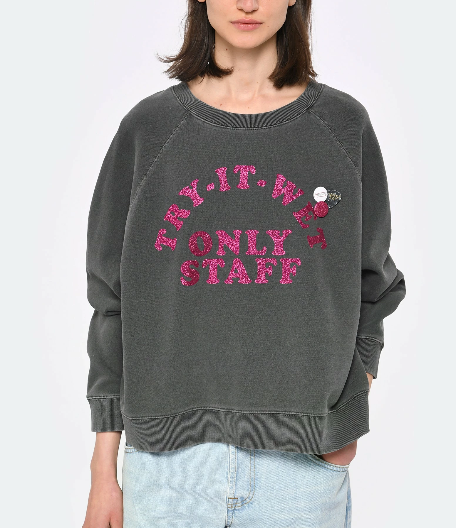 Sweatshirt gris foncé avec inscription à paillettes roses sur le devant. Trois badges côté cœur. Col rond côtelé. Manches longues avec poignets côtelés. Coupe droite. Base droite côtelée.