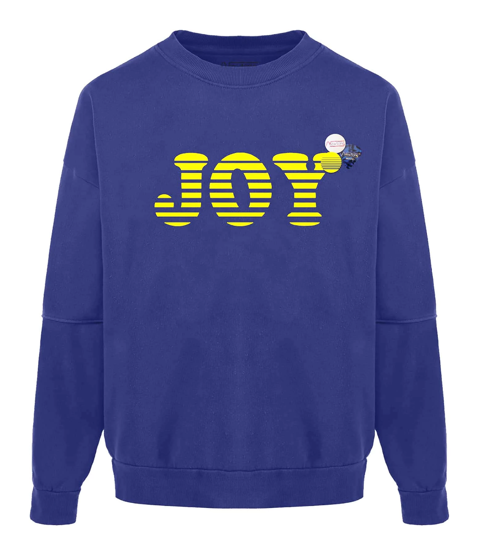 Sweatshirt en coton mélangé molletonné bleu. Flockage velours de l’inscription “Joy” en jaune sur le devant. Deux badges et un médiator. Col rond côtelé. Manches longues avec poignets côtelés. Coupe droite. Base droite côtelée
