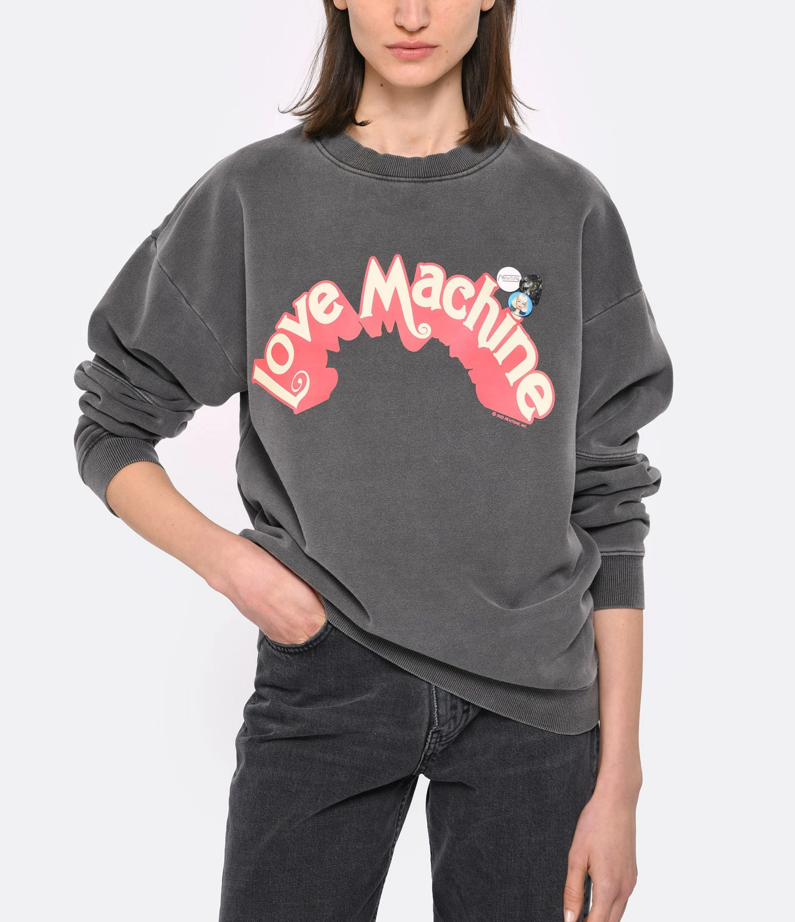Sweatshirt gris foncé avec inscription sérigraphiée en rouge sur le devant. Trois badges côté cœur. Col rond côtelé. Manches longues avec poignets côtelés. Coupe droite. Base droite côtelée.