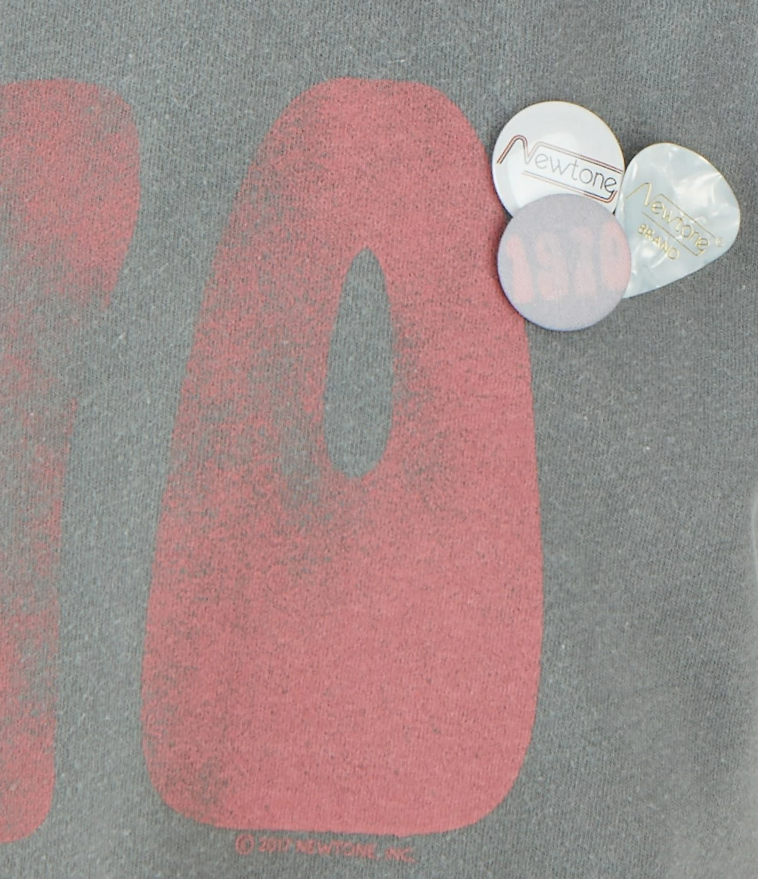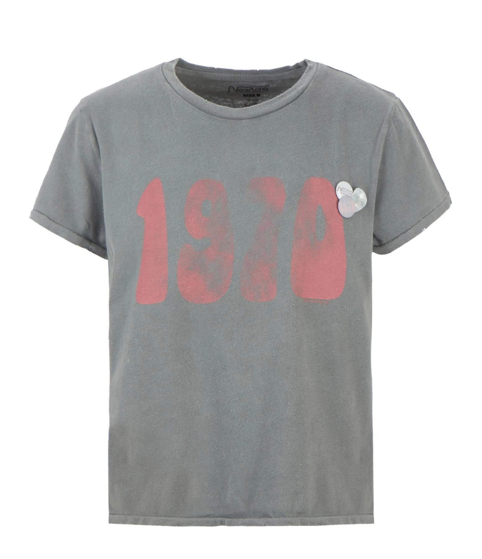 Tee-shirt en coton gris sérigraphié “1970” rose. Trois badges côté cœur. Manches courtes. Col rond. Base droite.