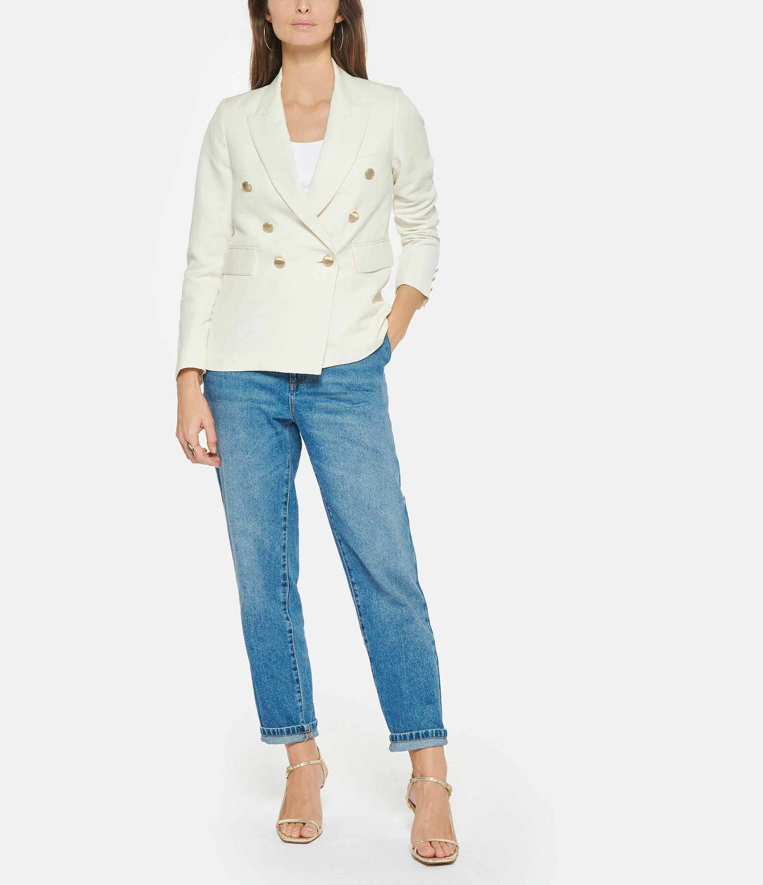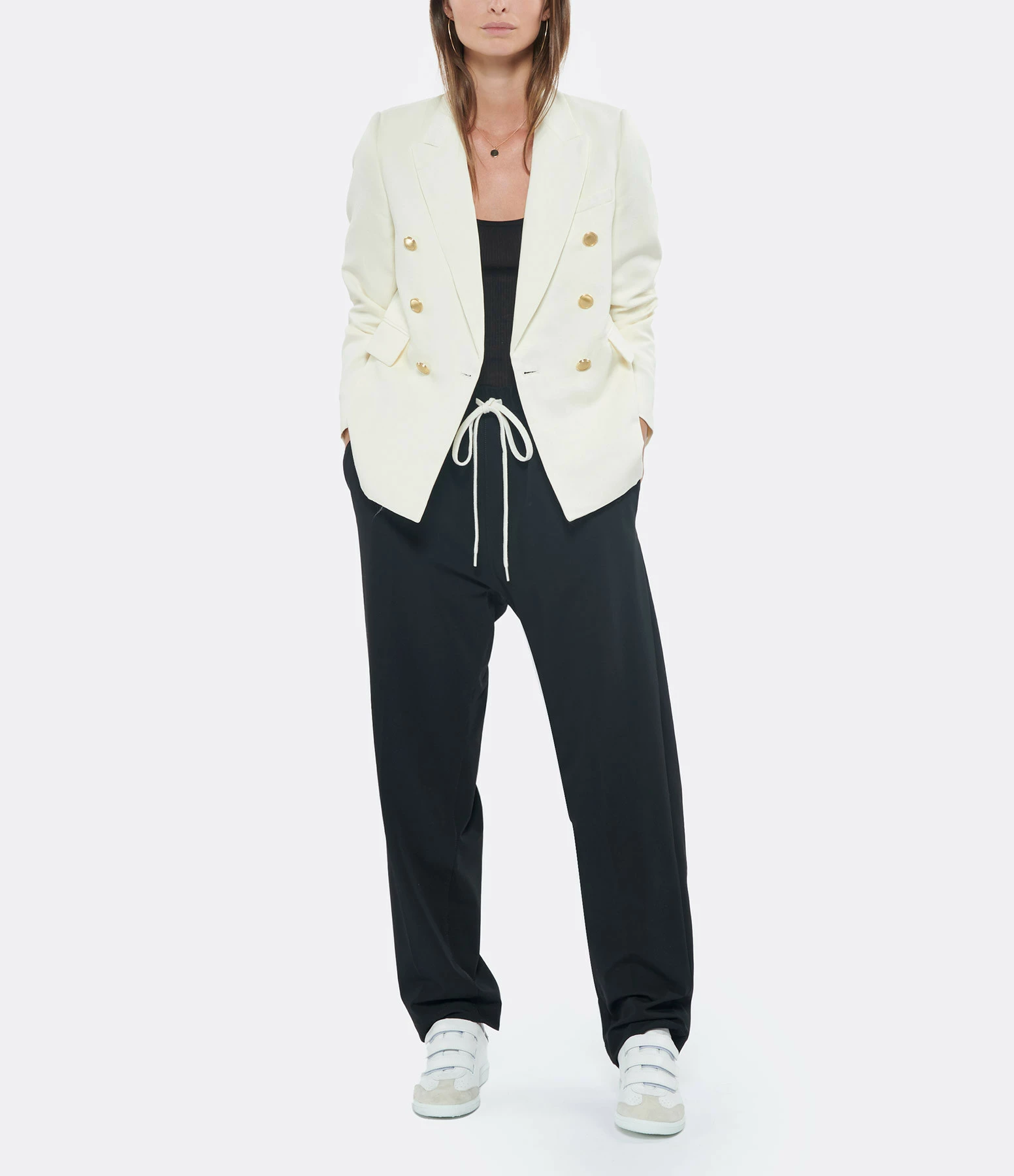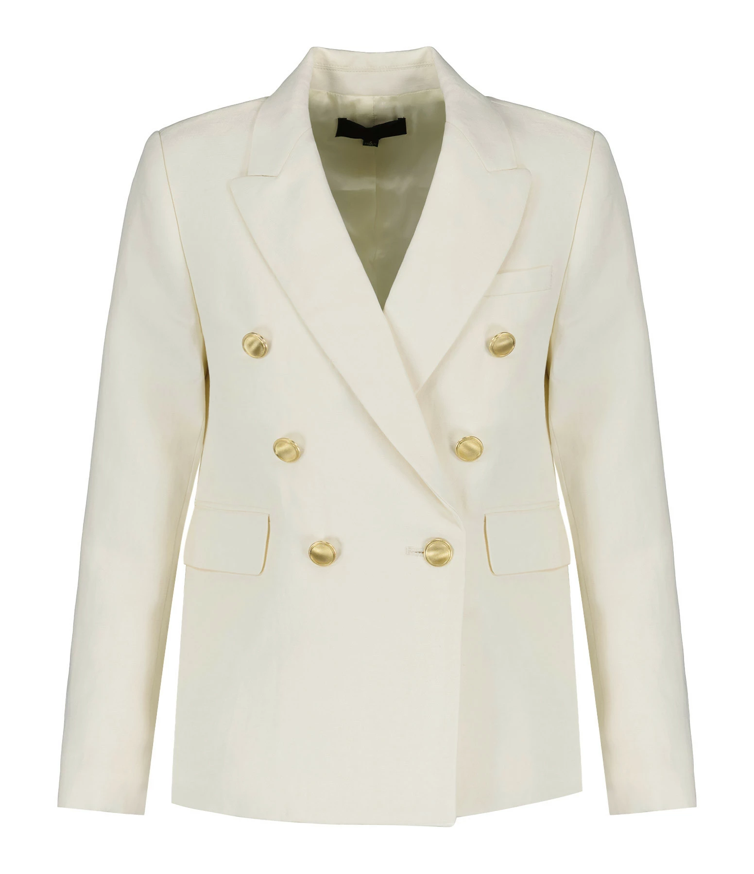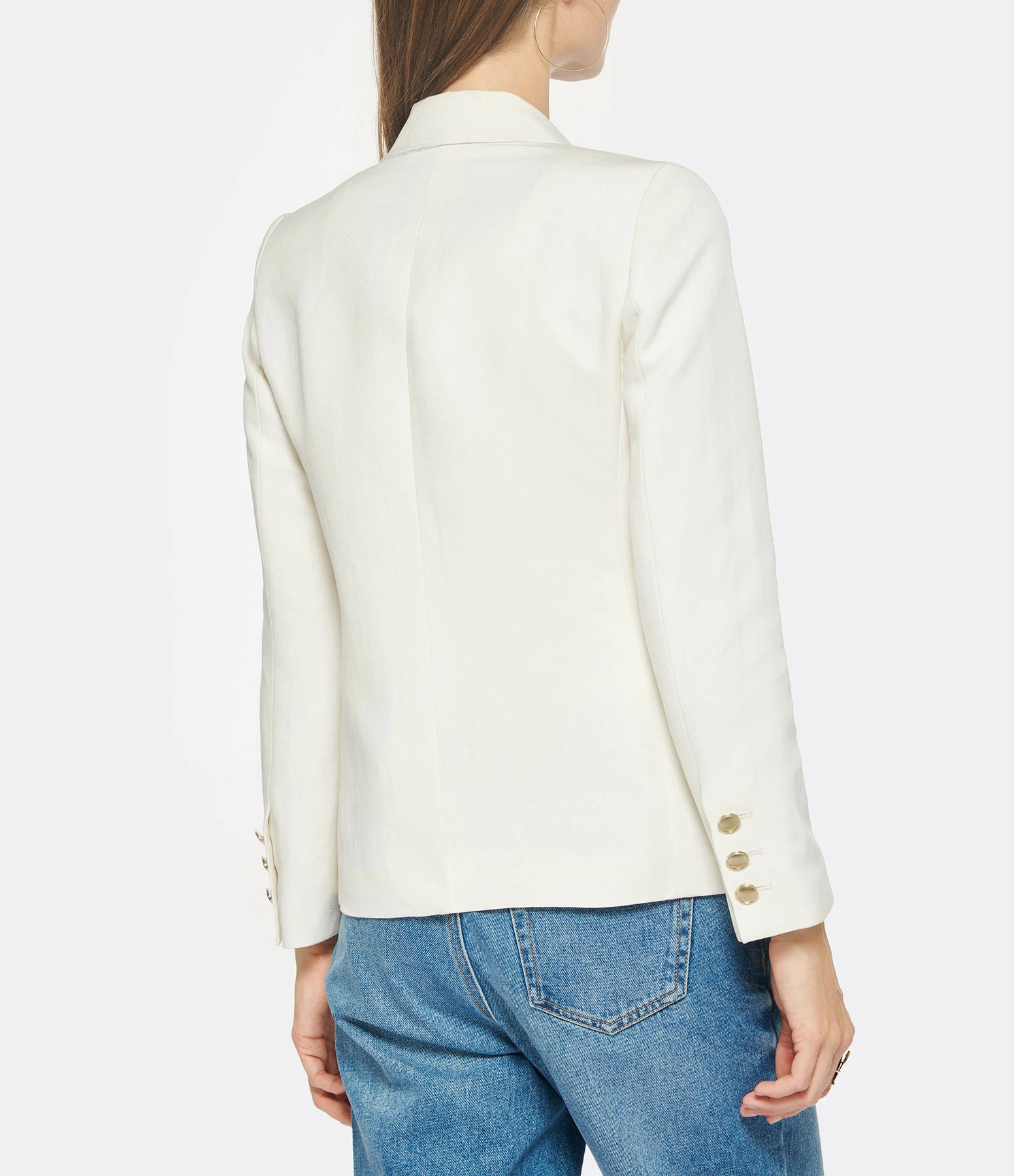 Veste blazer en lin et soie blanc ivoire. Col tailleur. Manches longues tailleur avec fentes boutonnées. Fermeture par patte de boutonnage à double bouton. Boutons dorés. Deux fausses poches à rabat et une fausse poche passepoilée sur le devant. Une fausse poche passepoilée à l’intérieur. Coupe cintrée. Base droite. Doublée.