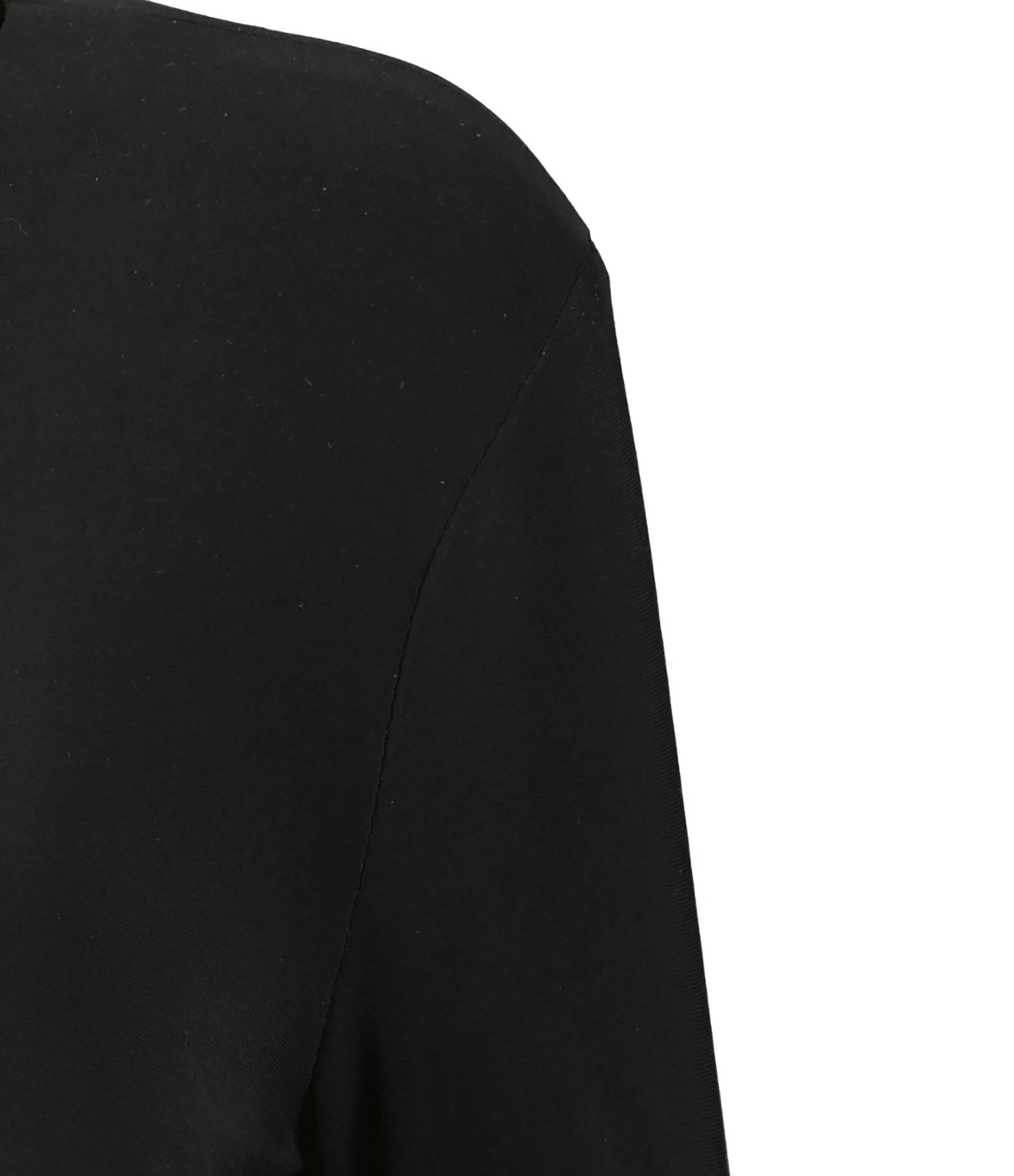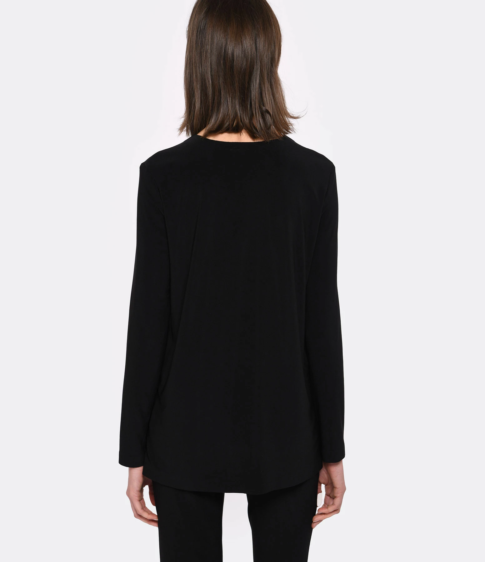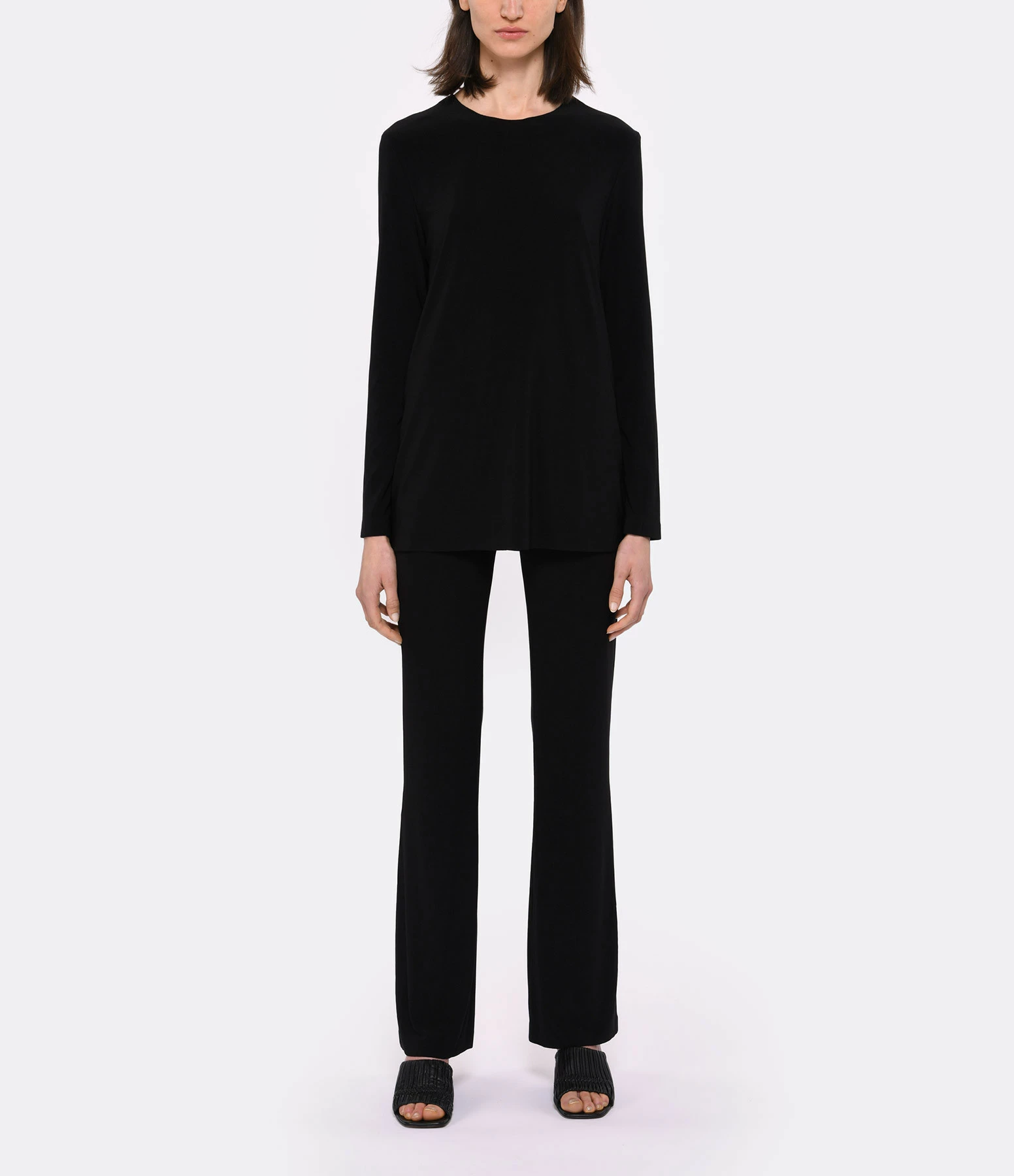 Top en tissu stretch noir à manches longues. Col rond. Coupe droite. Base droite. Non doublé.