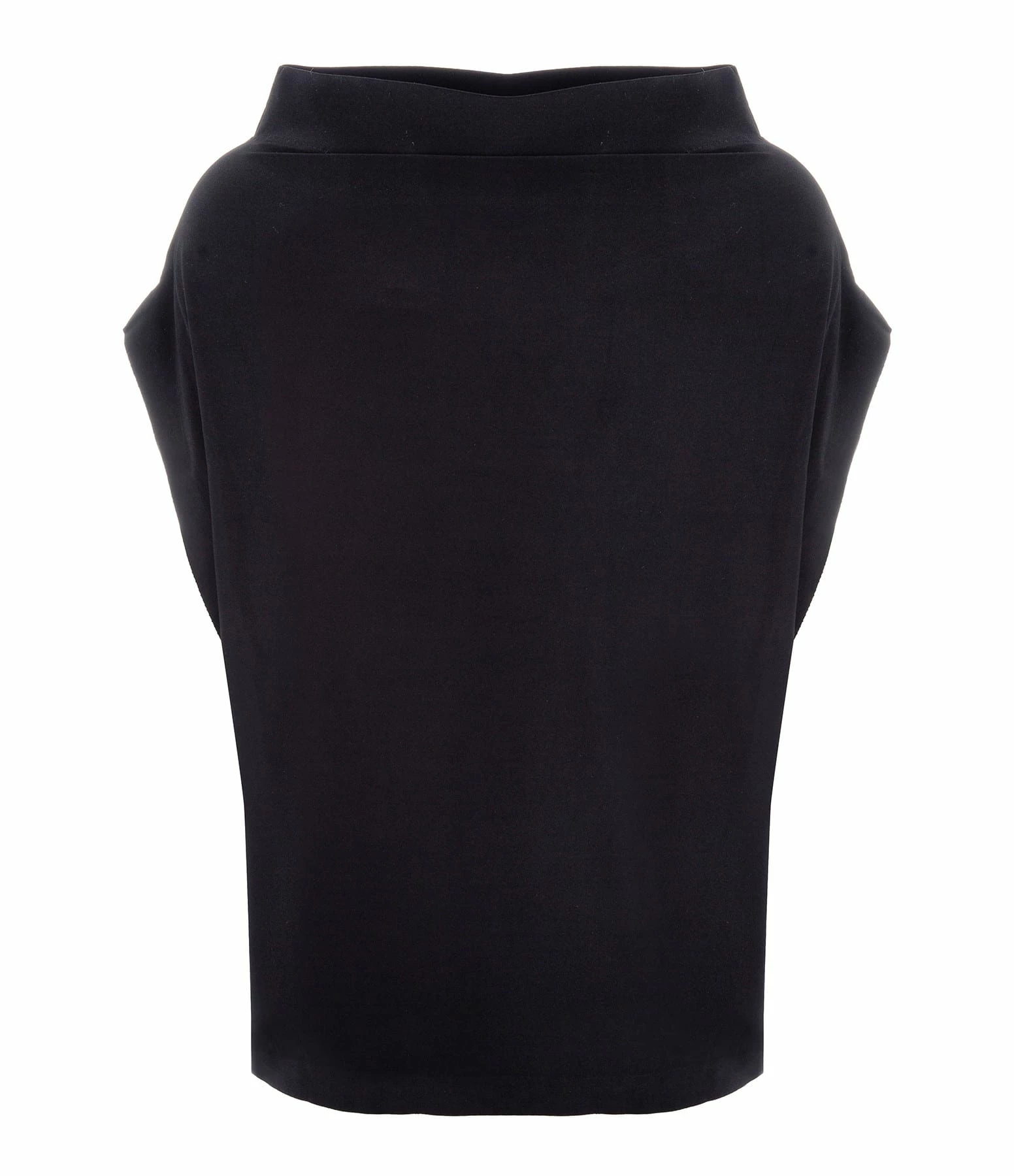 Top noir à manches élastiquées courtes chauve-souris. Col montant arrondi. Coupe ample. Base cintrée élastiquée.