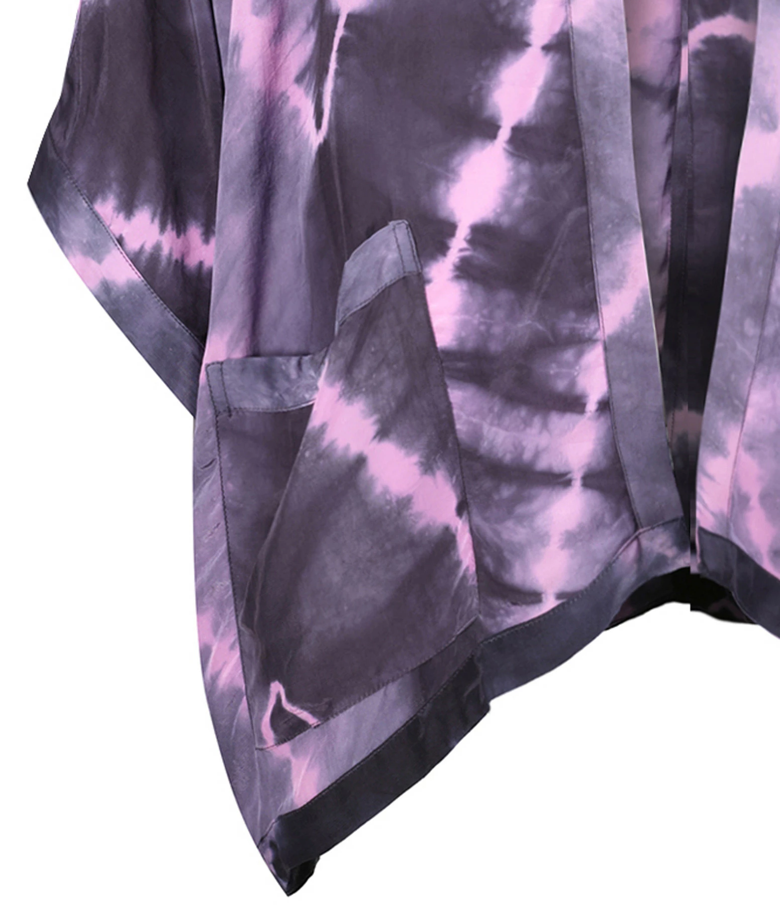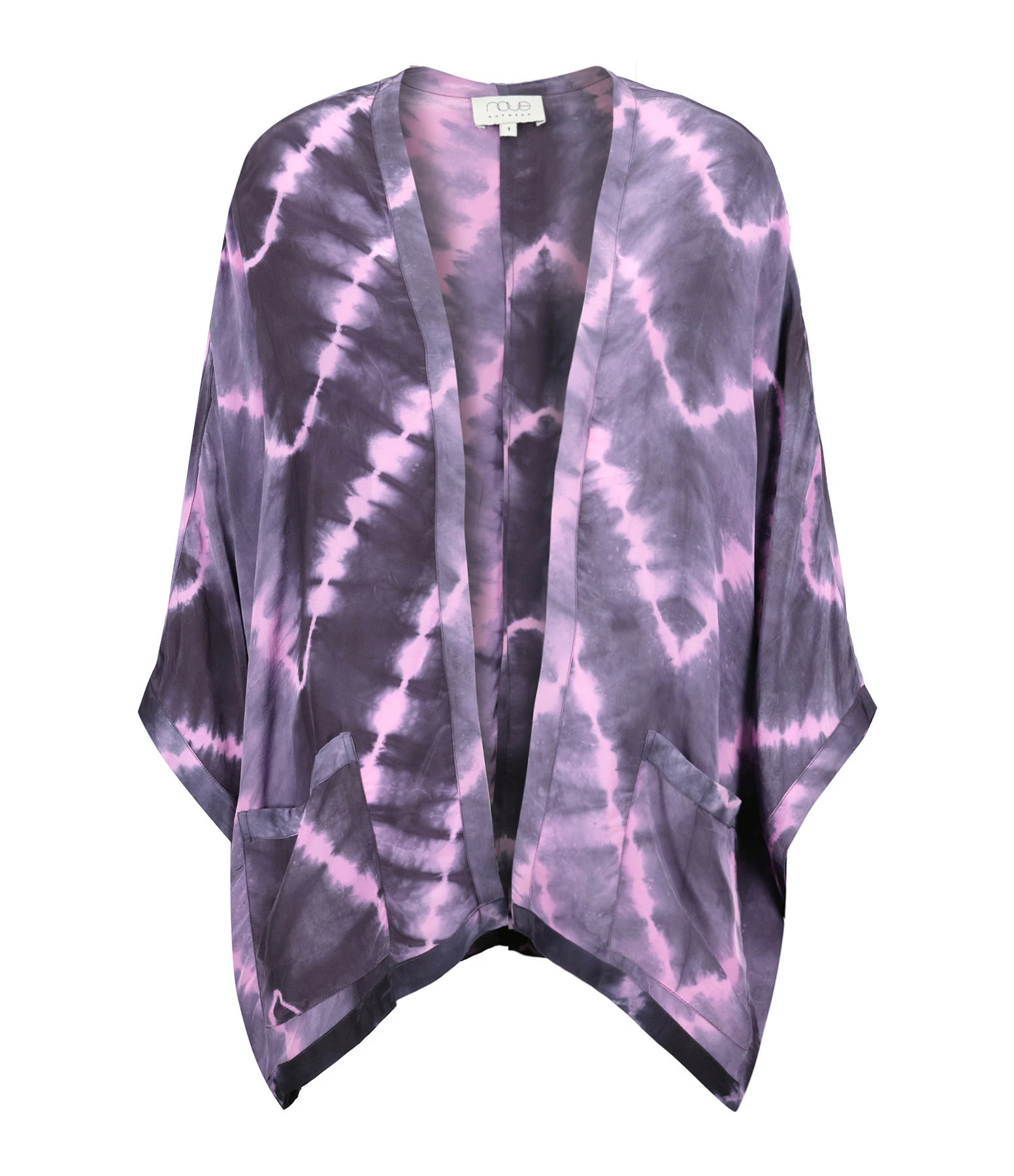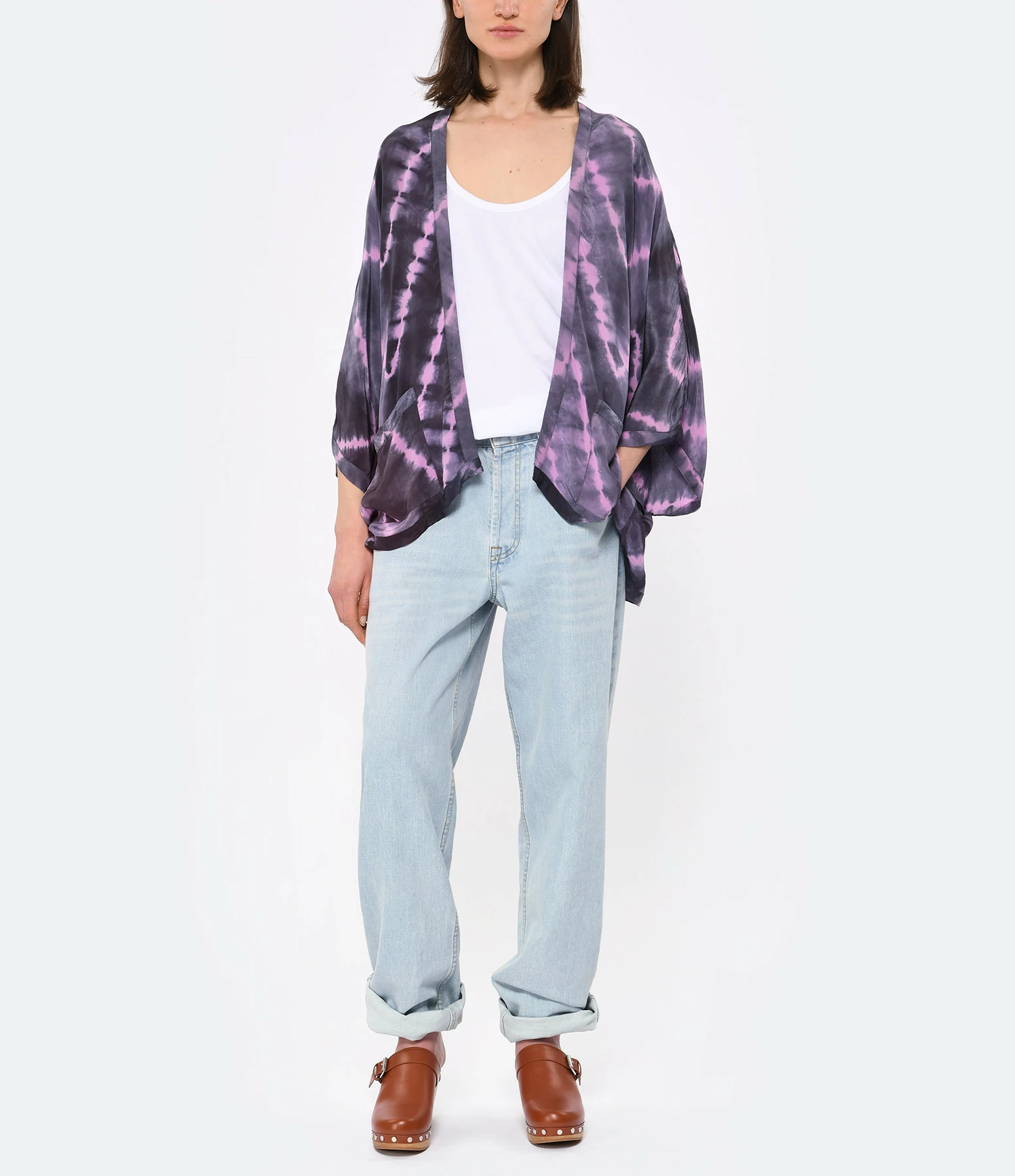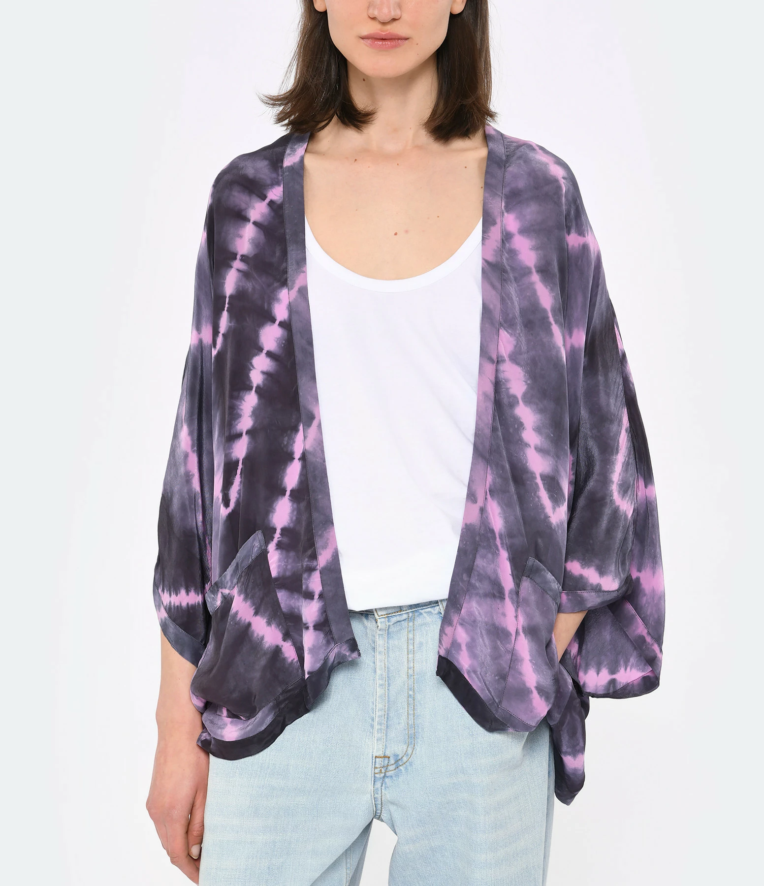 Kimono à imprimé tie and dye dans des tons violets. Encolure ouverte. Manches courtes amples. Deux poches plaquées. Coupe ample. Base droite. Non doublé.