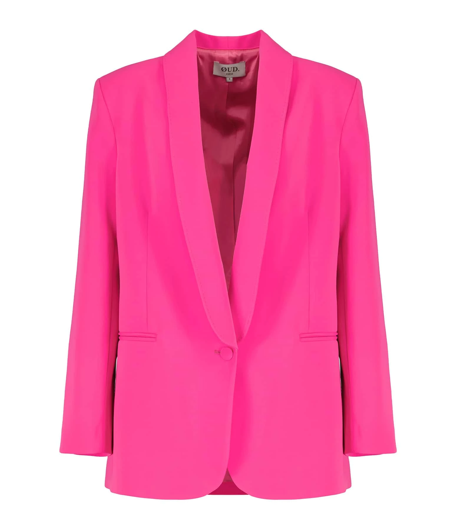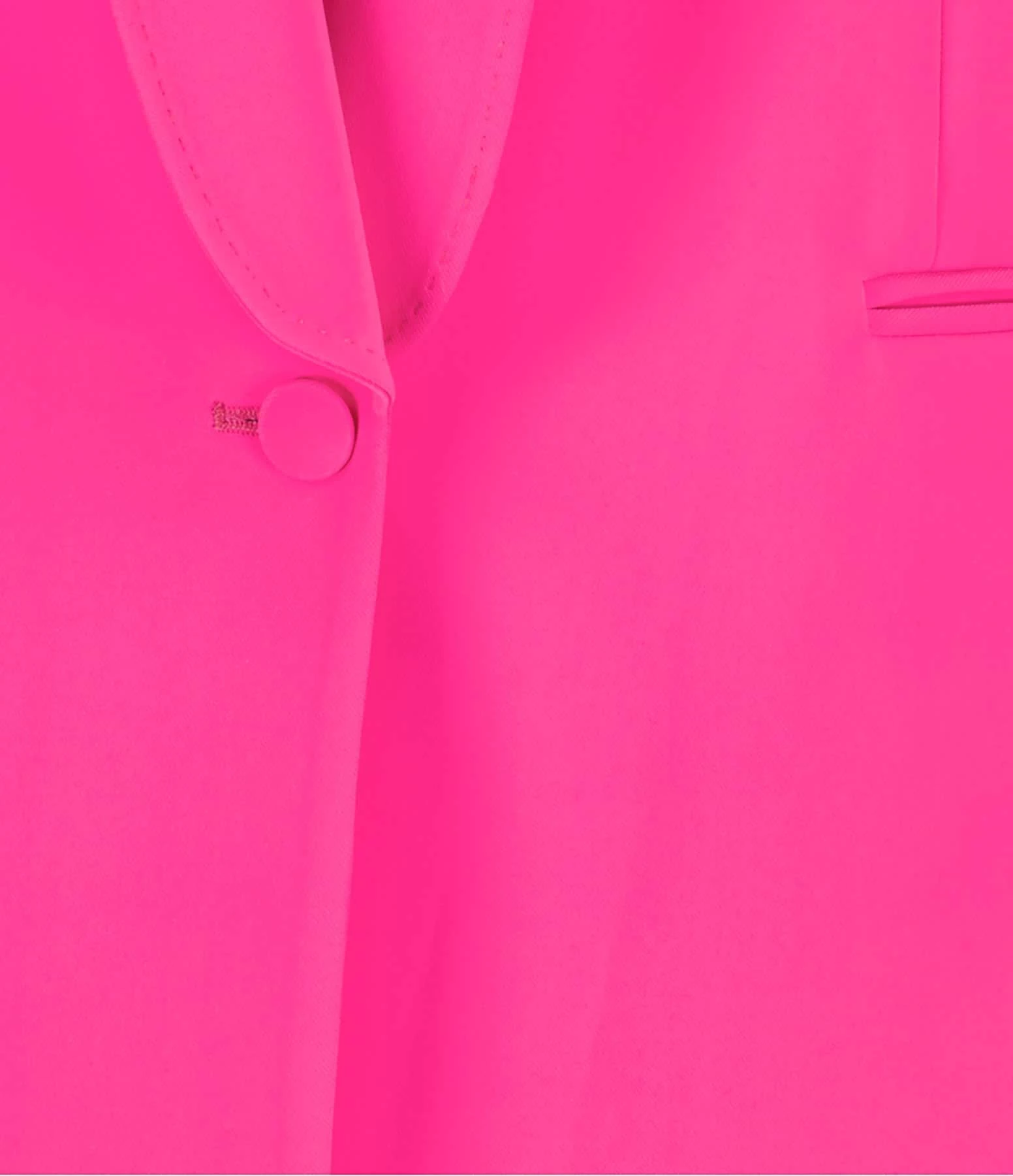 Veste de blazer rose. Col à rabat. Manches longues. Fermeture par bouton. Deux poches passepoilées sur l’avant . Fente à l’arrière. Manches boutonnées. Matière fluide. Doublée. Coupe droite. Base droite.