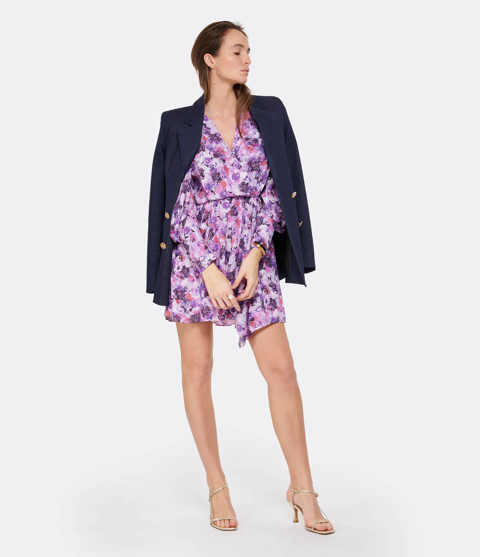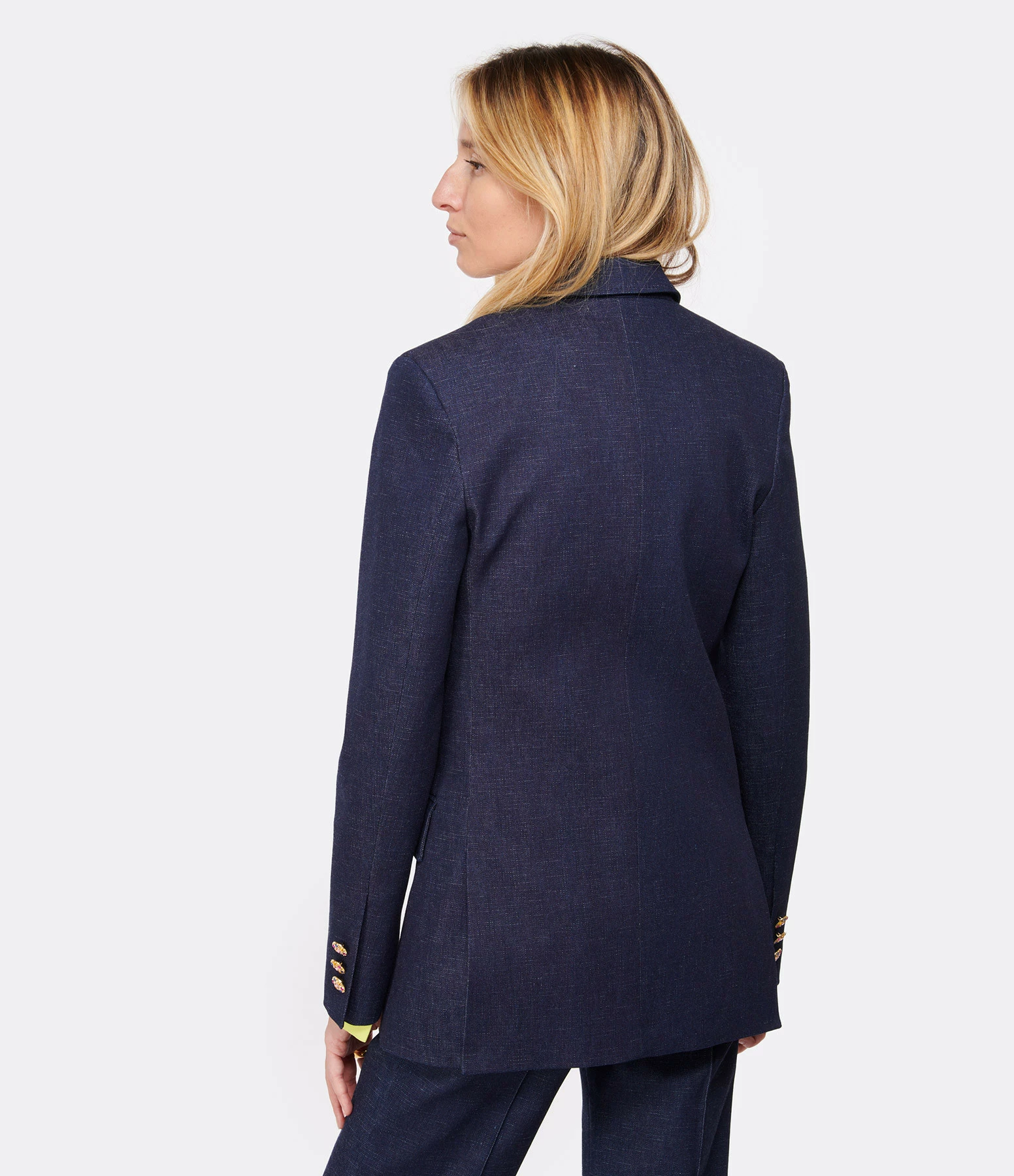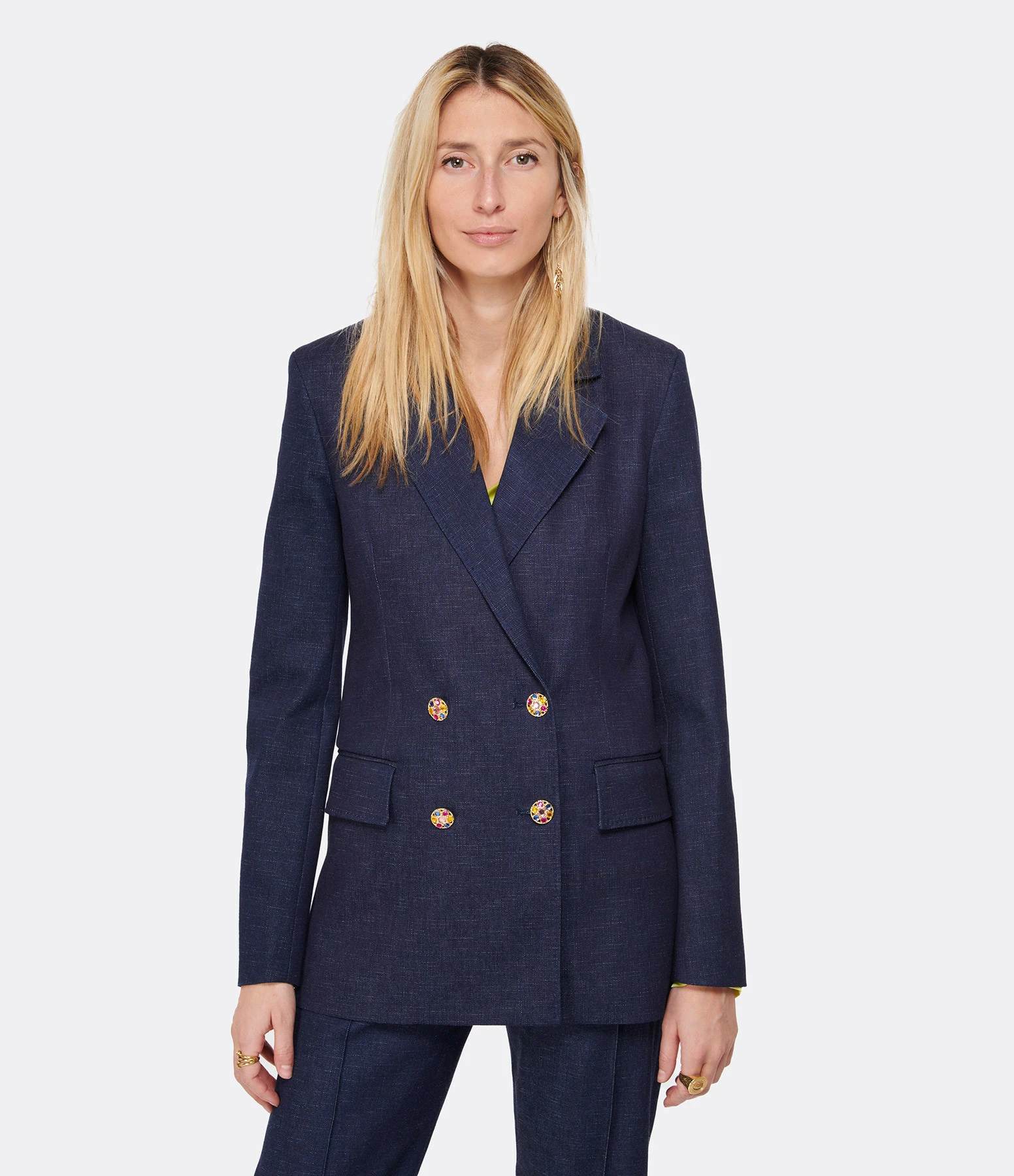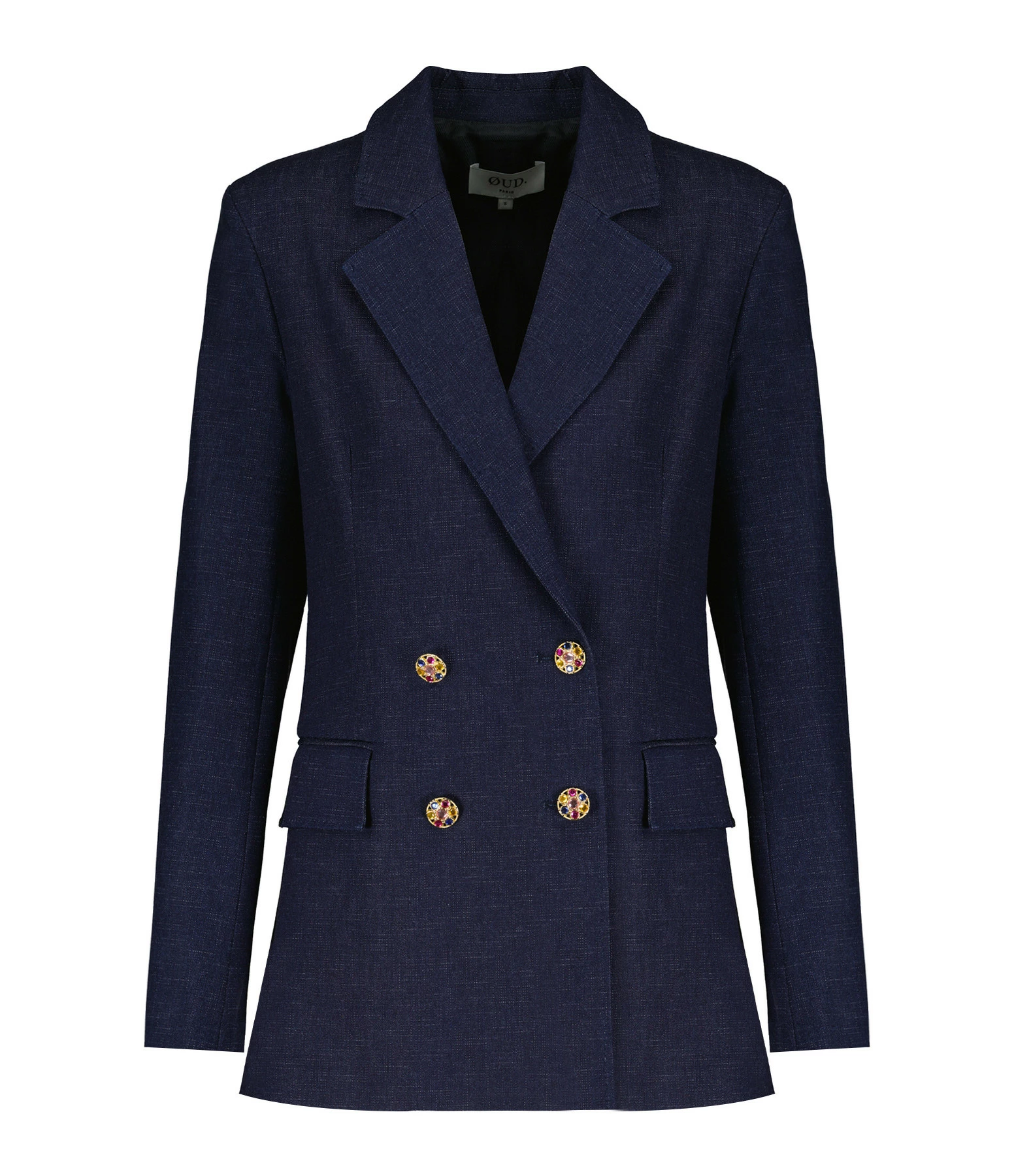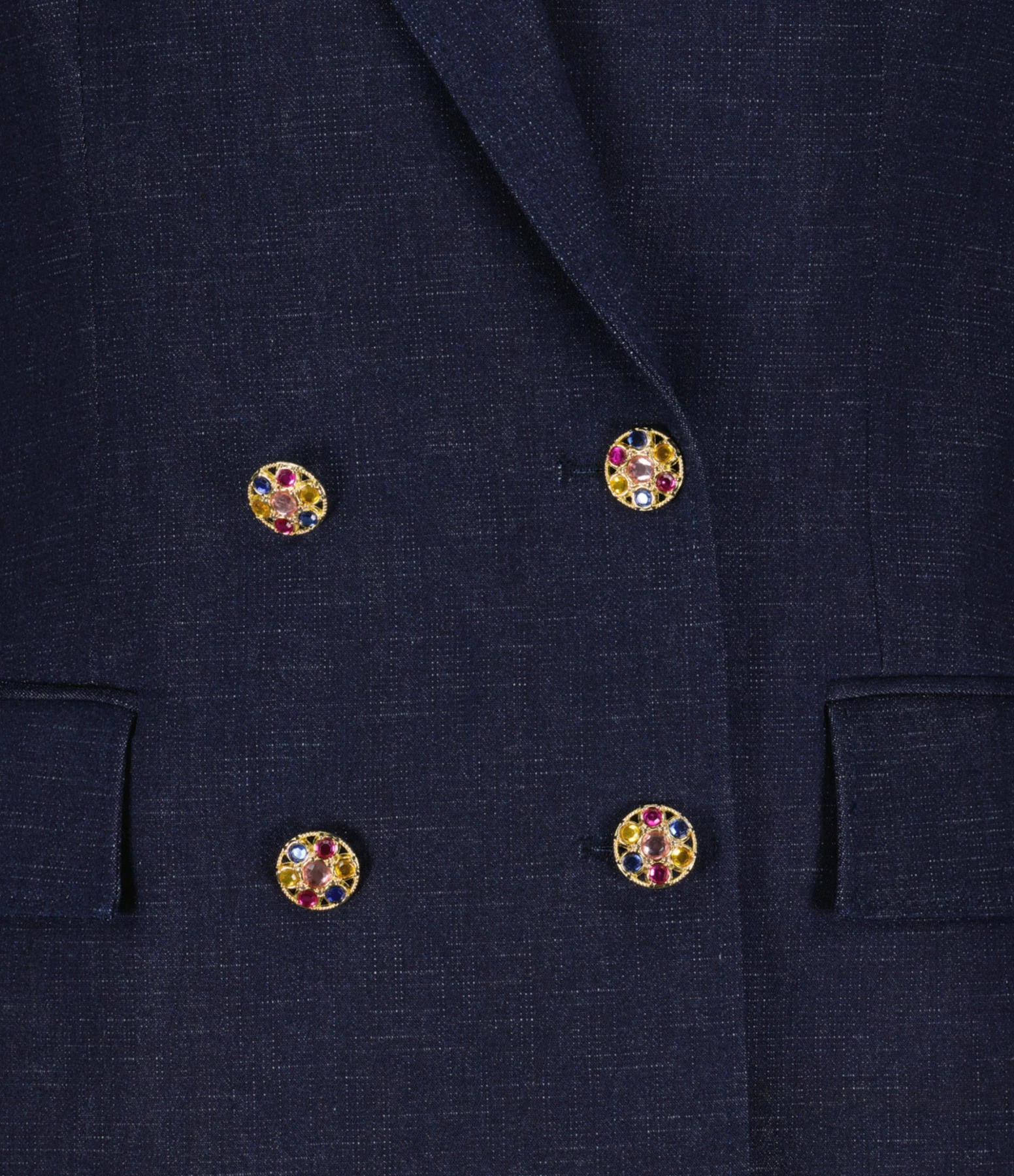 Veste blazer en coton bleu marine. Fermeture par boutons effet diamants colorés sur le devant et au niveau des poignets. Deux poches à rabats sur le devant. Manches longues. Col tailleur. Coupe droite. Base droite.