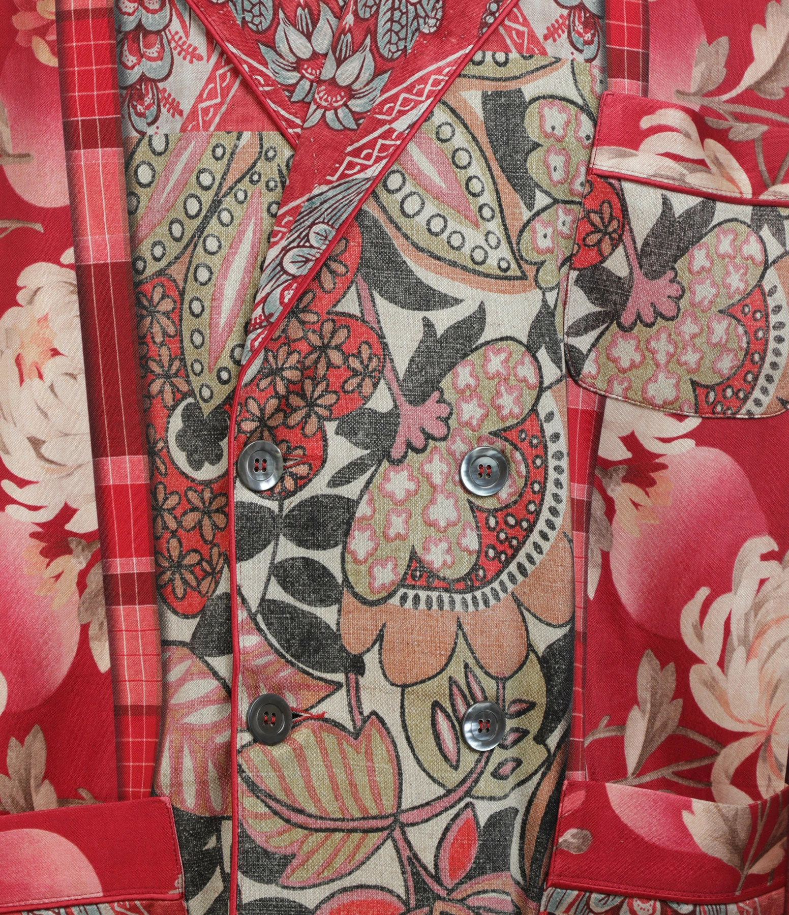 Veste en soie imprimée. Col à rabat. Manches longues. Fermeture boutonnée. Trois poches plaquées. Coupe droite. Base droite.